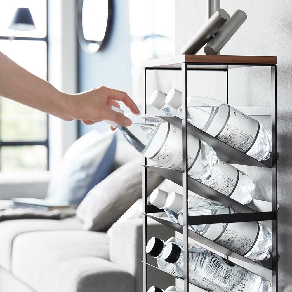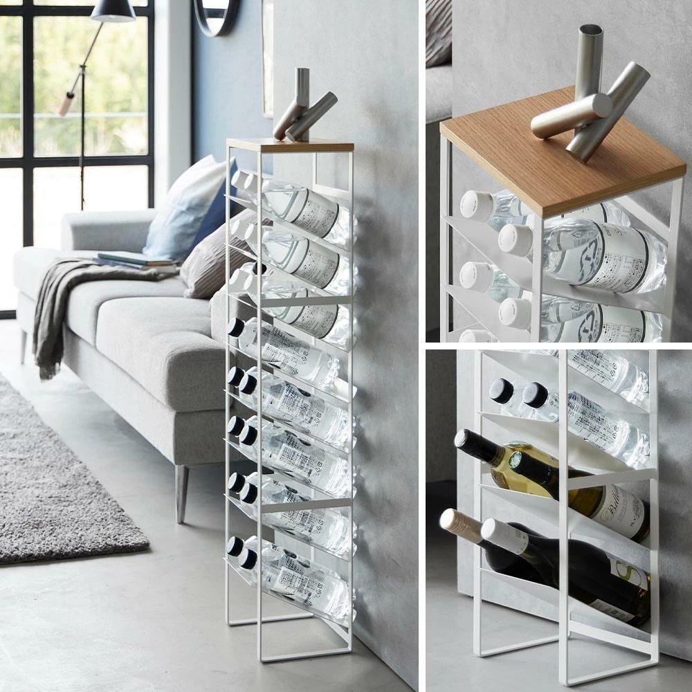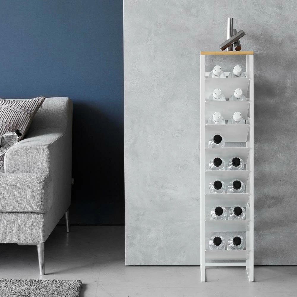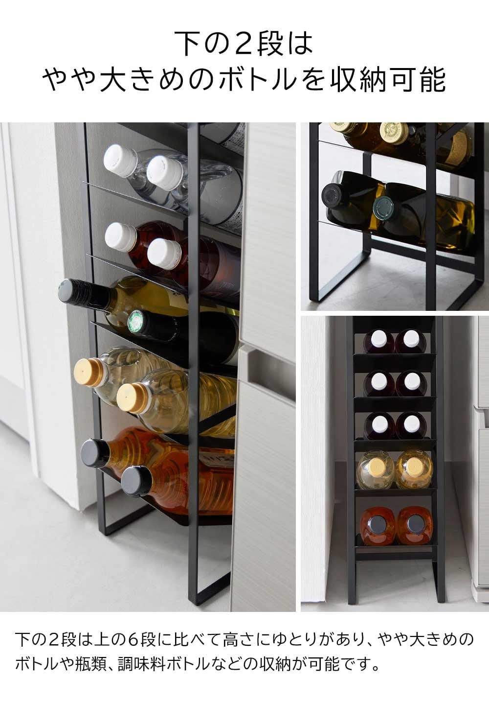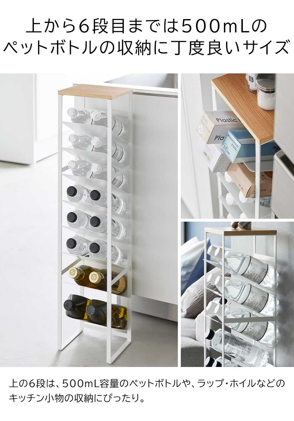 毎日飲むペットボトル飲料やお酒などを、すぐに手に取れる場所にスタイリッシュに収納できる、8段のボトルストッカーです。 縦長のとてもスリムなストッカーなので、冷蔵庫と壁の間や、リビングやパントリーのちょっとしたスペースに場所を取ることなく設置できます。 傾斜の付いた棚はボトルを引き出しやすく、安定して収納できるデザイン。ボトルを最大16本収納可能です。 上の6段は、500mLのペットボトルや、キッチンのラップやホイルなどの小物類の収納にぴったり。下の2段はやや高さにゆとりがあり、大きめのボトルや瓶類、調味料ボトルなどの収納に最適です。 天然木の天板には小物を置くことができます。