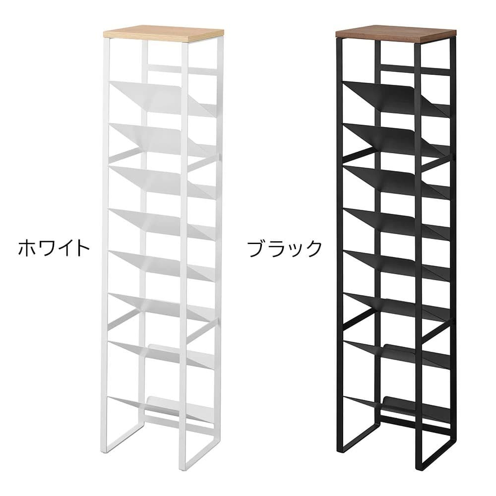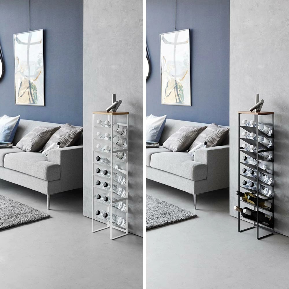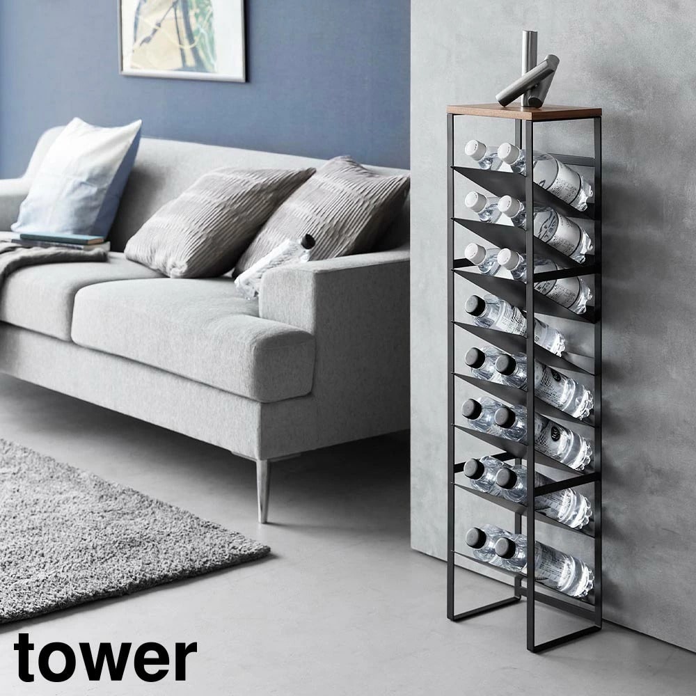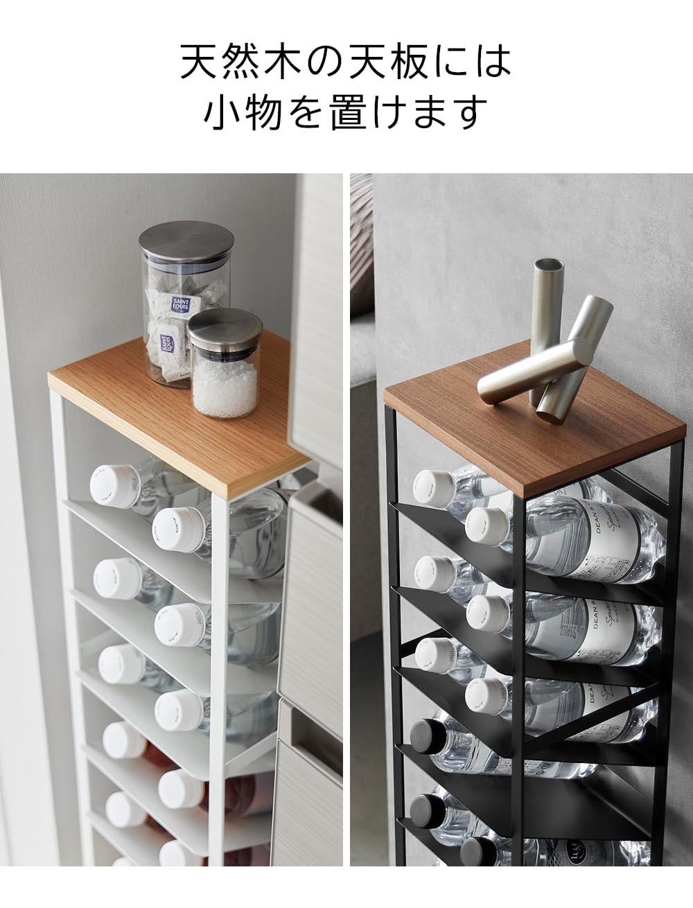 毎日飲むペットボトル飲料やお酒などを、すぐに手に取れる場所にスタイリッシュに収納できる、8段のボトルストッカーです。 縦長のとてもスリムなストッカーなので、冷蔵庫と壁の間や、リビングやパントリーのちょっとしたスペースに場所を取ることなく設置できます。 傾斜の付いた棚はボトルを引き出しやすく、安定して収納できるデザイン。ボトルを最大16本収納可能です。 上の6段は、500mLのペットボトルや、キッチンのラップやホイルなどの小物類の収納にぴったり。下の2段はやや高さにゆとりがあり、大きめのボトルや瓶類、調味料ボトルなどの収納に最適です。 天然木の天板には小物を置くことができます。