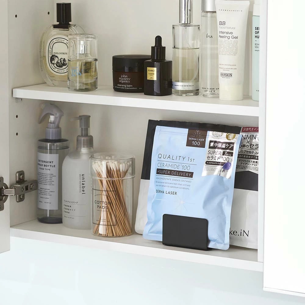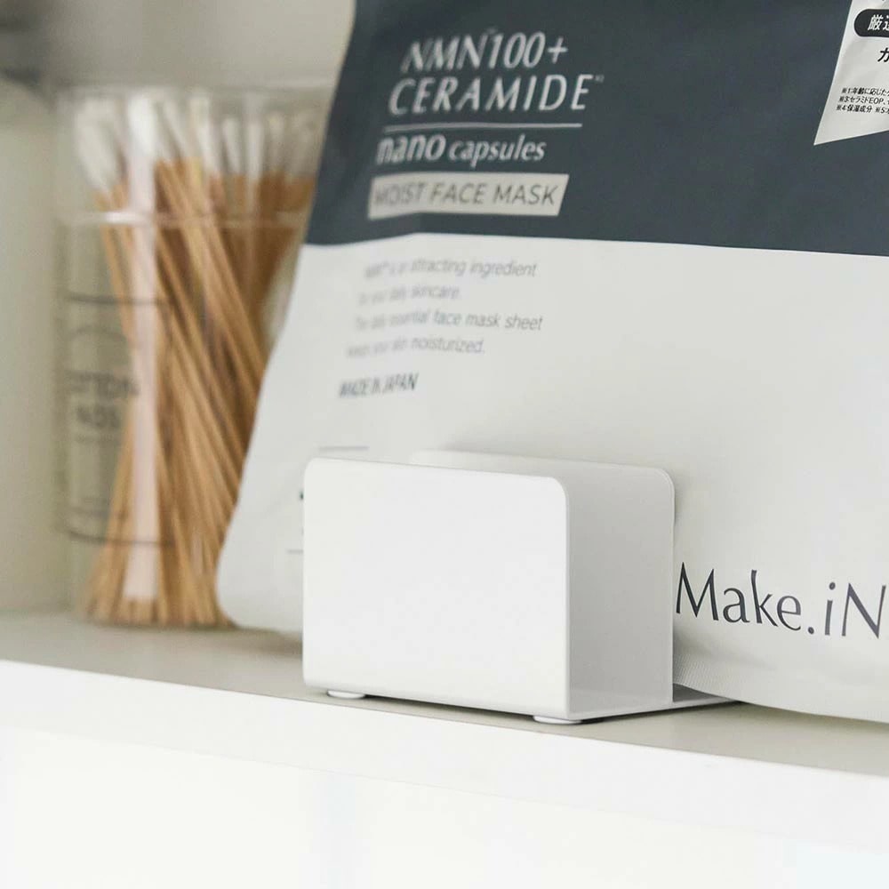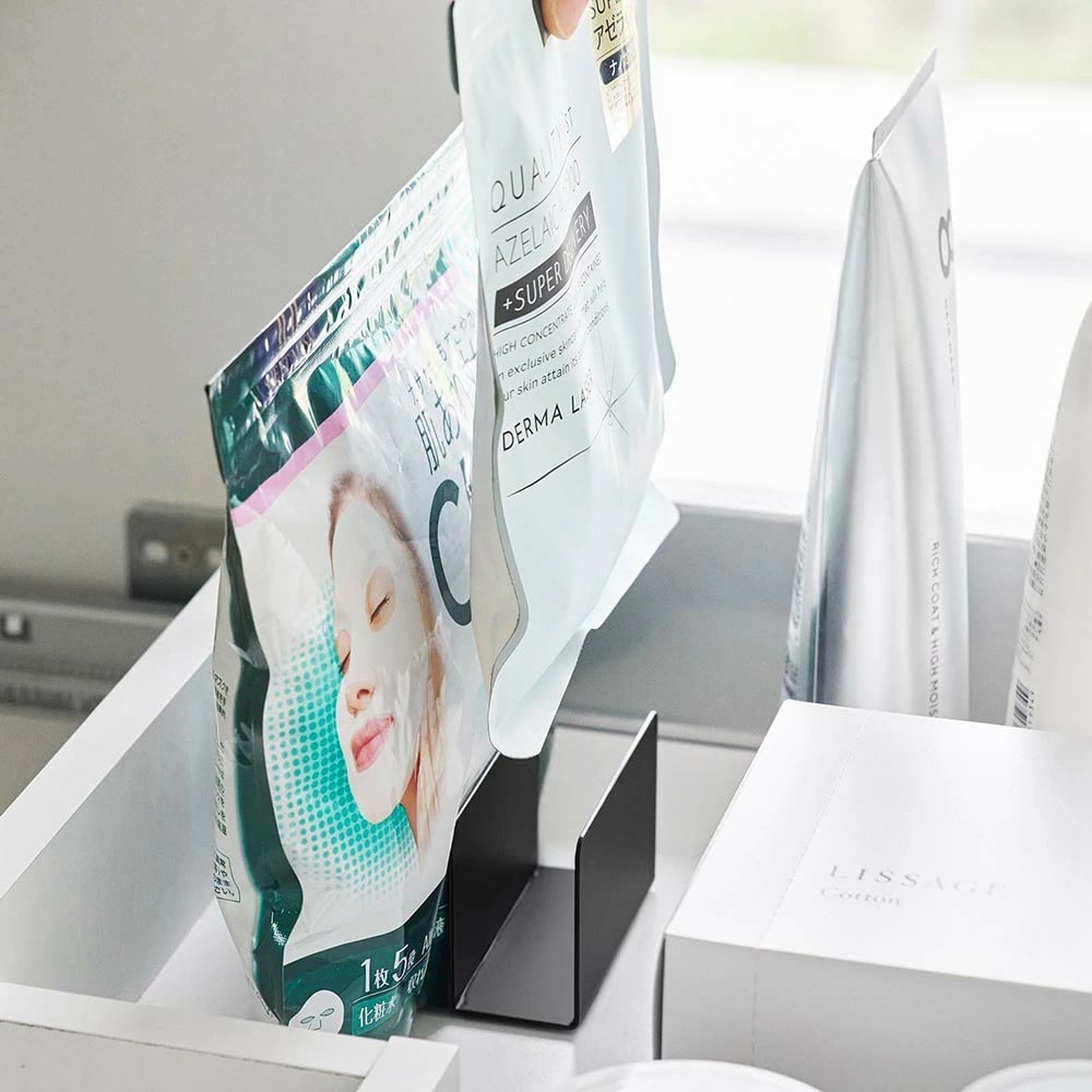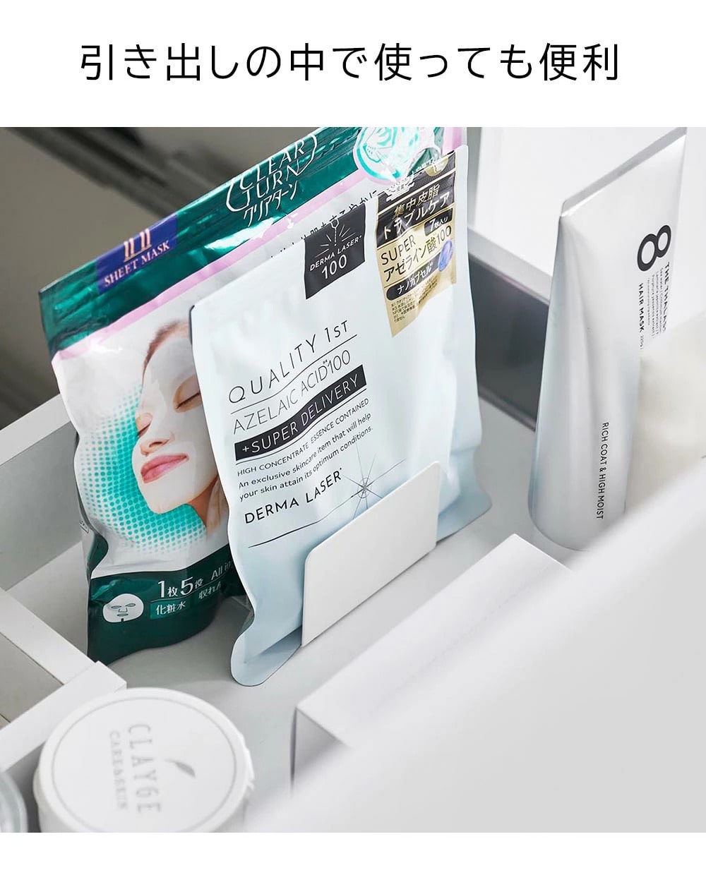 置き場所に困る自立しない袋入りフェイスマスクを、自立させてスッキリと収納できる仕切り付きのスタンドです。前後で異なる奥行きの仕切りが付いているので、内容量に合わせて2種類のフェイスマスクを収納できます。 スタンド本体の奥行きは7.5cmと、洗面鏡中に置けるコンパクトなサイズ。自立させることで、洗面鏡中に収納しづらいフェイスマスクもスッキリ収納できます。スペースも無駄にしません。また、取り出しやすくなるのでスムーズにお手入れできます。引き出し中で使用しても便利です。