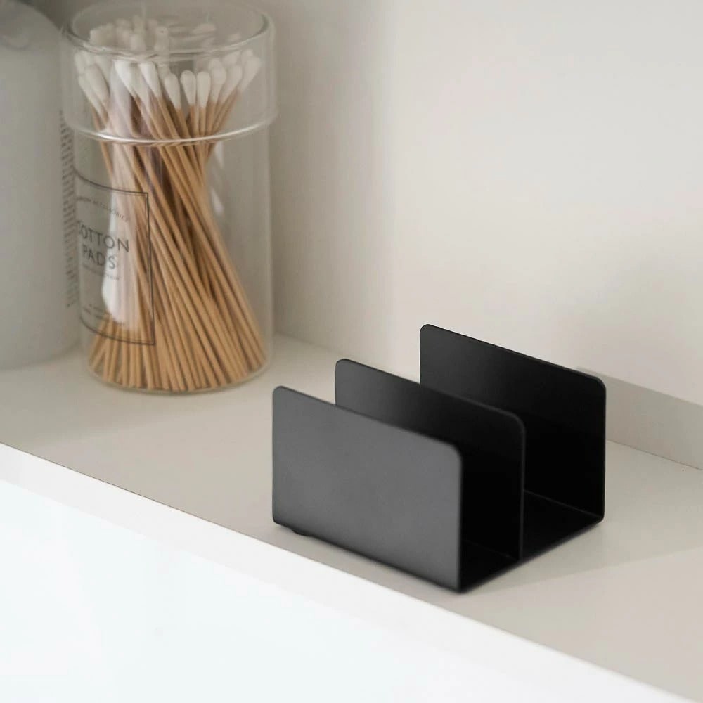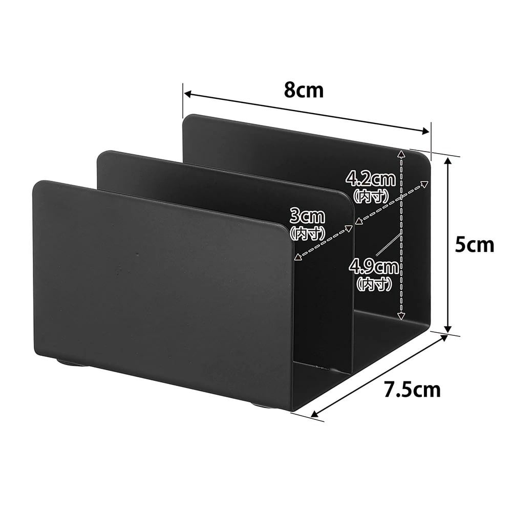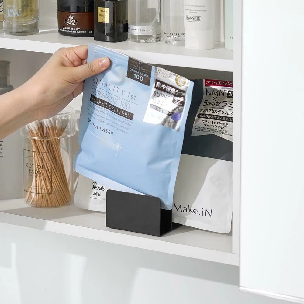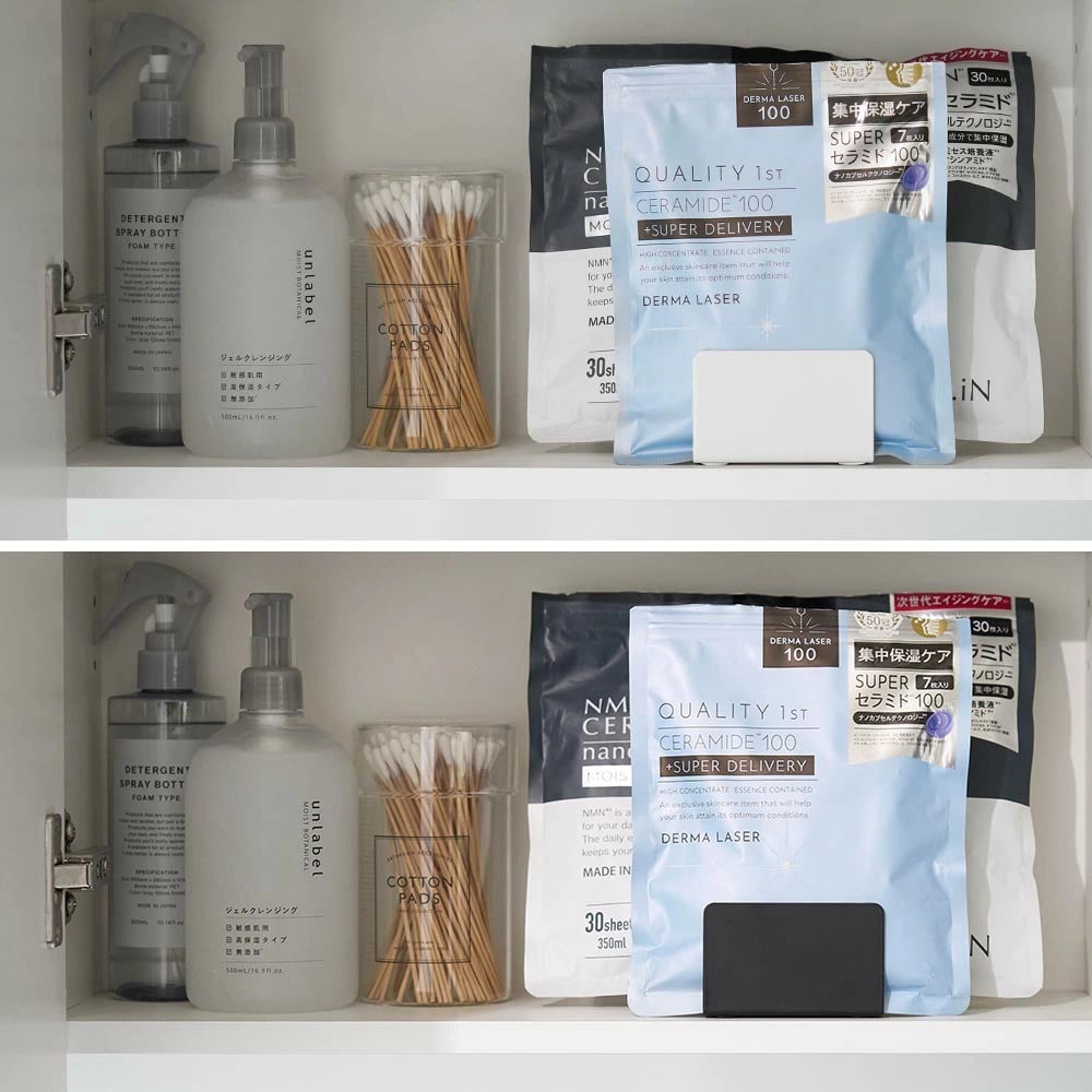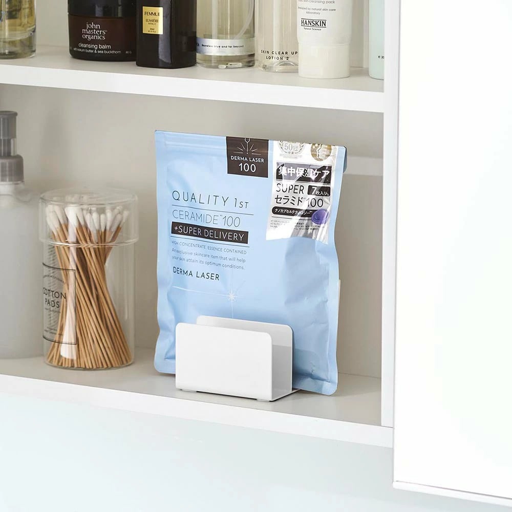 置き場所に困る自立しない袋入りフェイスマスクを、自立させてスッキリと収納できる仕切り付きのスタンドです。前後で異なる奥行きの仕切りが付いているので、内容量に合わせて2種類のフェイスマスクを収納できます。 スタンド本体の奥行きは7.5cmと、洗面鏡中に置けるコンパクトなサイズ。自立させることで、洗面鏡中に収納しづらいフェイスマスクもスッキリ収納できます。スペースも無駄にしません。また、取り出しやすくなるのでスムーズにお手入れできます。引き出し中で使用しても便利です。