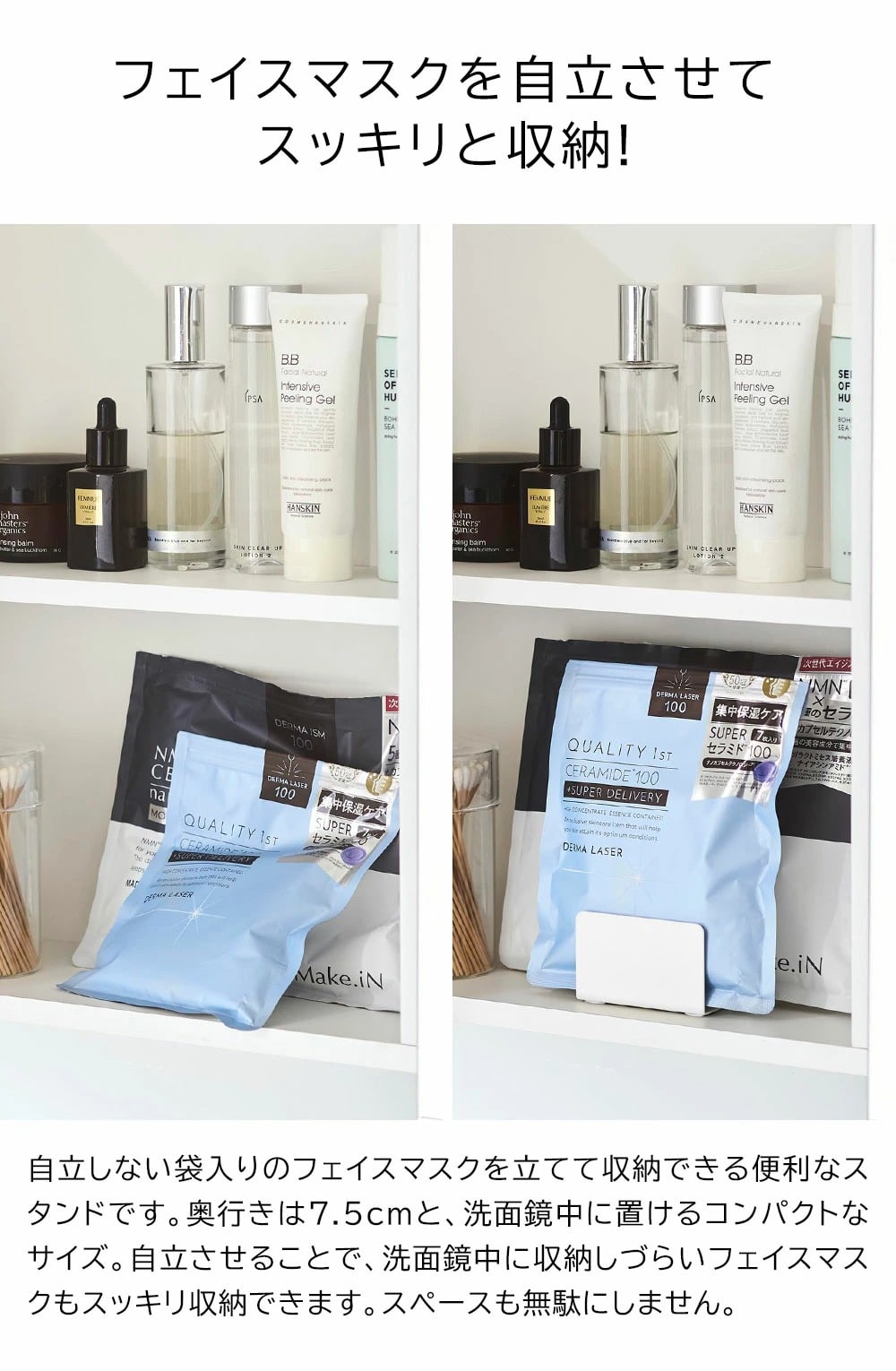 置き場所に困る自立しない袋入りフェイスマスクを、自立させてスッキリと収納できる仕切り付きのスタンドです。前後で異なる奥行きの仕切りが付いているので、内容量に合わせて2種類のフェイスマスクを収納できます。 スタンド本体の奥行きは7.5cmと、洗面鏡中に置けるコンパクトなサイズ。自立させることで、洗面鏡中に収納しづらいフェイスマスクもスッキリ収納できます。スペースも無駄にしません。また、取り出しやすくなるのでスムーズにお手入れできます。引き出し中で使用しても便利です。 フェイスマスクは付属しておりません。