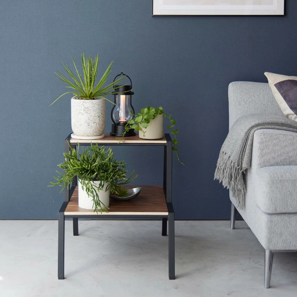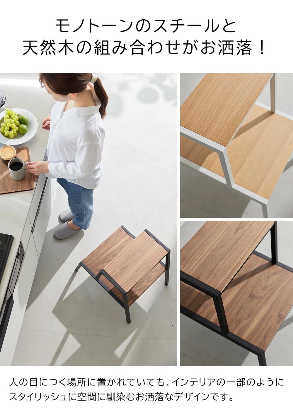 高い場所にある物の出し入れの際に、1台あると便利な2段の踏み台です。 足を乗せられるスペースが広く、安定感があるので安心して使用できます。 天然木の踏面とモノトーンのスチールの組み合わせがスタイリッシュで、室内の見える場所に置かれていても、インテリアの一部のようにおしゃれに空間に馴染みます。 踏み台としての使用以外にも、例えばキッチンで、調理の合間にちょっと腰掛ける場所にしたり、リビングでは、サイドテーブルや観葉植物の置き台として使用するのも便利です。 組み立て不要で、届いたらすぐに使用できます。