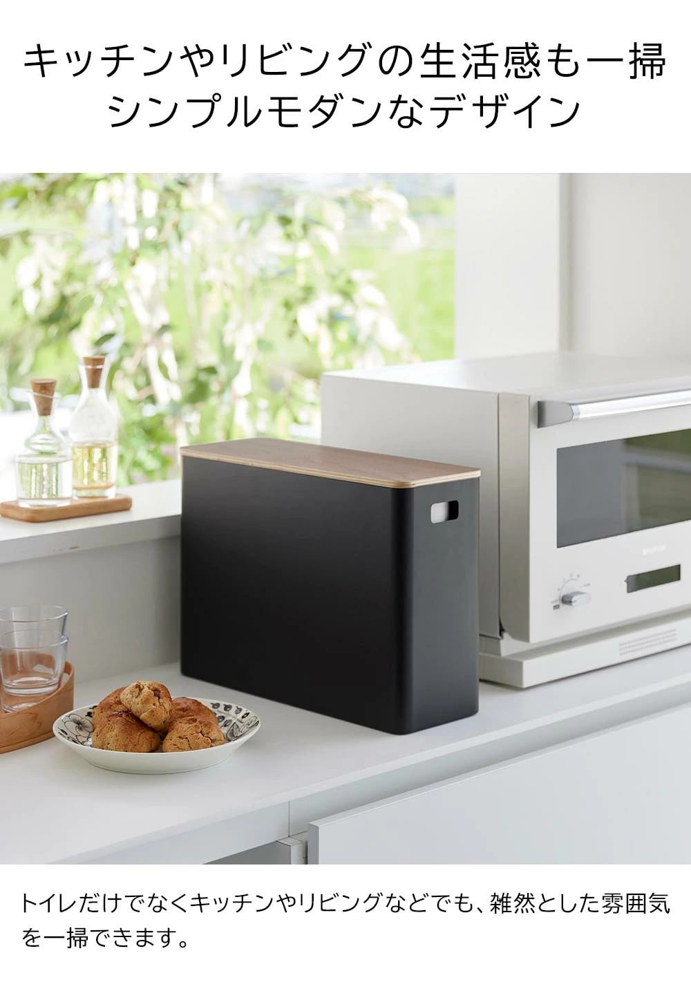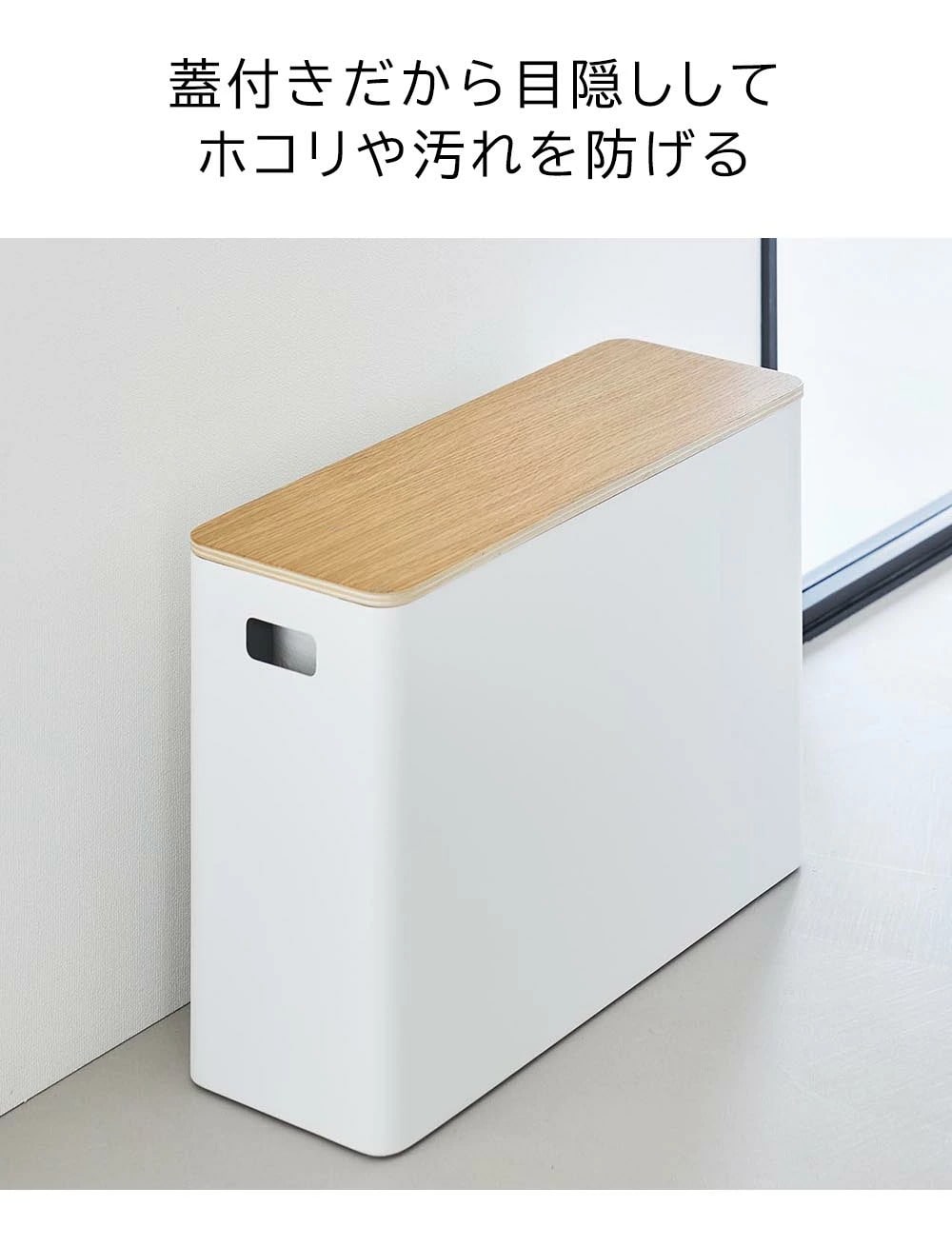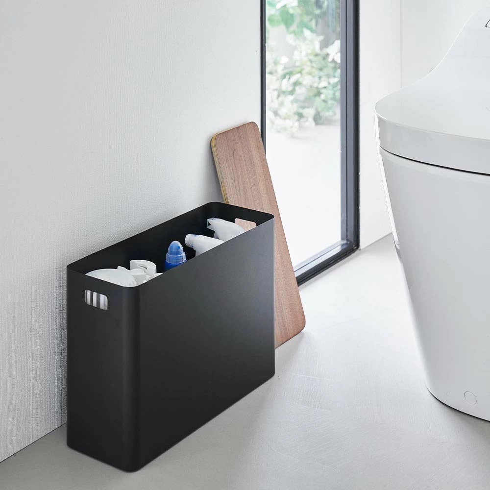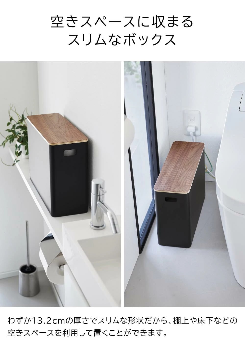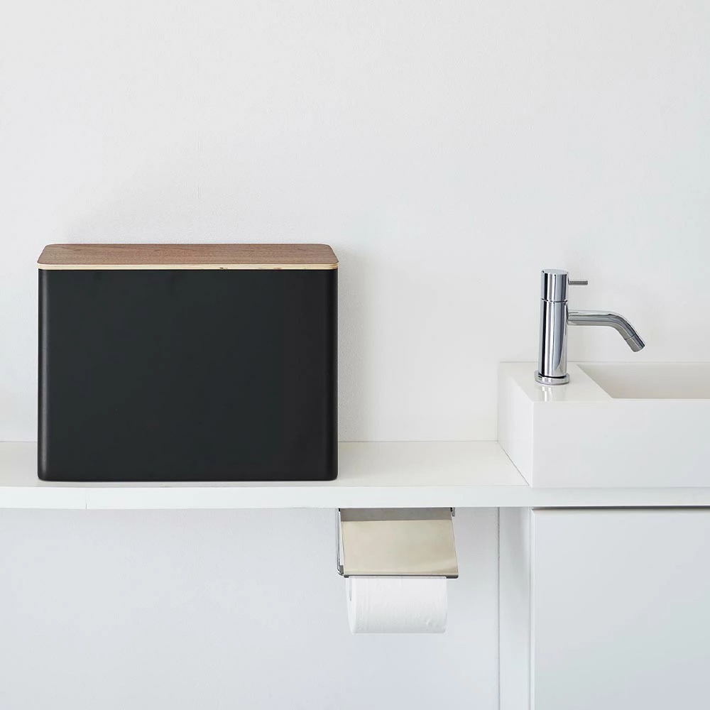トイレで必要なトイレットペーパーなどのストック類やお掃除用品をスッキリと収められる収納ボックスです。蓋付きだから生活感を目隠しして片付けられます。 棚の上や床の空いたスペースに置けるスリムな形状。 スチールと木の組み合わせが上質なデザインは、スチールと木の組み合わせが上質なデザインで、キッチンやリビングでの整理整頓にも役に立ちます。