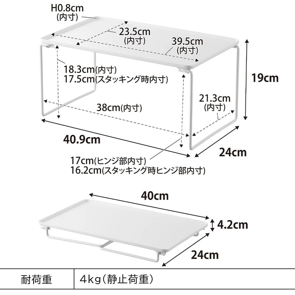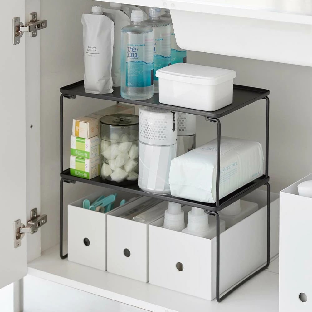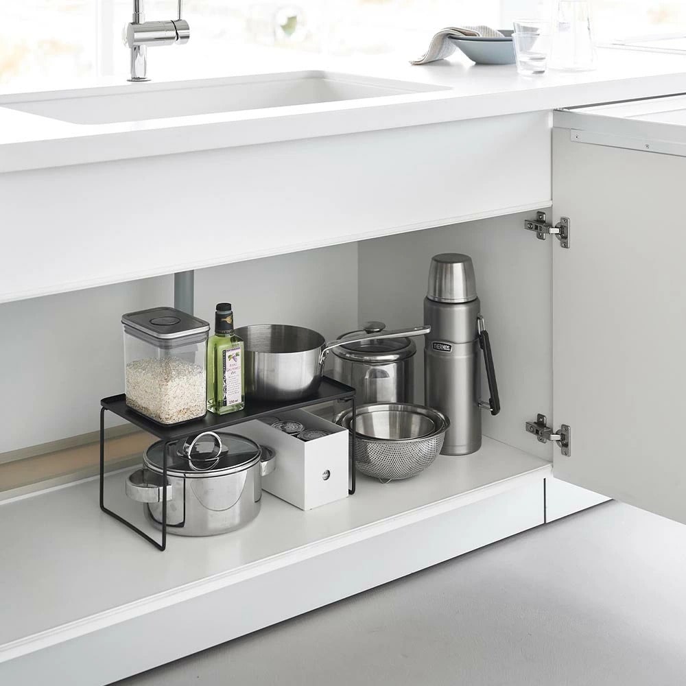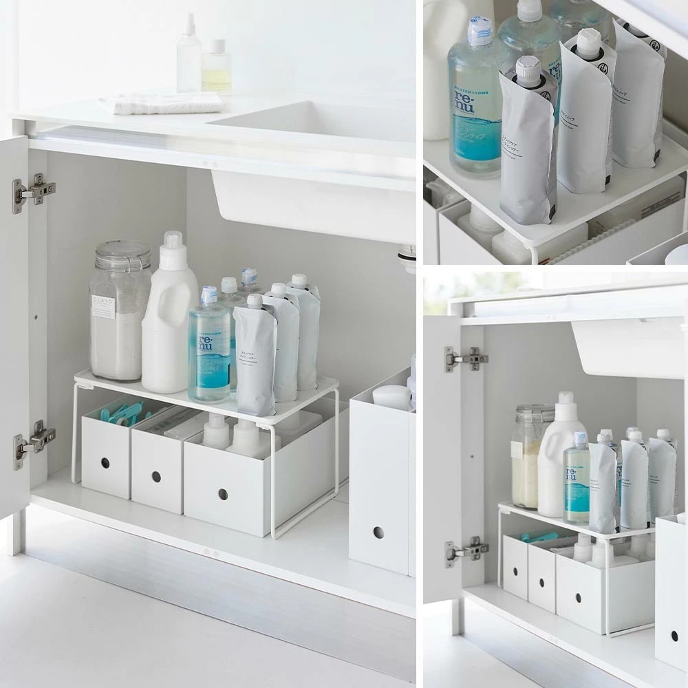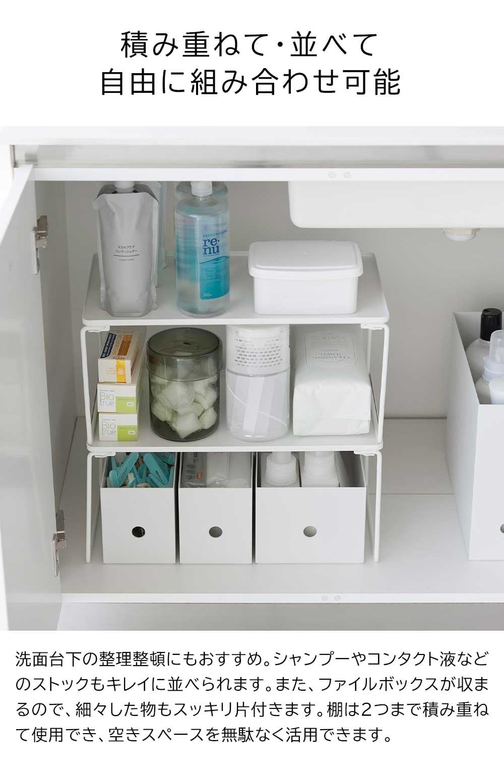 キッチンや洗面所のシンク下の空いているスペースを有効活用できるMサイズの棚。 複数個使用して、積み重ねたり並べたりでき、手軽に収納空間を増やせます。 キッチンでは、キャビネットやパントリーの整理にも大活躍! 下段に鍋、上段に調味料といったように、空間を上手に活用できます。 作業台やカウンター上に設置して、スパイスラックとしてお使いいただくのも便利です。 洗面所では、シャンプーや洗濯洗剤などのストックをたっぷりと収納可能! ファイルボックスが収まるので、細々した物もスッキリと整頓できます。 天板部分はトレーのようなフチ付きの形状なので、収納物の落下を防ぎます。 使わない時は脚を折り畳んで4.2cmと薄くなるため、 ちょっとした隙間に収納でき保管場所にも困りません。