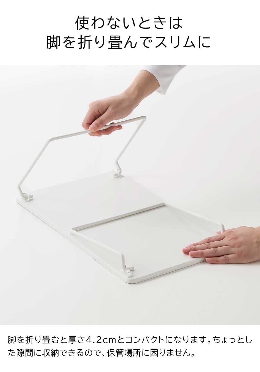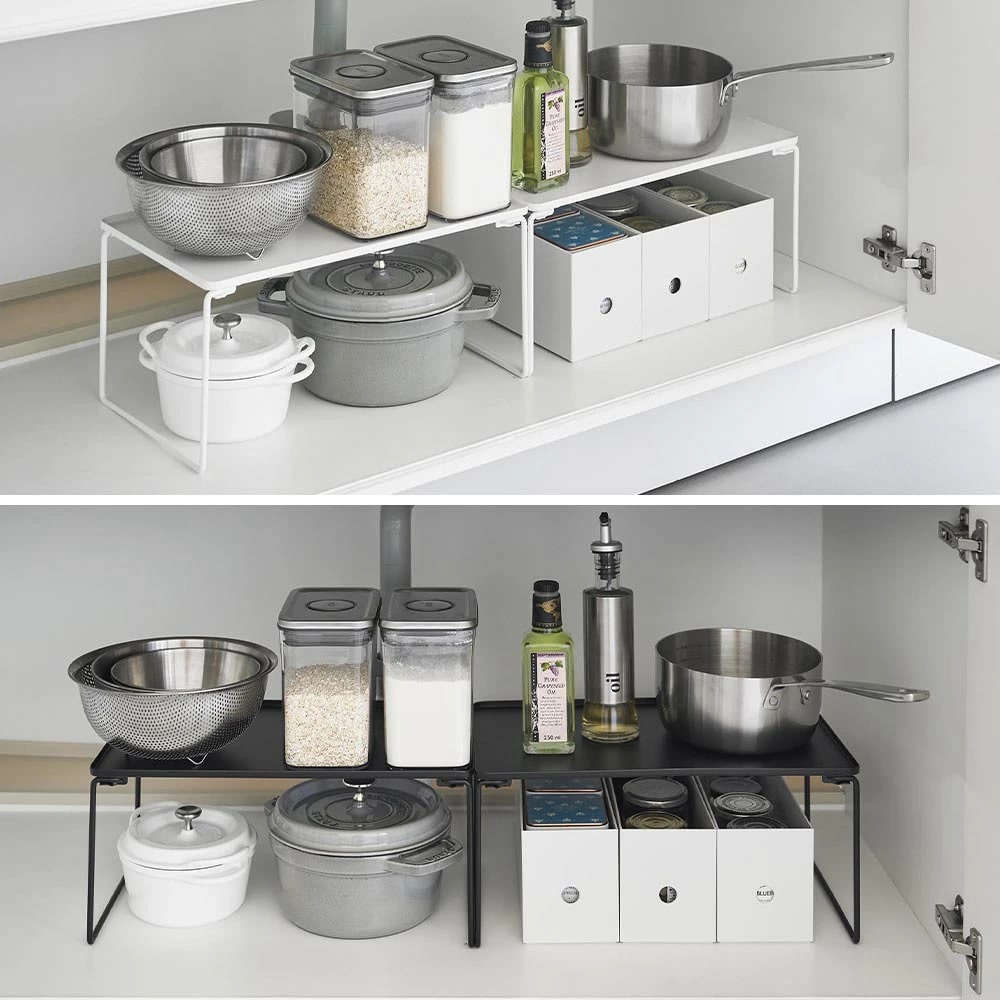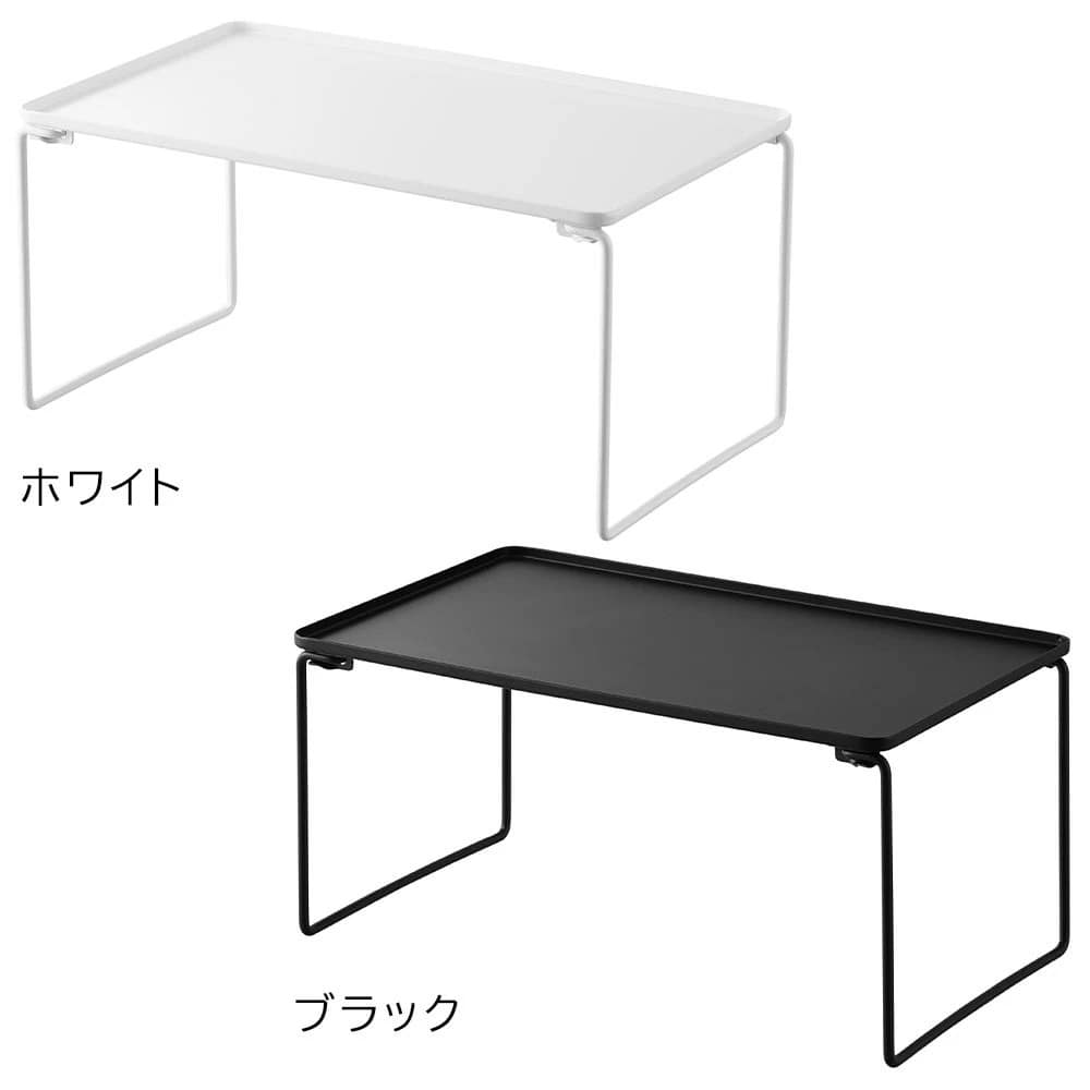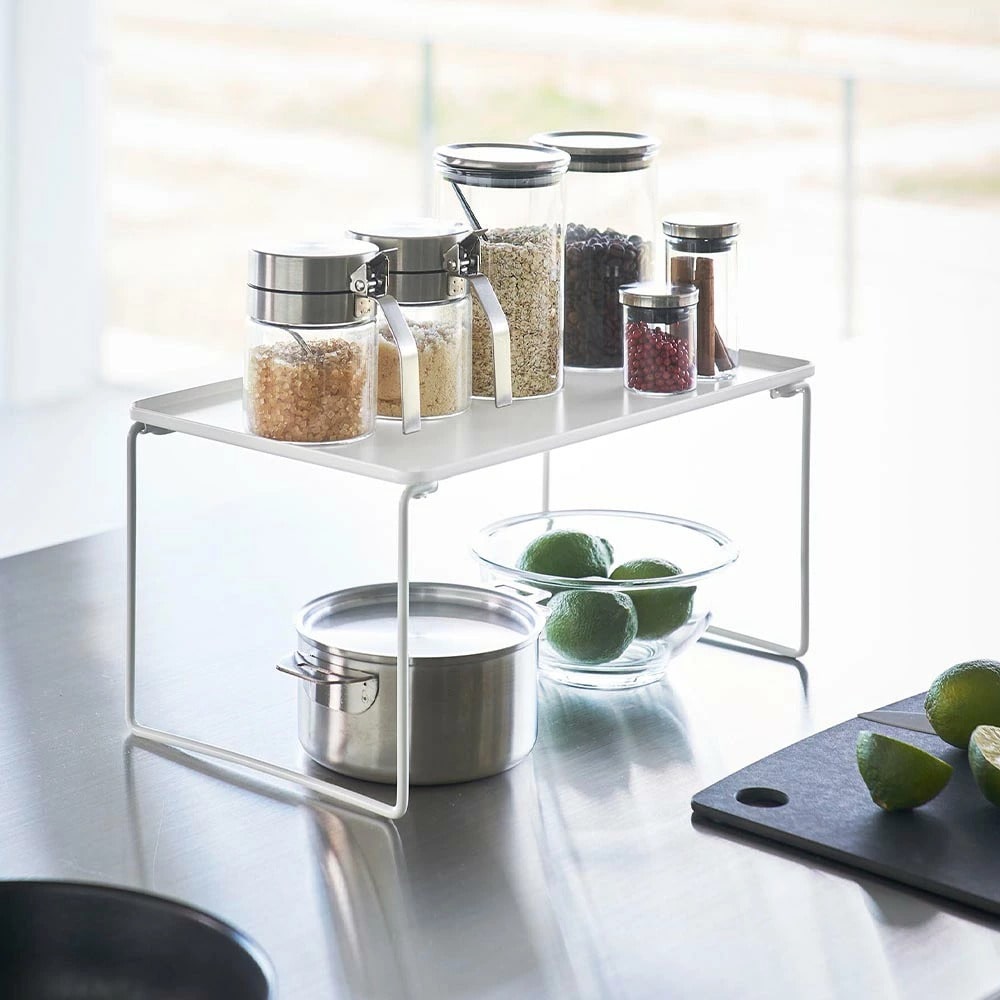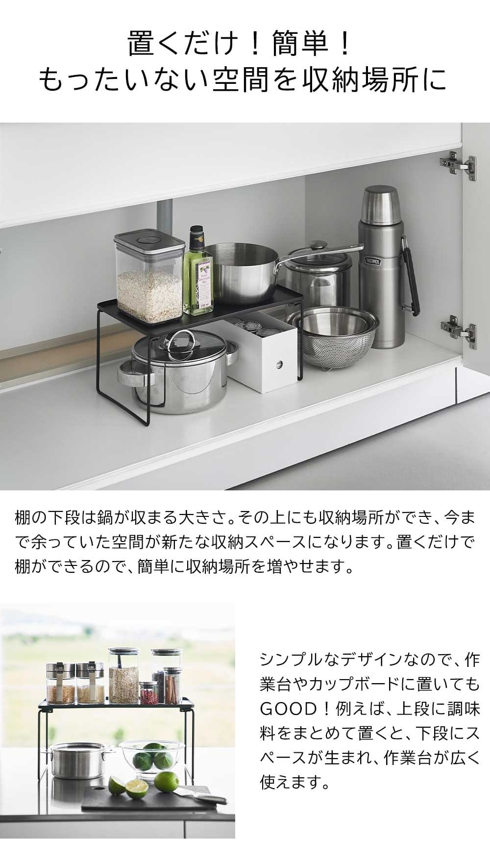 キッチンや洗面所のシンク下の空いているスペースを有効活用できるMサイズの棚。 複数個使用して、積み重ねたり並べたりでき、手軽に収納空間を増やせます。 キッチンでは、キャビネットやパントリーの整理にも大活躍! 下段に鍋、上段に調味料といったように、空間を上手に活用できます。 作業台やカウンター上に設置して、スパイスラックとしてお使いいただくのも便利です。 洗面所では、シャンプーや洗濯洗剤などのストックをたっぷりと収納可能! ファイルボックスが収まるので、細々した物もスッキリと整頓できます。 天板部分はトレーのようなフチ付きの形状なので、収納物の落下を防ぎます。 使わない時は脚を折り畳んで4.2cmと薄くなるため、 ちょっとした隙間に収納でき保管場所にも困りません。