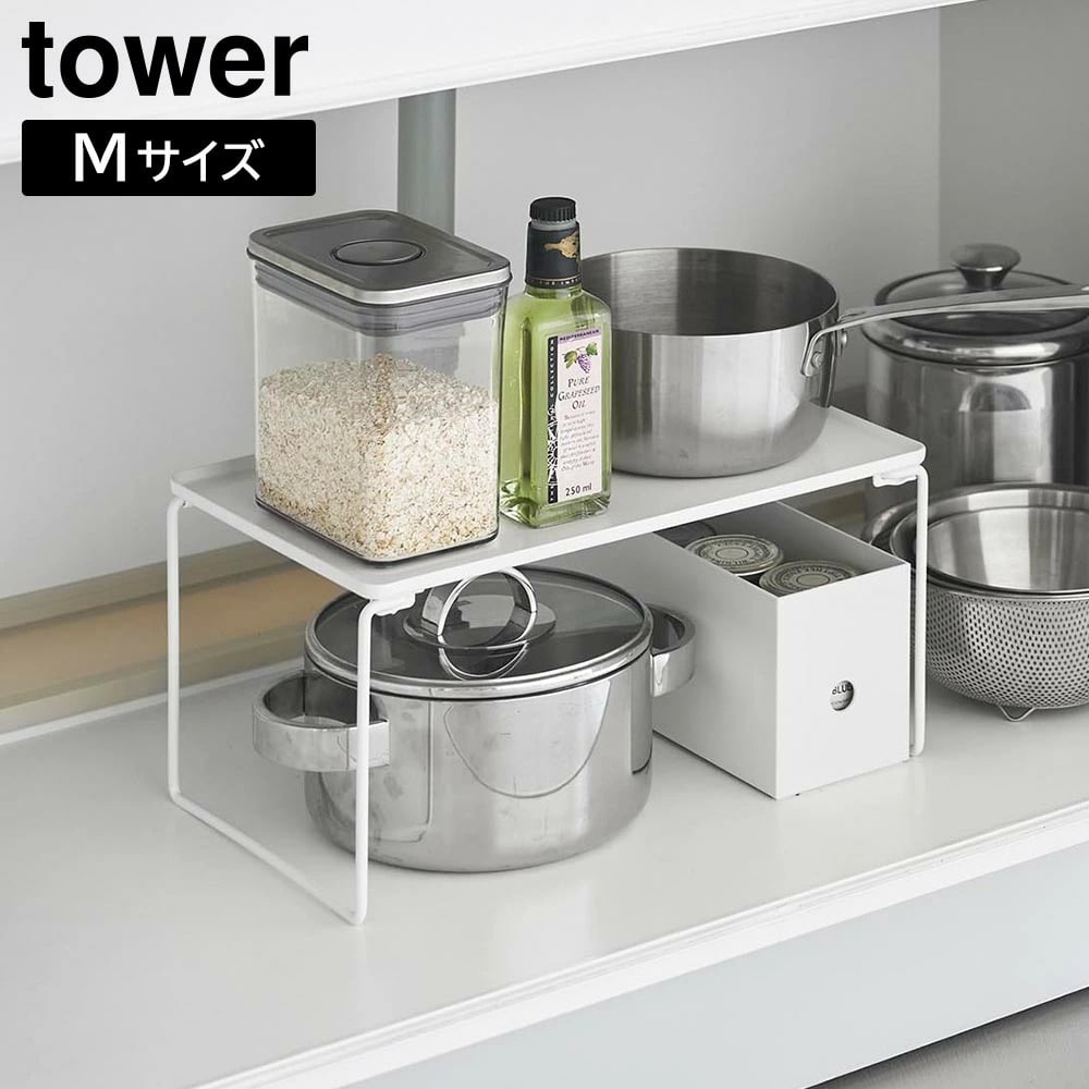 キッチンや洗面所のシンク下の空いているスペースを有効活用できるMサイズの棚。 複数個使用して、積み重ねたり並べたりでき、手軽に収納空間を増やせます。 キッチンでは、キャビネットやパントリーの整理にも大活躍! 下段に鍋、上段に調味料といったように、空間を上手に活用できます。 作業台やカウンター上に設置して、スパイスラックとしてお使いいただくのも便利です。 洗面所では、シャンプーや洗濯洗剤などのストックをたっぷりと収納可能! ファイルボックスが収まるので、細々した物もスッキリと整頓できます。 天板部分はトレーのようなフチ付きの形状なので、収納物の落下を防ぎます。 使わない時は脚を折り畳んで4.2cmと薄くなるため、 ちょっとした隙間に収納でき保管場所にも困りません。 イメージとして複数個を使用した写真を掲載しておりますが、こちらは「折り畳み積み重ね棚 タワー M」単品でのお届けとなります。