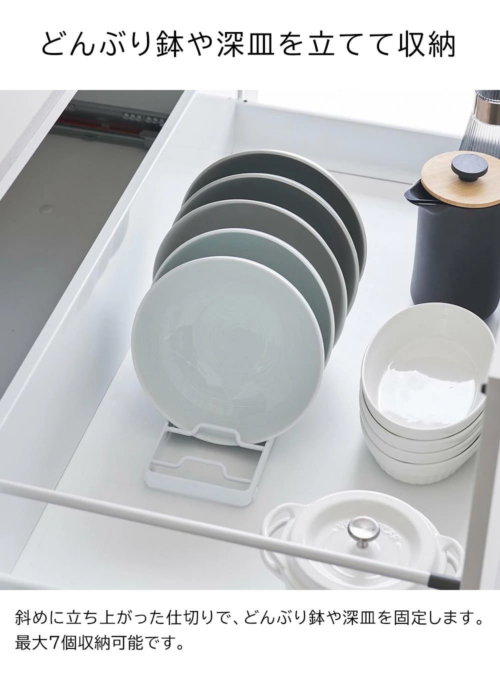 どんぶり鉢やサラダボウルを、取り出しやすく立てて収納できるお椀スタンドLサイズ。 使いたい食器が一目でわかり、簡単に片手で取り出せます。 最大6個まで収納可能です。