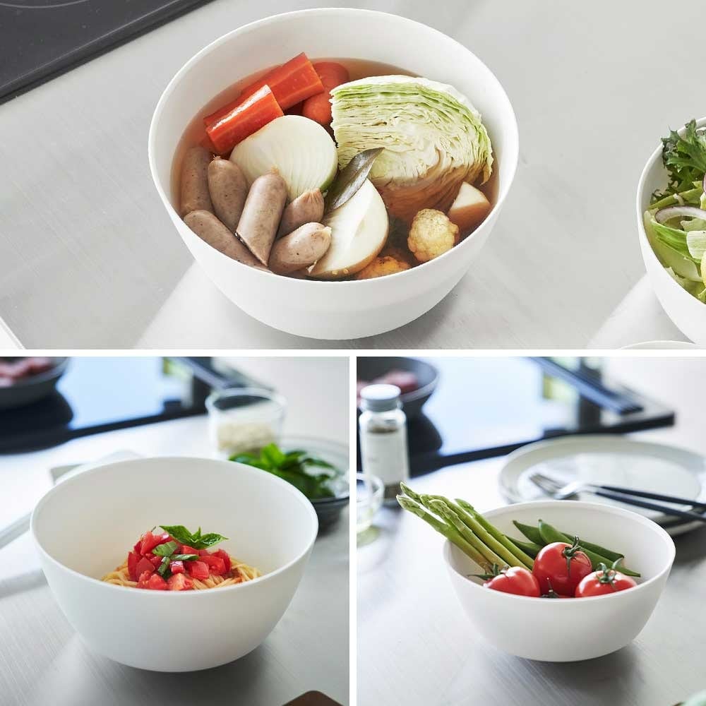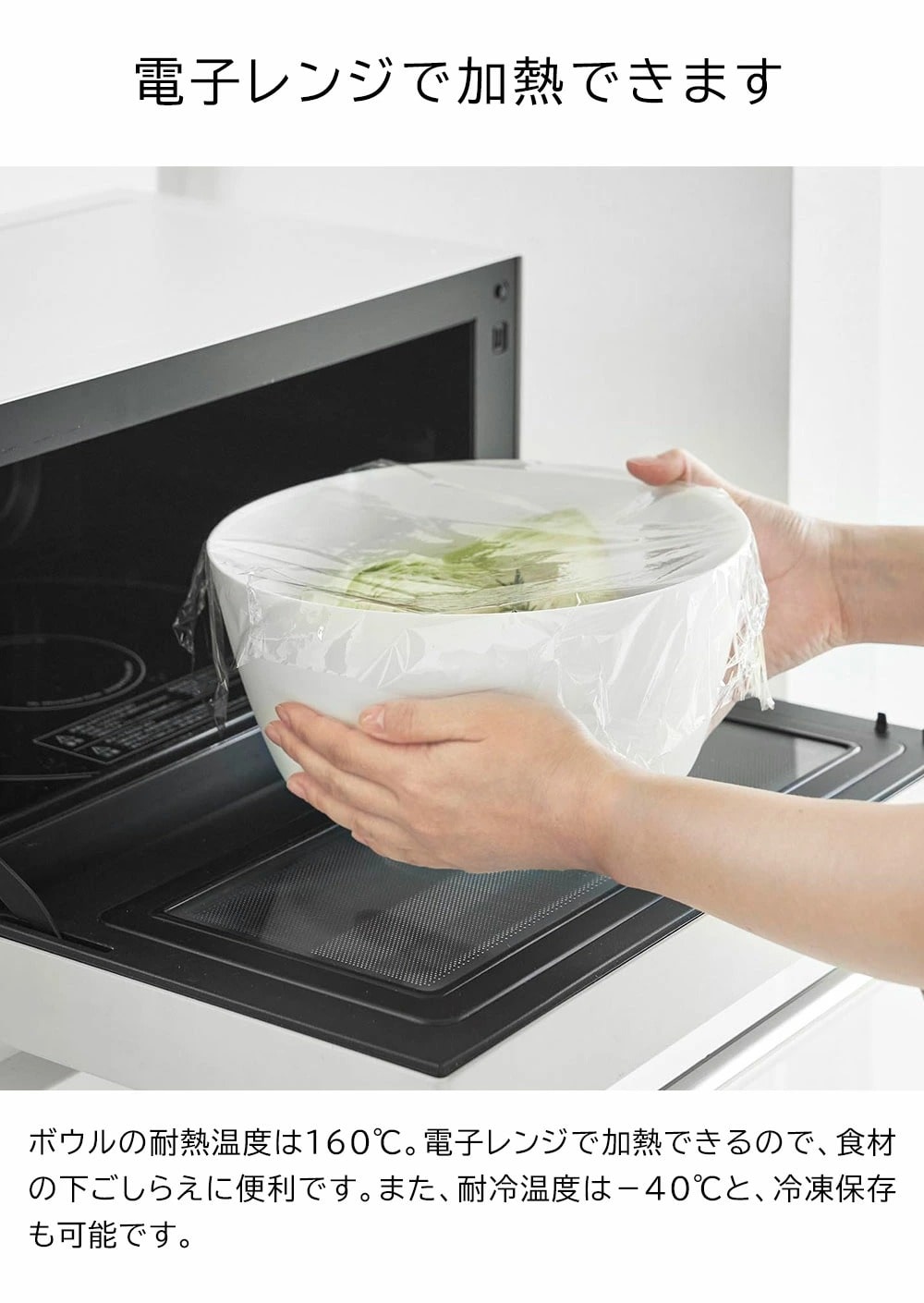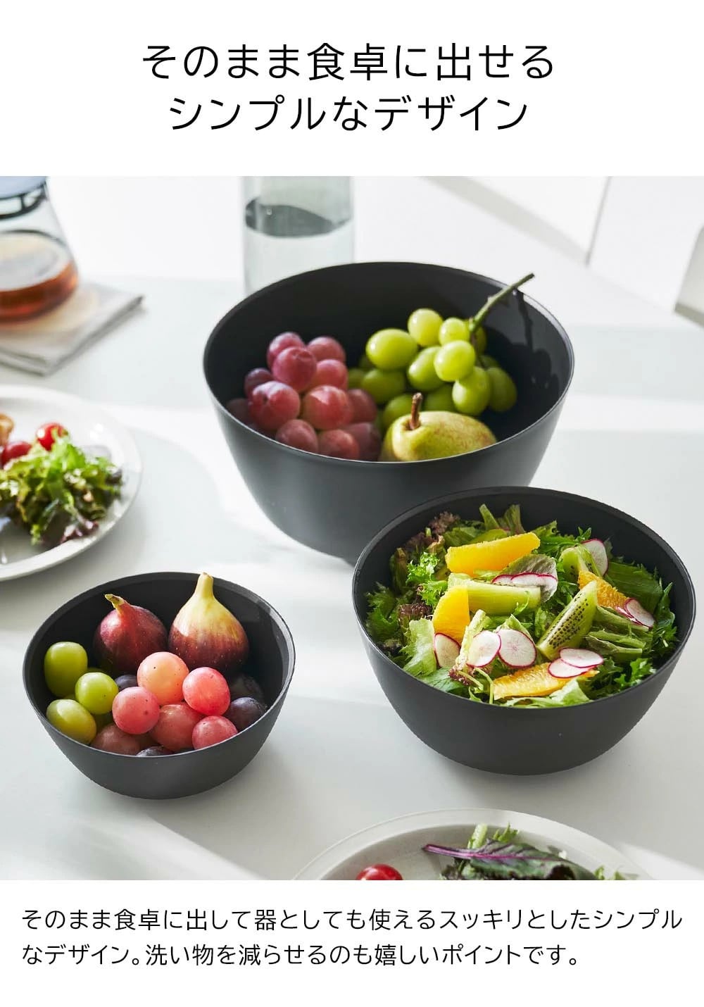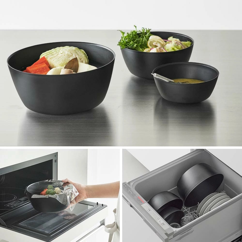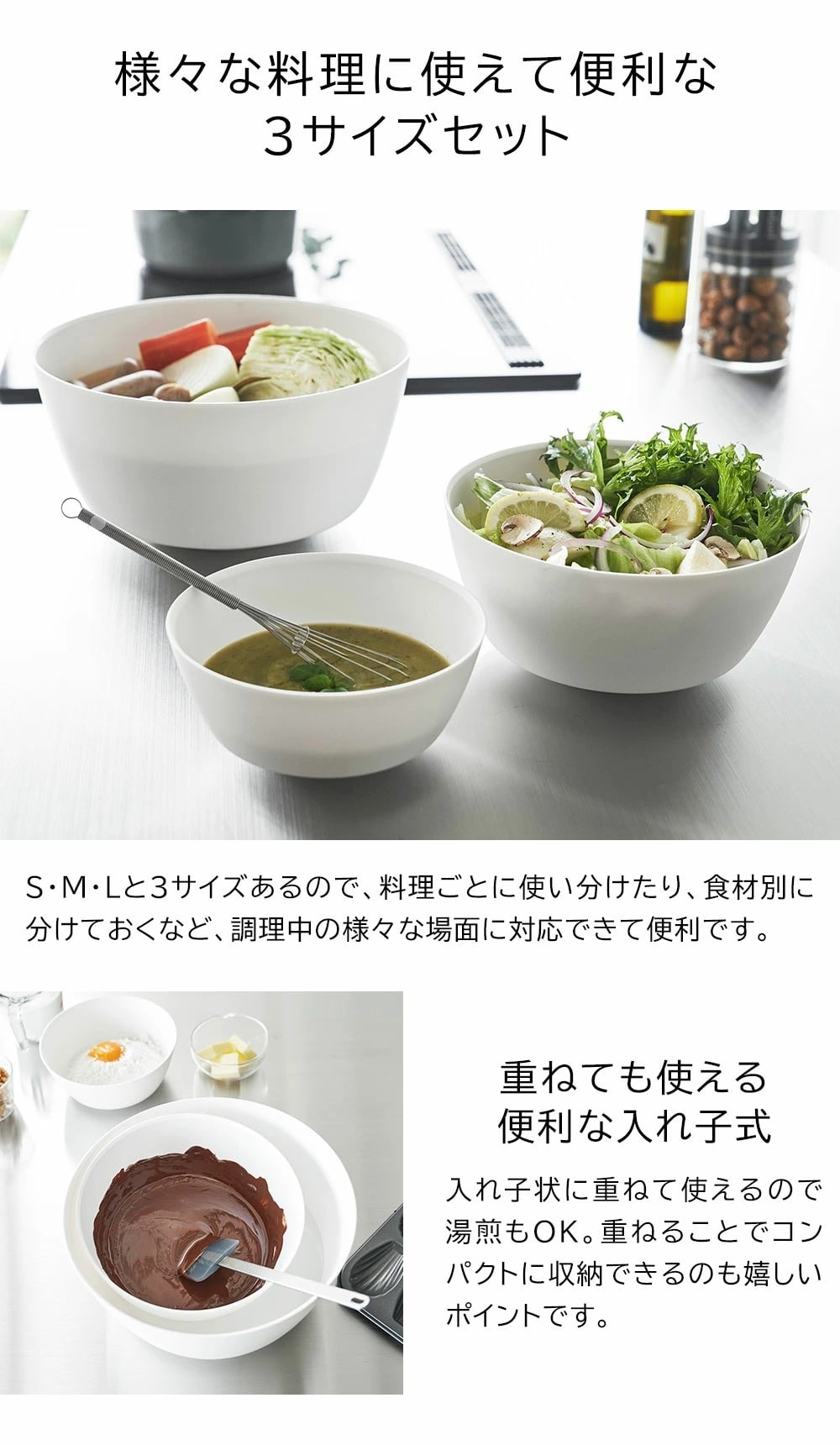 傾けて軽く手で持つだけで、斜めの状態をラクにキープでき、食材を混ぜやすい調理ボウルS・M・Lの3サイズセットです。安定して混ぜられるので手にかかる負担も軽くなります。ボウルのサイズによって料理ごとに使い分けたり、食材別に分けておくなど、調理中の様々な場面に対応できます。 ボウルは電子レンジで加熱できるので、下ごしらえに便利。冷凍保存も可能です。スッキリとしたシンプルなデザインで、器としても使えます。食卓にそのまま出せるので、洗い物を減らせます。食洗機対応でお手入れも簡単です。