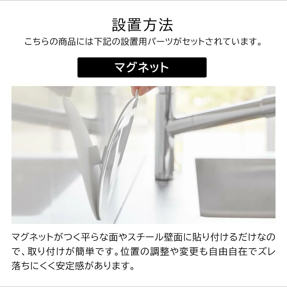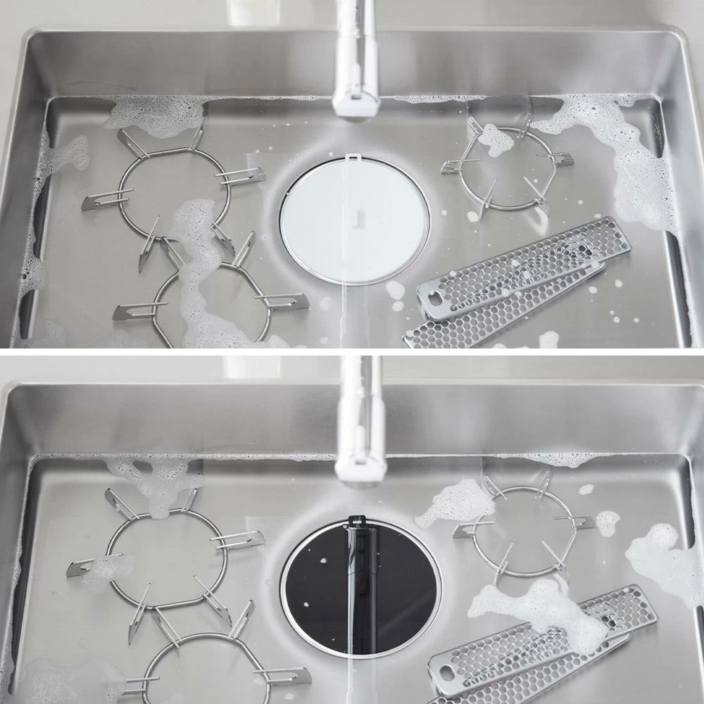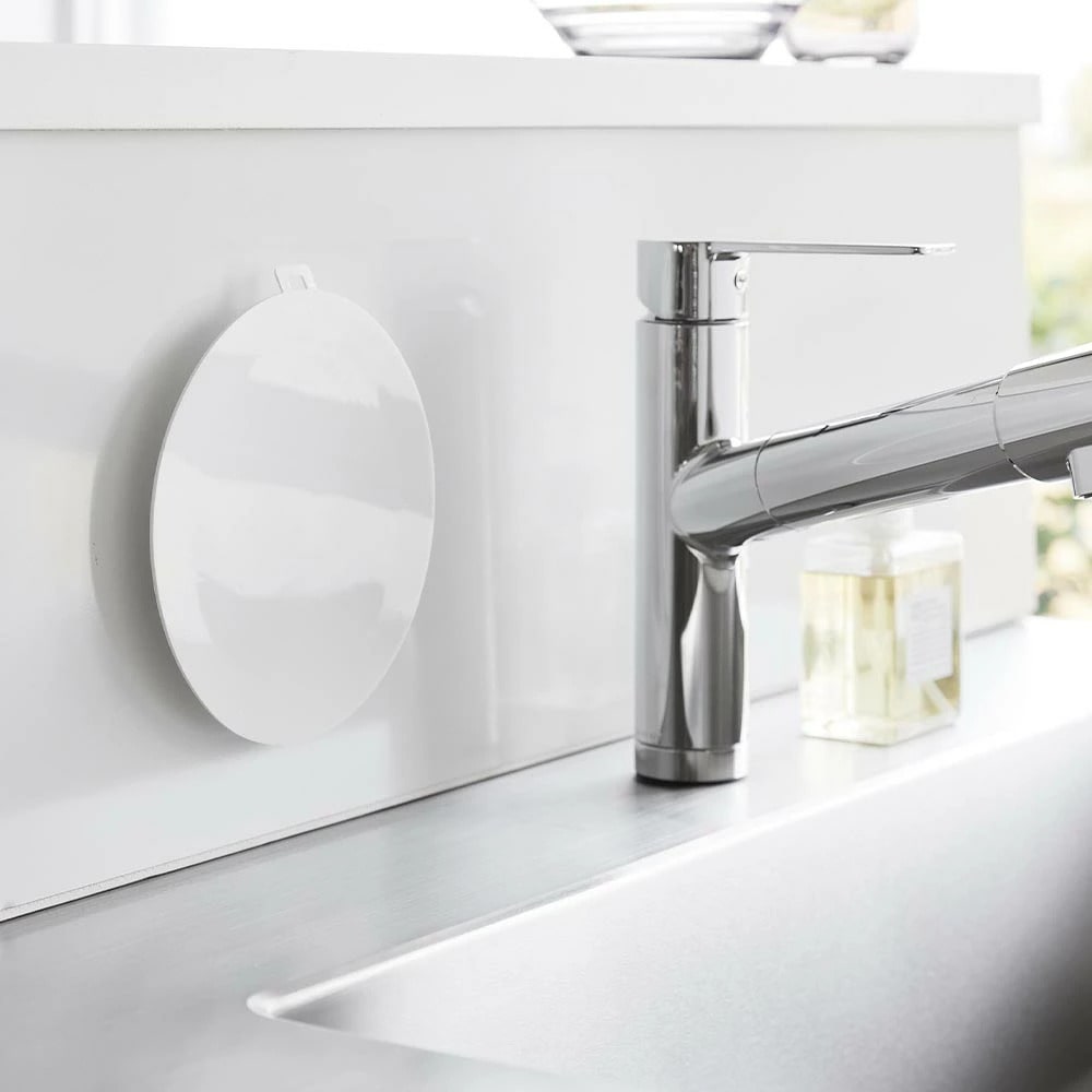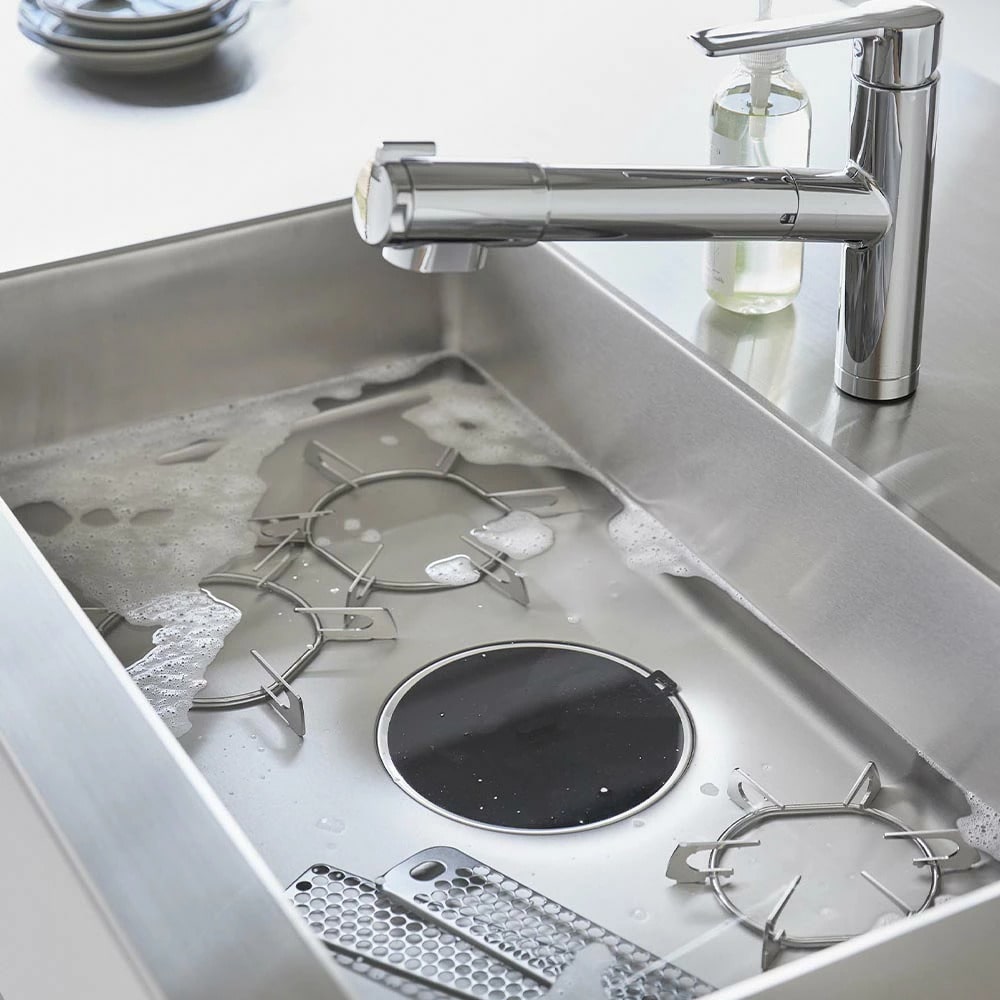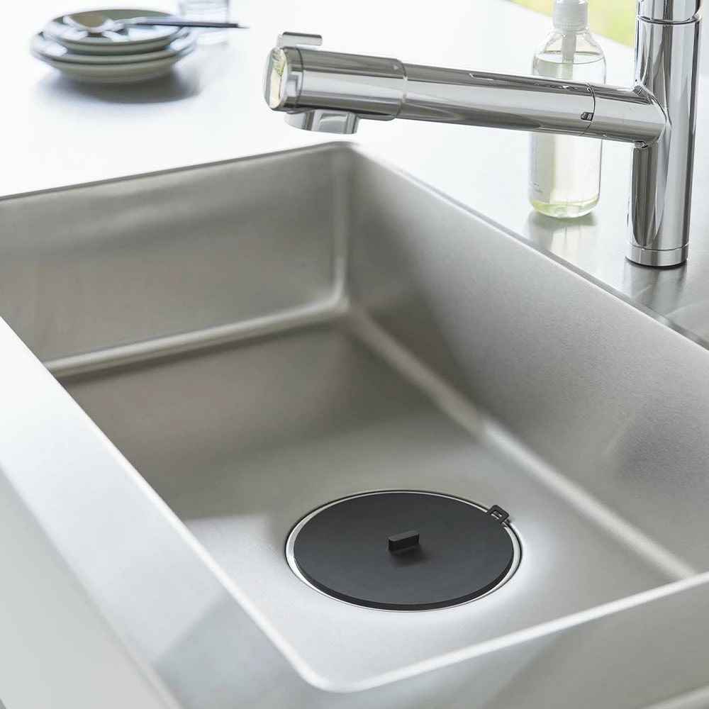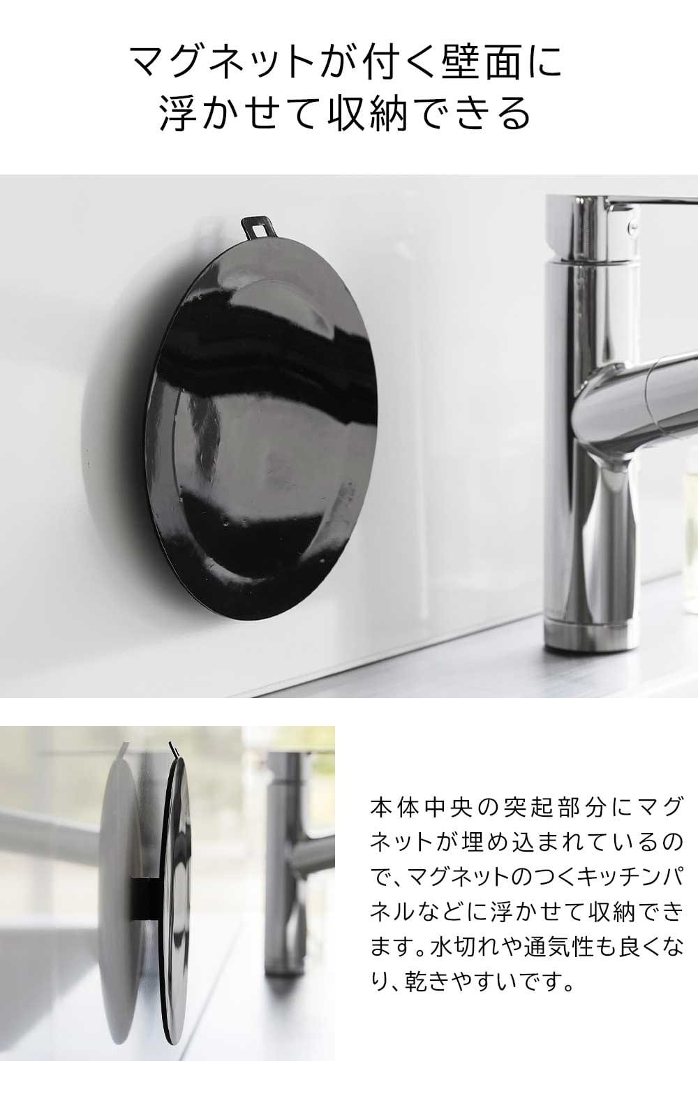 排水口に蓋をしてシンクで浸け置き洗いができるシリコーン製の止水キャップ。 直径15cm以内の排水口に対応しています。 本体中央にマグネットが埋め込まれており、シンク周りのマグネットがつく壁面に貼り付けて収納できるので収納場所にも困りません。 また、浮かせているので水切れや通気性が良くなり、乾きやすいです。