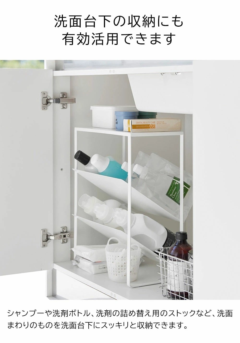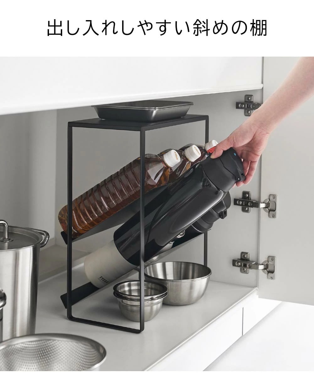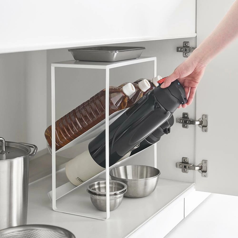 1.5L程のやや大きめの水筒や2Lのペットボトルなど、収納に困る大きなボトルをキッチンシンク下にスッキリと収納できるボトルストッカーです。奥行きと高さがあり、デッドスペースが生まれがちなシンク下の収納空間を無駄なく活用し、かさばる水筒やペットボトルを整理整頓できます。収納棚はボトルの出し入れがしやすい斜めの形状。天板付きなので、小物も置けます。 また、洗剤やシャンプーボトルなど、洗面台下の収納にも使えて便利です。