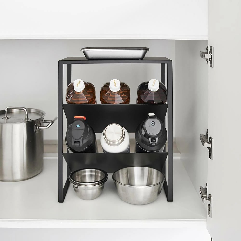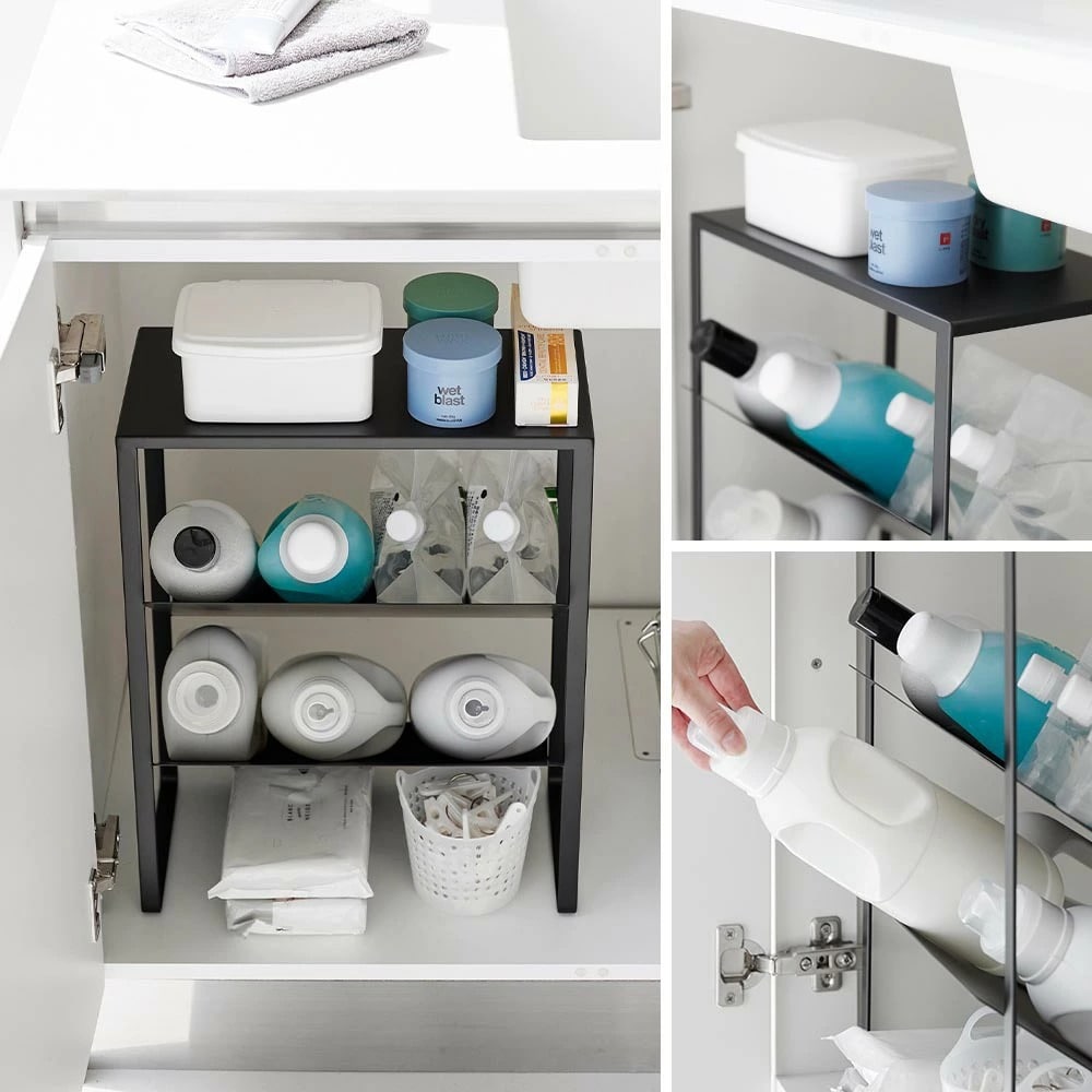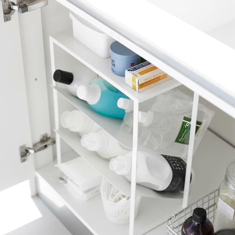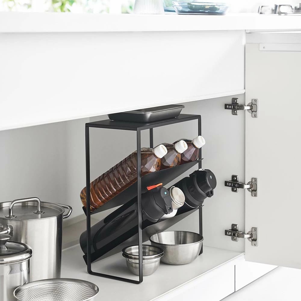 1.5L程のやや大きめの水筒や2Lのペットボトルなど、収納に困る大きなボトルをキッチンシンク下にスッキリと収納できるボトルストッカーです。奥行きと高さがあり、デッドスペースが生まれがちなシンク下の収納空間を無駄なく活用し、かさばる水筒やペットボトルを整理整頓できます。収納棚はボトルの出し入れがしやすい斜めの形状。天板付きなので、小物も置けます。 また、洗剤やシャンプーボトルなど、洗面台下の収納にも使えて便利です。