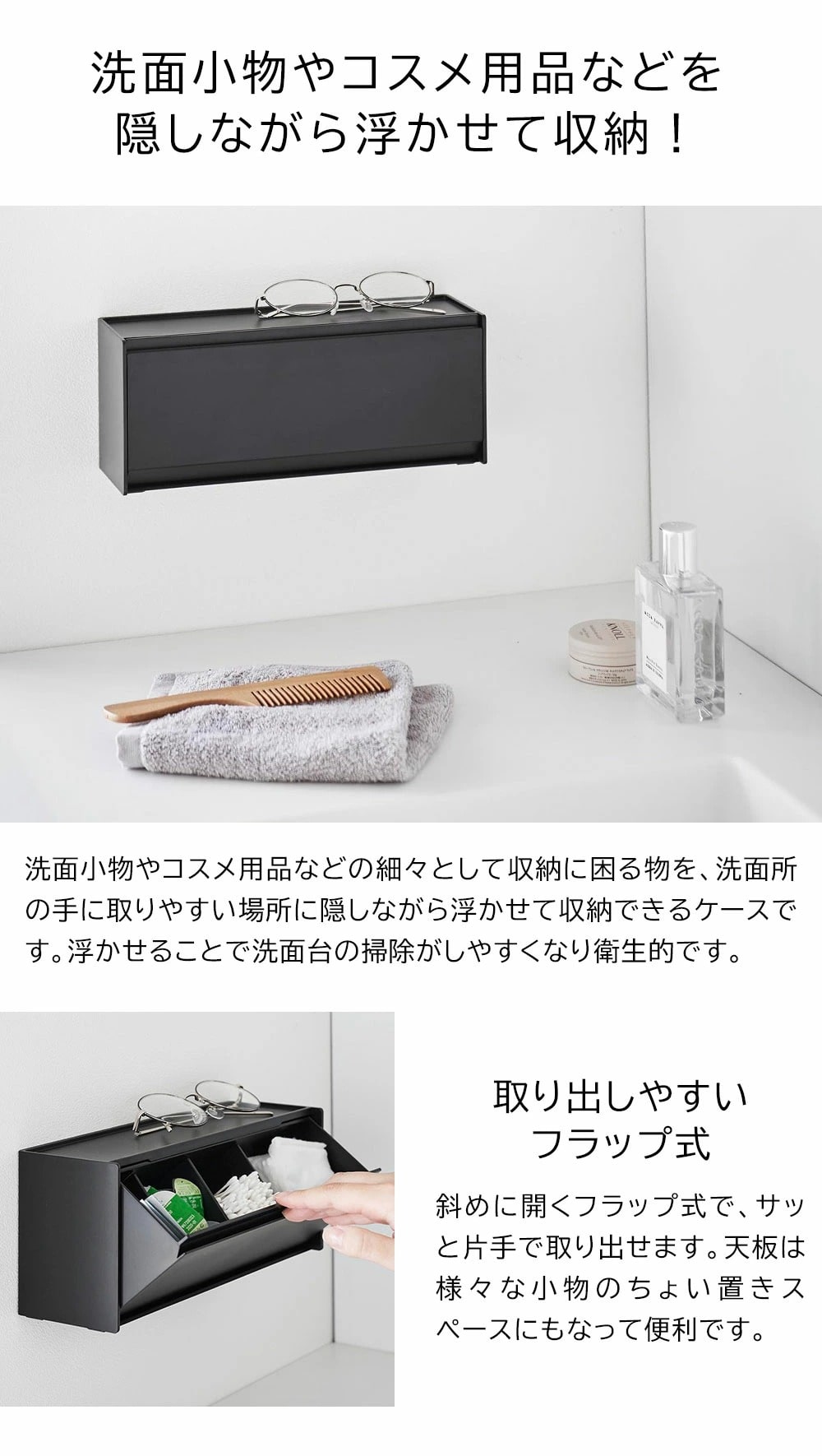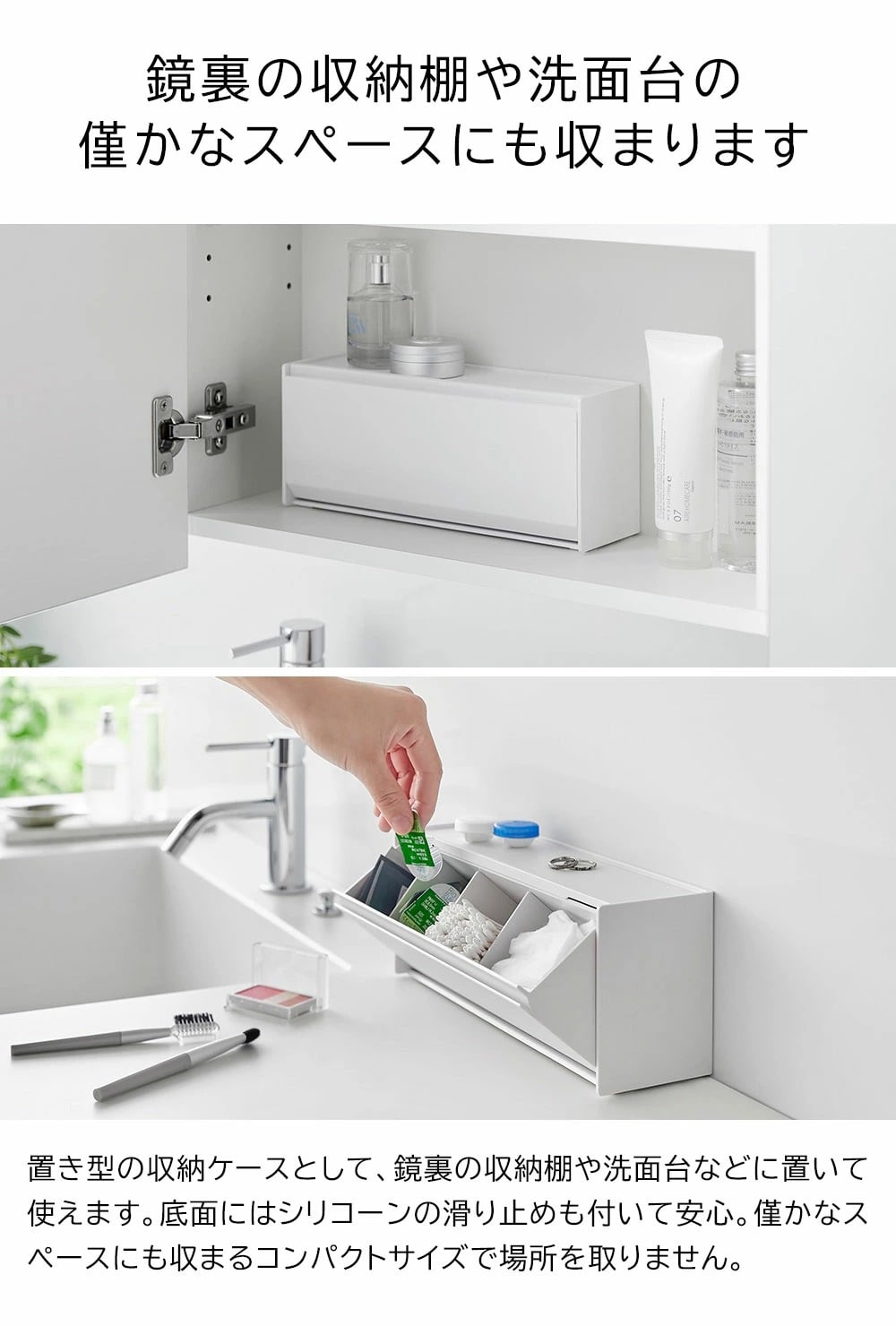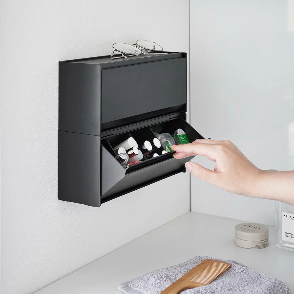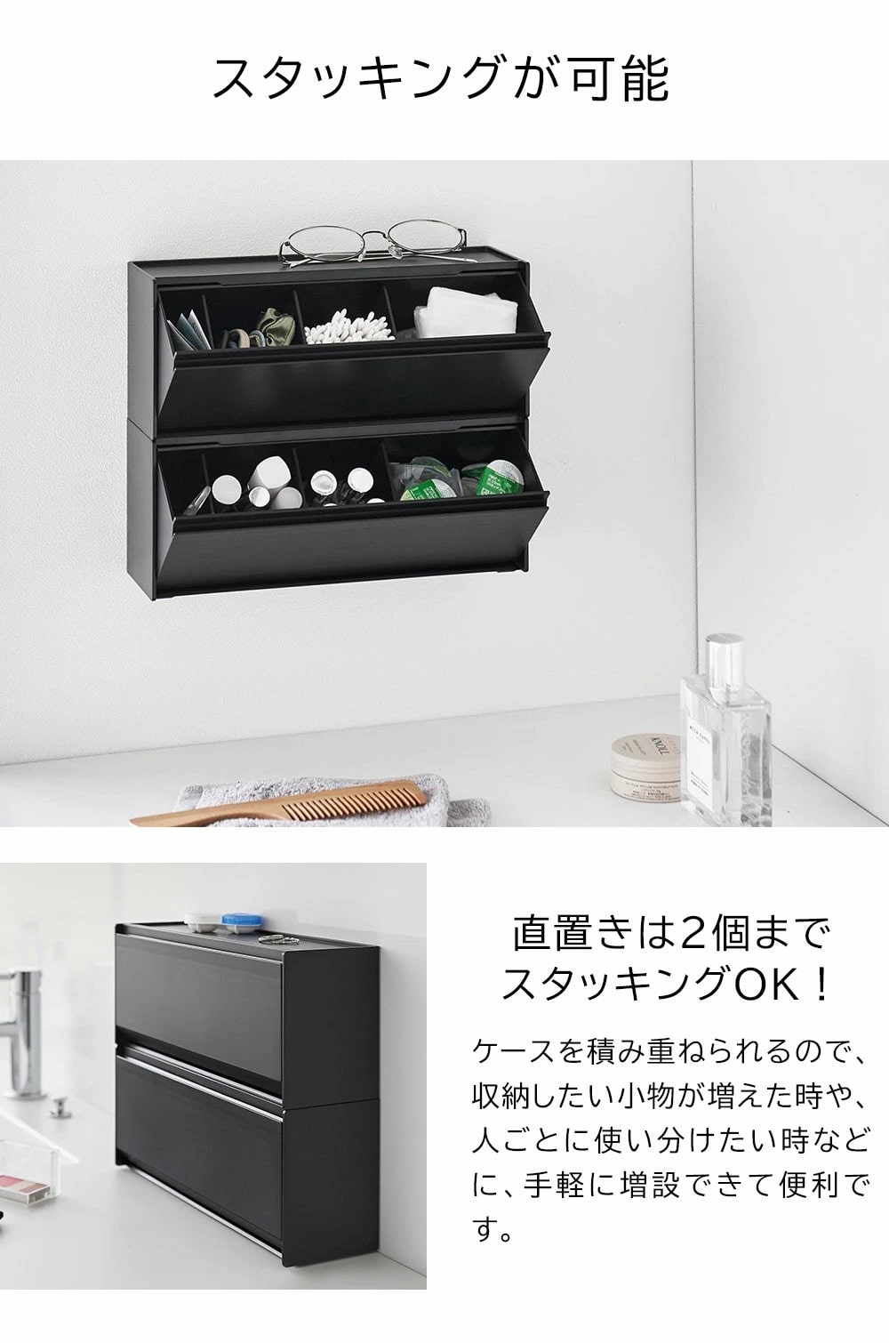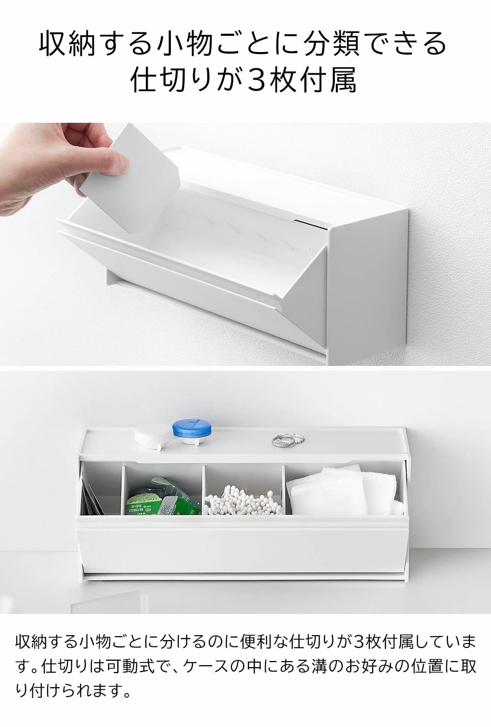 洗面小物やコスメ用品などの、細々とした物の収納にピッタリな石こうボード壁対応の収納ケースです。綿棒・コットン・使い捨てコンタクトレンズなどの洗面小物、コスメ用品など、細かくて収納に困る物を、洗面所の手に取りやすい場所に隠しながら浮かせて収納できます。浮かせることで洗面台の掃除がしやすく衛生的です。 ケースはフラップ式で片手で簡単に開閉でき、様々な小物を分類できる便利な仕切りが3枚付属しています。 また、底面にはシリコーンの滑り止め付きで、置き型の収納ケースとしても使用できます。鏡裏の収納棚や洗面台などの僅かなスペースに収まるコンパクトなサイズなので、場所をとりません。 シンプルな外観なので、生活感を隠しながらスタイリッシュに収納できます。 また、こちらのケースはスタッキングにも対応しております。収納したい小物が増えた時や、人ごとに使い分けたい時などに、複数個重ねて設置するのもオススメです。
