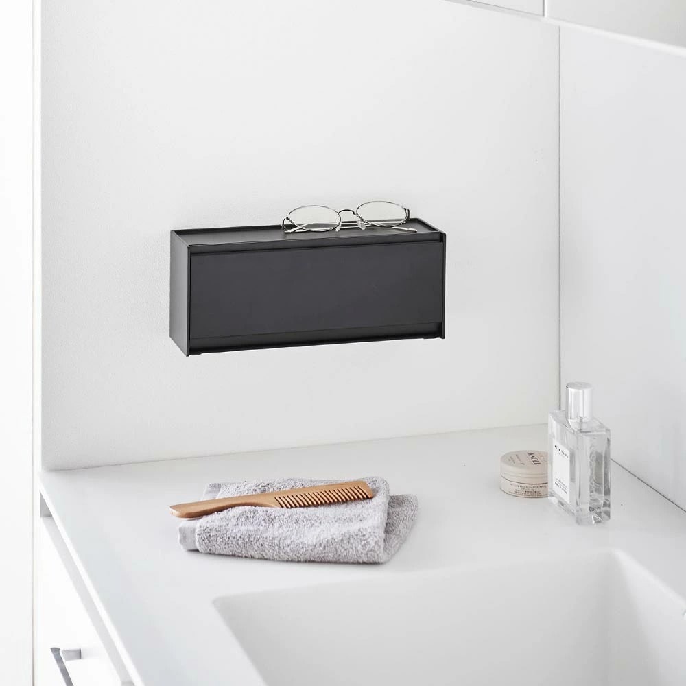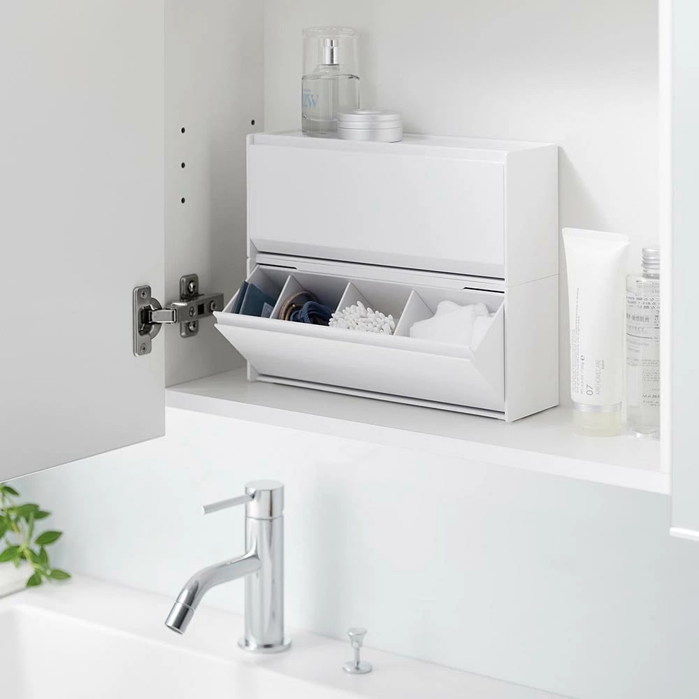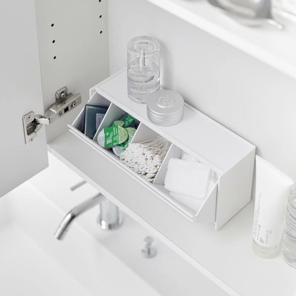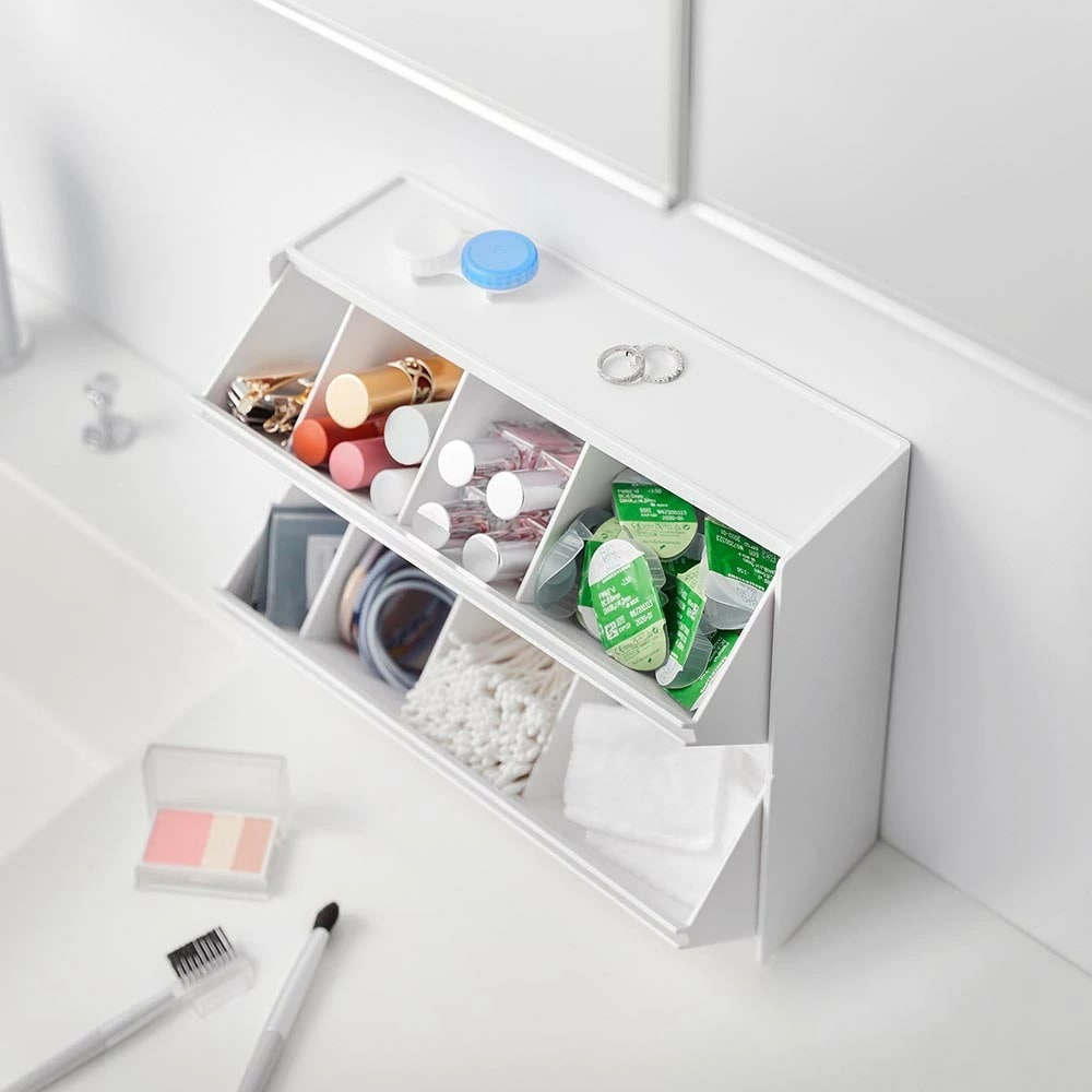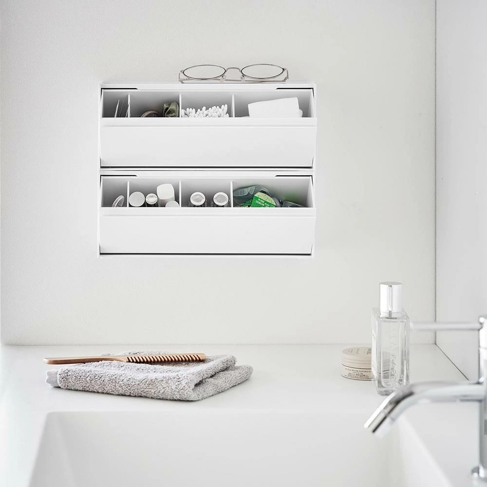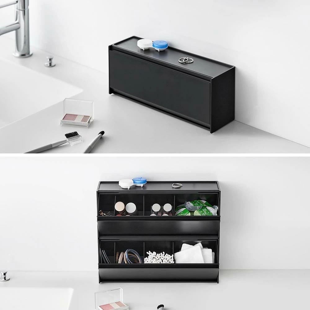 洗面小物やコスメ用品などの、細々とした物の収納にピッタリな石こうボード壁対応の収納ケースです。綿棒・コットン・使い捨てコンタクトレンズなどの洗面小物、コスメ用品など、細かくて収納に困る物を、洗面所の手に取りやすい場所に隠しながら浮かせて収納できます。浮かせることで洗面台の掃除がしやすく衛生的です。 ケースはフラップ式で片手で簡単に開閉でき、様々な小物を分類できる便利な仕切りが3枚付属しています。 また、底面にはシリコーンの滑り止め付きで、置き型の収納ケースとしても使用できます。鏡裏の収納棚や洗面台などの僅かなスペースに収まるコンパクトなサイズなので、場所をとりません。 シンプルな外観なので、生活感を隠しながらスタイリッシュに収納できます。 また、こちらのケースはスタッキングにも対応しております。収納したい小物が増えた時や、人ごとに使い分けたい時などに、複数個重ねて設置するのもオススメです。