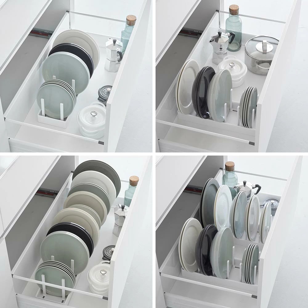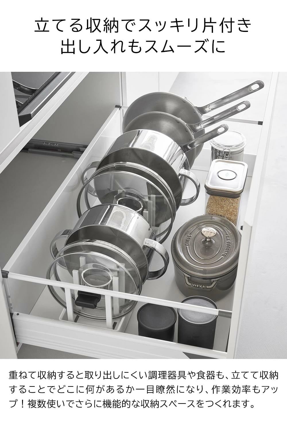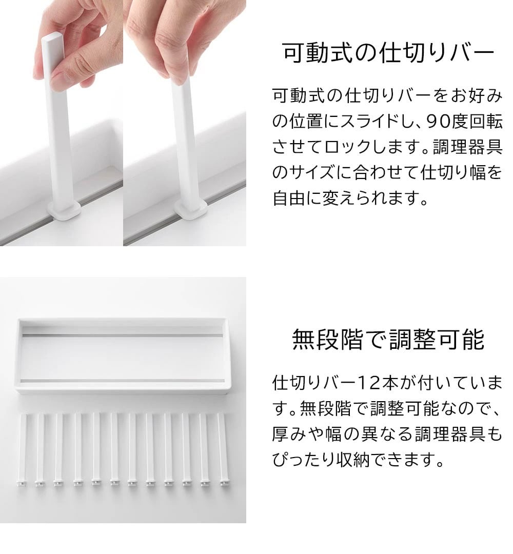 シンク下の引き出しに鍋蓋やフライパンを立てて収納できる、幅40cmの収納スタンド。 仕切りバーは可動式で、鍋蓋やフライパンのサイズに合わせて無段階で調整が可能です。 本体上部にはシリコーン製の滑り止めクッションが付いていて、調理器具を収納した時の取っ手の位置をキープしたまま自立します。 取っ手が上を向いていると、使いたい調理器具がサッと手に取れて快適! 本体裏面にも滑り止めが付いていて、引き出しの開閉時にずれにくく傷から守ります。 食器スタンドとして食器棚への設置もおすすめです。 イメージとして複数個を使用した写真を掲載しておりますが、こちらは「シンク下幅調節鍋蓋&フライパン収納スタンド タワー W40」単品でのお届けとなります。