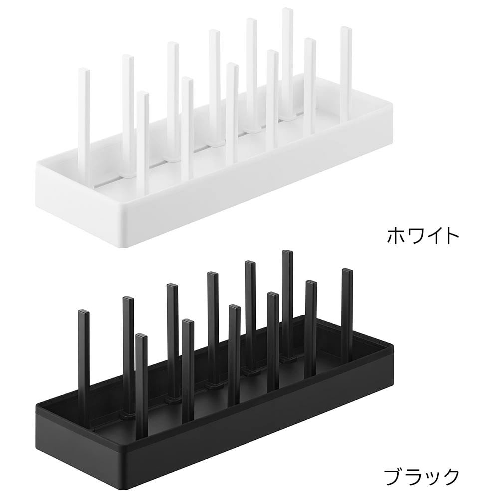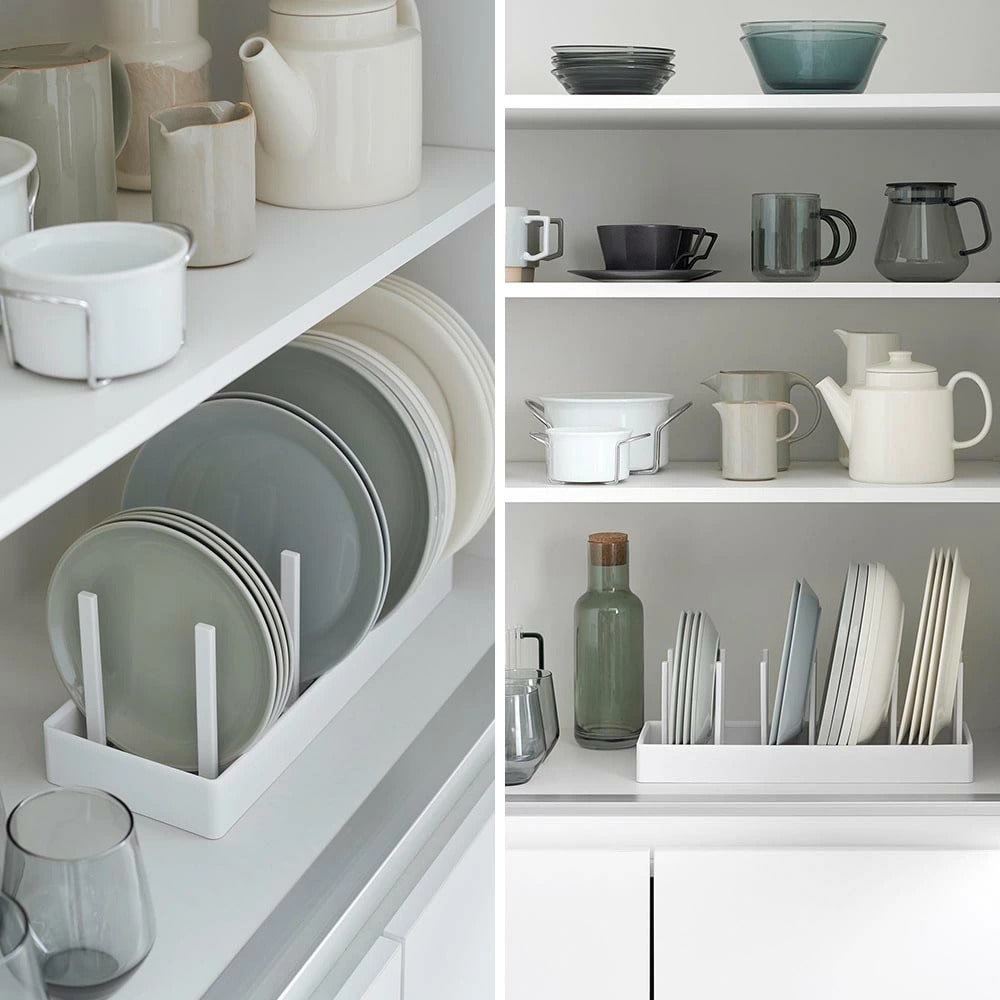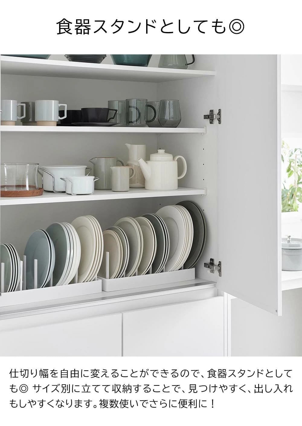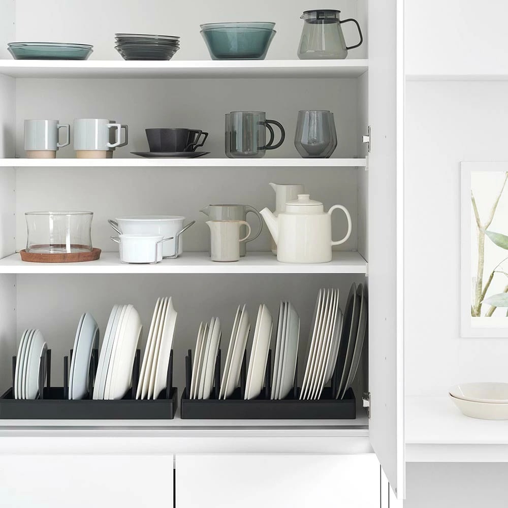 シンク下の引き出しに鍋蓋やフライパンを立てて収納できる、幅40cmの収納スタンド。 仕切りバーは可動式で、鍋蓋やフライパンのサイズに合わせて無段階で調整が可能です。 本体上部にはシリコーン製の滑り止めクッションが付いていて、調理器具を収納した時の取っ手の位置をキープしたまま自立します。 取っ手が上を向いていると、使いたい調理器具がサッと手に取れて快適! 本体裏面にも滑り止めが付いていて、引き出しの開閉時にずれにくく傷から守ります。 食器スタンドとして食器棚への設置もおすすめです。 イメージとして複数個を使用した写真を掲載しておりますが、こちらは「シンク下幅調節鍋蓋&フライパン収納スタンド タワー W40」単品でのお届けとなります。