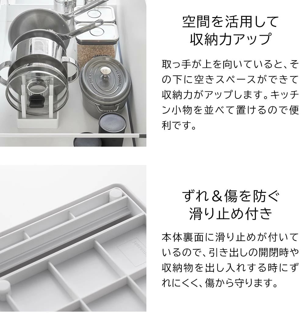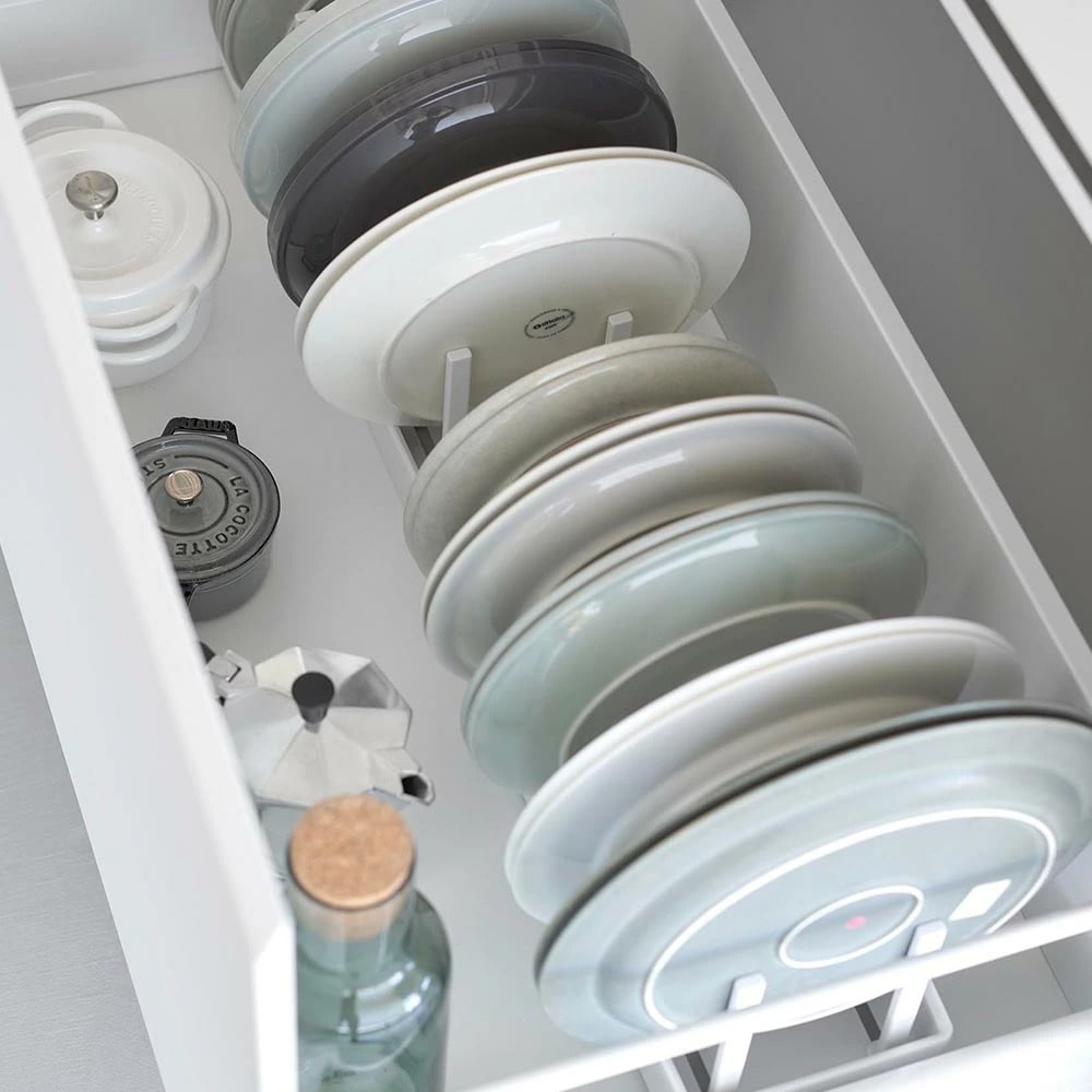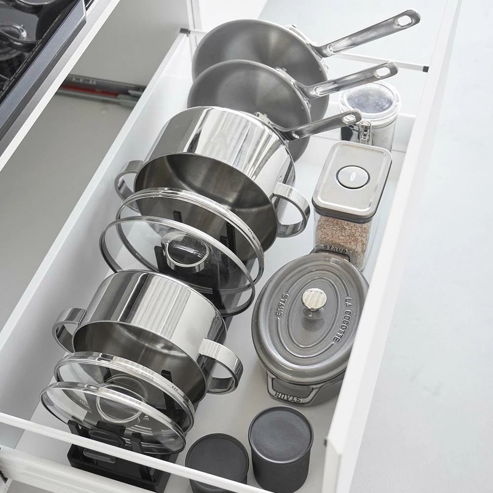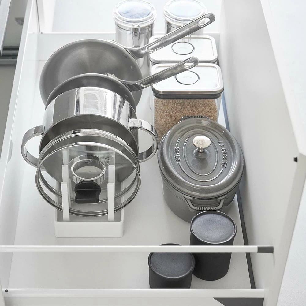 シンク下の引き出しに鍋蓋やフライパンを立てて収納できる、幅40cmの収納スタンド。 仕切りバーは可動式で、鍋蓋やフライパンのサイズに合わせて無段階で調整が可能です。 本体上部にはシリコーン製の滑り止めクッションが付いていて、調理器具を収納した時の取っ手の位置をキープしたまま自立します。 取っ手が上を向いていると、使いたい調理器具がサッと手に取れて快適! 本体裏面にも滑り止めが付いていて、引き出しの開閉時にずれにくく傷から守ります。 食器スタンドとして食器棚への設置もおすすめです。