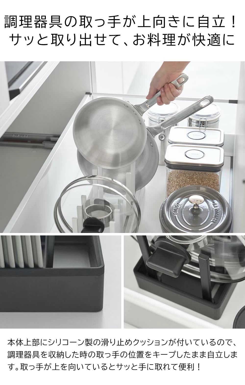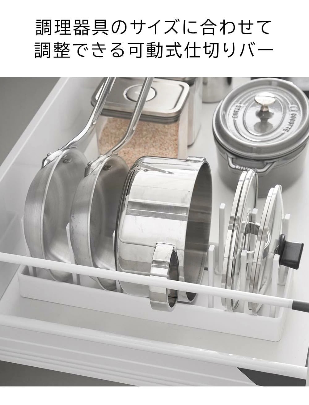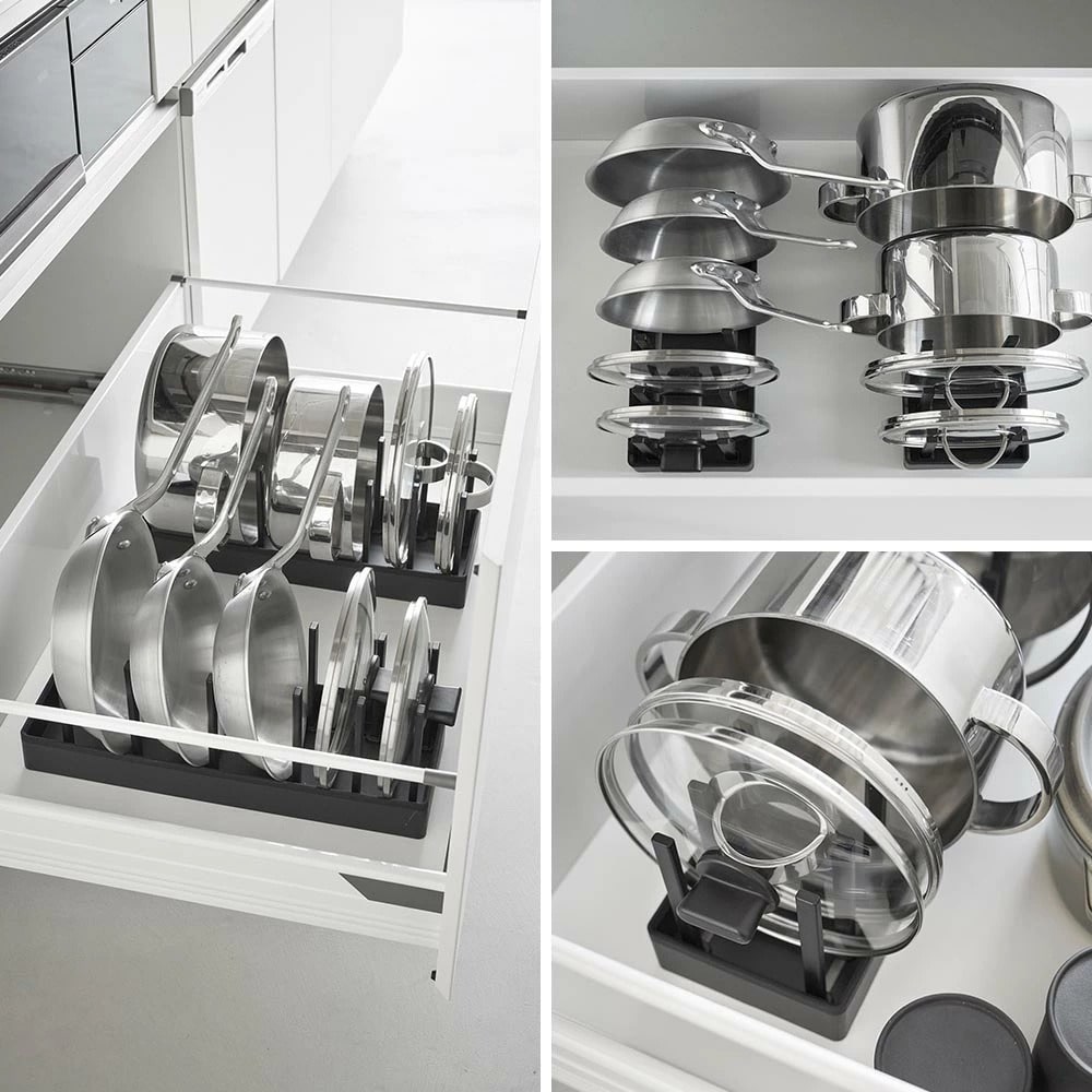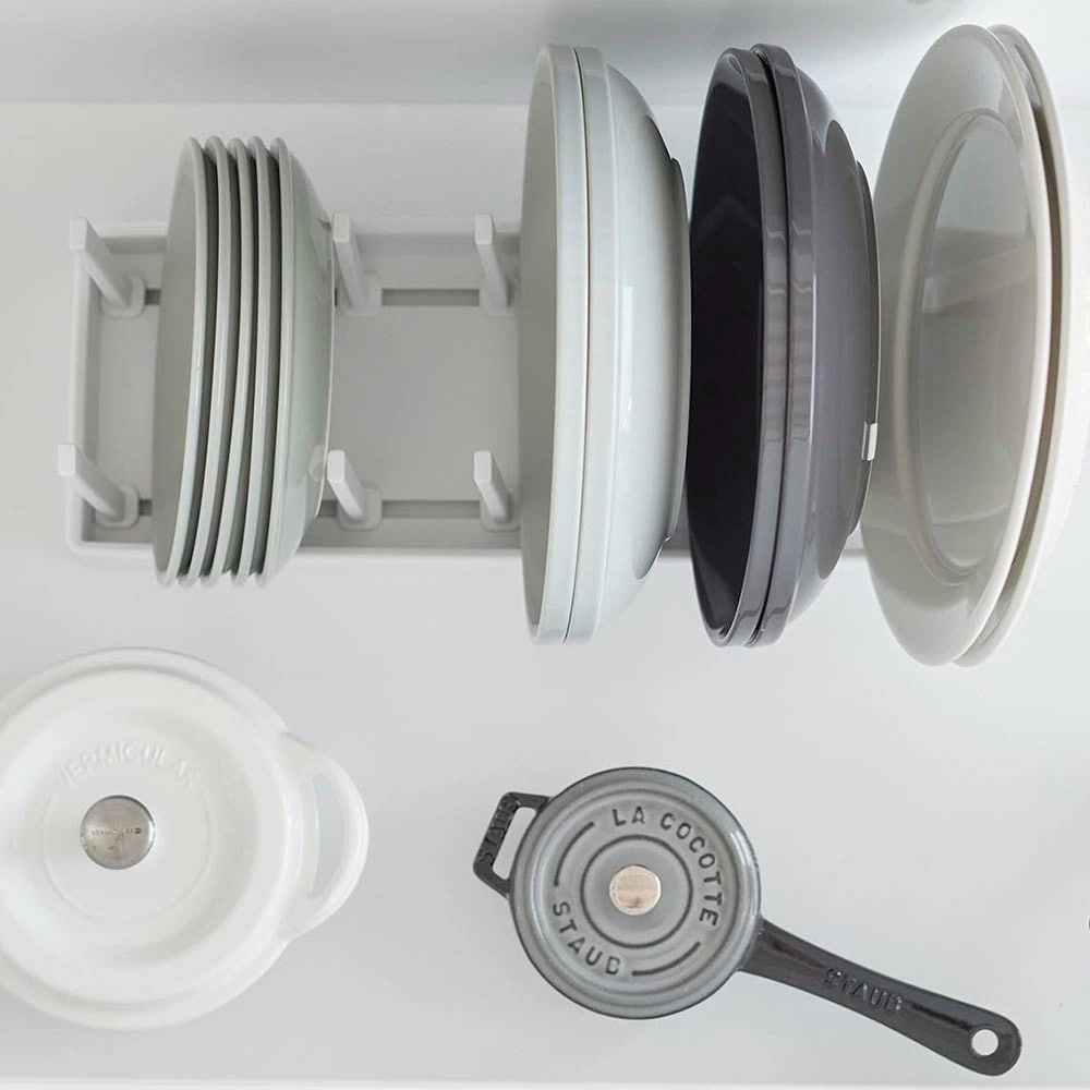 シンク下の引き出しに鍋蓋やフライパンを立てて収納できる、幅40cmの収納スタンド。 仕切りバーは可動式で、鍋蓋やフライパンのサイズに合わせて無段階で調整が可能です。 本体上部にはシリコーン製の滑り止めクッションが付いていて、調理器具を収納した時の取っ手の位置をキープしたまま自立します。 取っ手が上を向いていると、使いたい調理器具がサッと手に取れて快適! 本体裏面にも滑り止めが付いていて、引き出しの開閉時にずれにくく傷から守ります。 食器スタンドとして食器棚への設置もおすすめです。