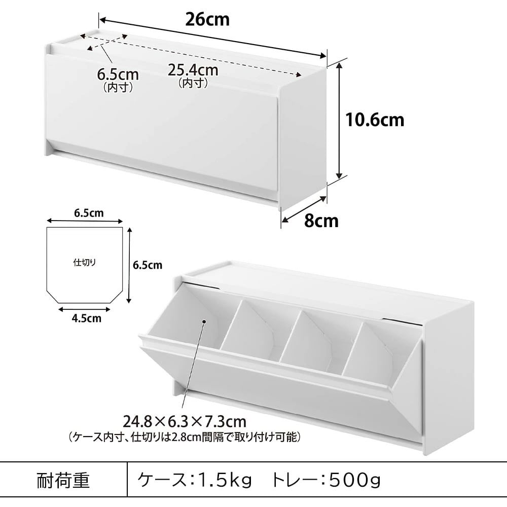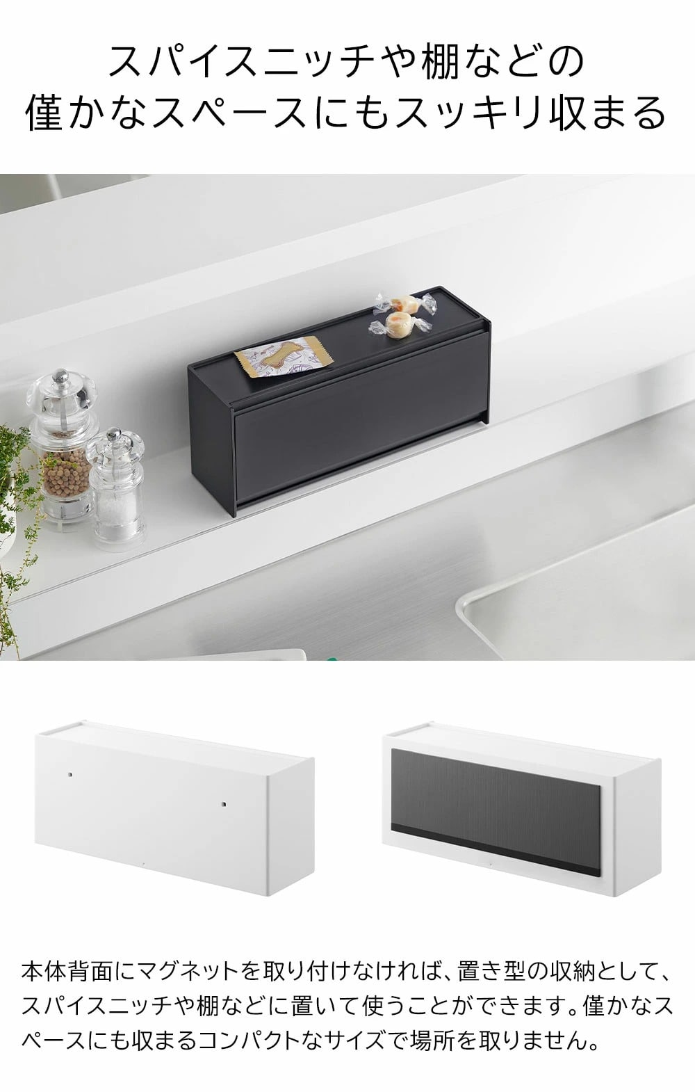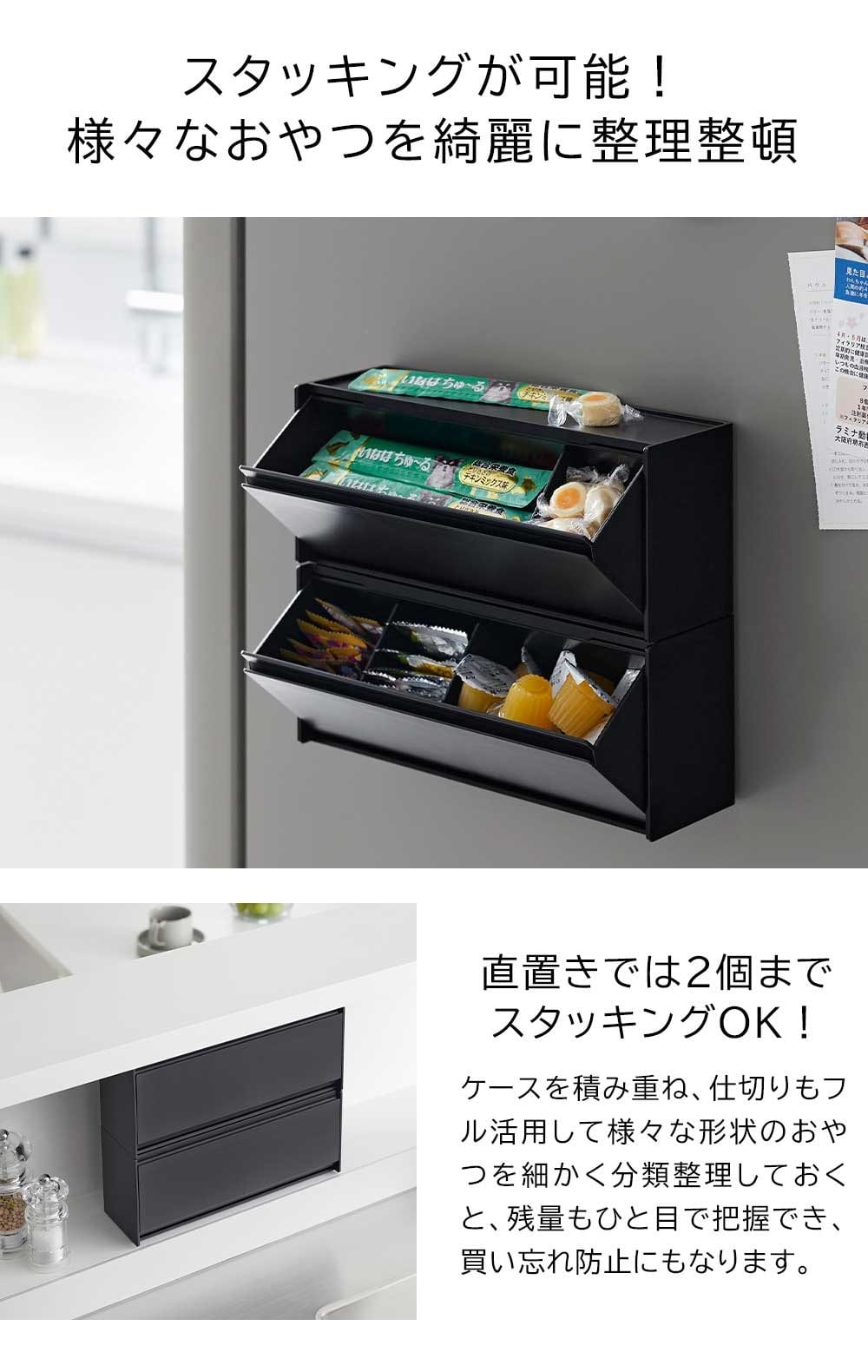 愛犬や愛猫に毎日与えるスティックパウチのおやつを約20本、手に取りやすい場所に隠しながら収納できる、マグネット設置型のおやつ収納ケースです。 冷蔵庫横やペット用品をまとめたスチールワゴンなどに設置しておけば、おやつを与えたい時にすぐに準備することができます。 浮かせて収納できるので、ペットの届かない場所に設置すれば、いたずら防止にもなり安心です。 本体の背面にマグネットを取り付けなければ、置き型の収納ケースとして、スパイスニッチや棚などに置いて使用できます。 ケースはフラップ式で簡単に開閉でき、おやつの分類に便利な仕切りが3枚付属しています。 シンプルな外観なので、生活感を隠しながらスタイリッシュに収納できます。 また、こちらのケースはスタッキングにも対応しております。おやつを細かく分類整理するために、複数個重ねて設置するのもオススメです。 イメージとして複数個を使用した写真を掲載しておりますが、こちらは「マグネットペットおやつ収納ケース タワー」単品でのお届けとなります。