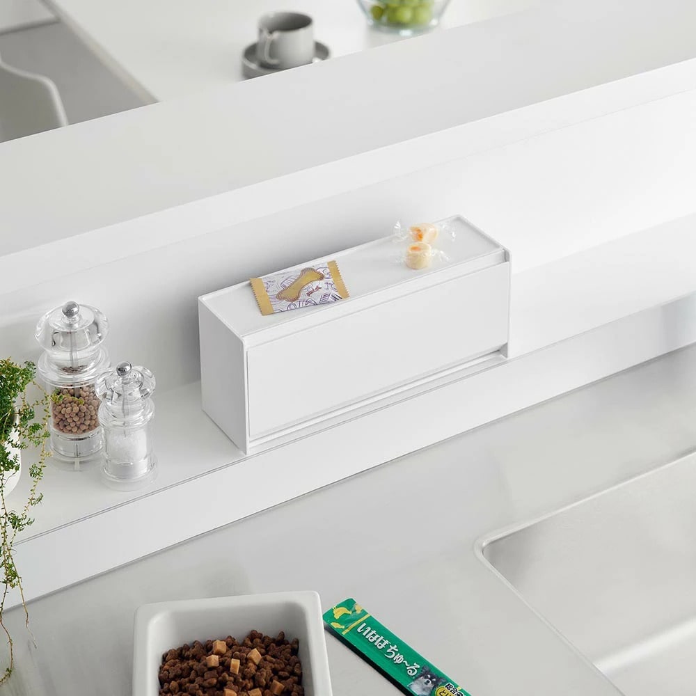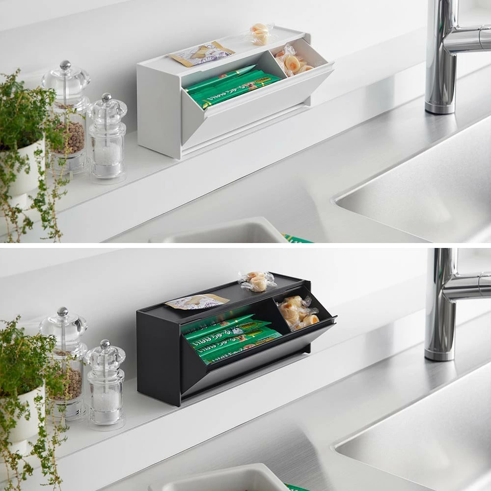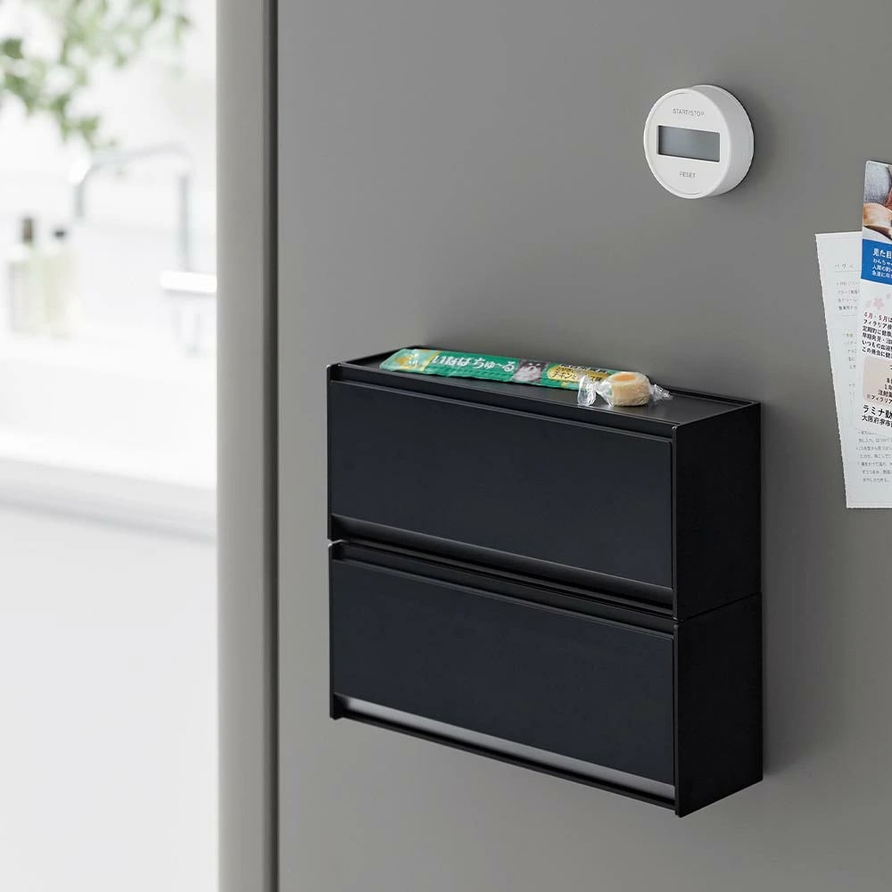 愛犬や愛猫に毎日与えるスティックパウチのおやつを約20本、手に取りやすい場所に隠しながら収納できる、マグネット設置型のおやつ収納ケースです。 冷蔵庫横やペット用品をまとめたスチールワゴンなどに設置しておけば、おやつを与えたい時にすぐに準備することができます。 浮かせて収納できるので、ペットの届かない場所に設置すれば、いたずら防止にもなり安心です。 本体の背面にマグネットを取り付けなければ、置き型の収納ケースとして、スパイスニッチや棚などに置いて使用できます。 ケースはフラップ式で簡単に開閉でき、おやつの分類に便利な仕切りが3枚付属しています。 シンプルな外観なので、生活感を隠しながらスタイリッシュに収納できます。 また、こちらのケースはスタッキングにも対応しております。おやつを細かく分類整理するために、複数個重ねて設置するのもオススメです。