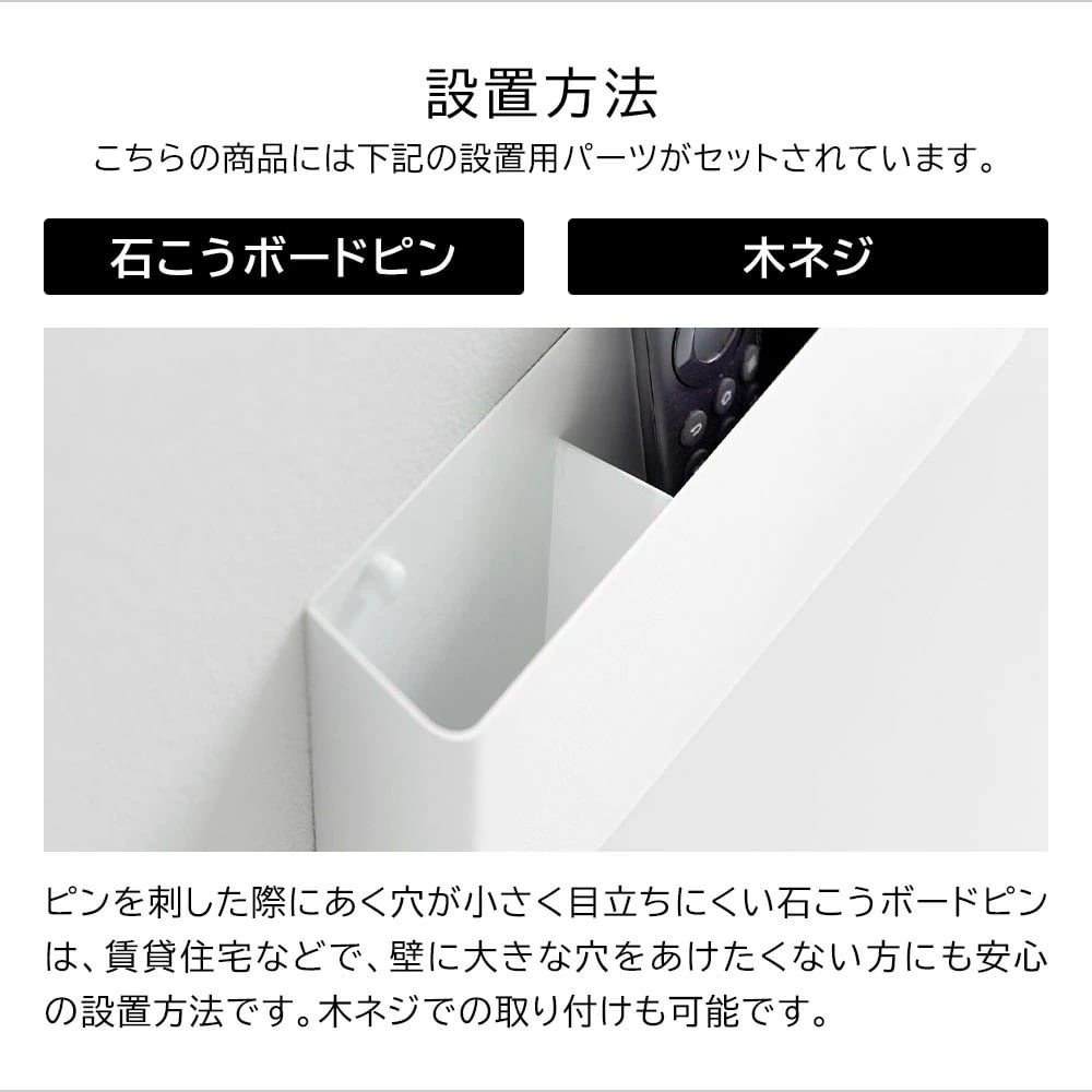 付属の石こうボードピンで壁面に取り付けられるリモコンホルダーです。 ホルダーの中に仕切りがあるので、小さなリモコンが倒れにくく、 テレビやエアコンなどのリモコンを1か所に集めて、浮かせて収納できます。 デスク周りに設置し、手帳やスマートフォンを収納するのもおすすめです。 設置方法は、壁の穴が目立ちにくい石こうボードピンの他に、木ネジでも取り付け可能です。