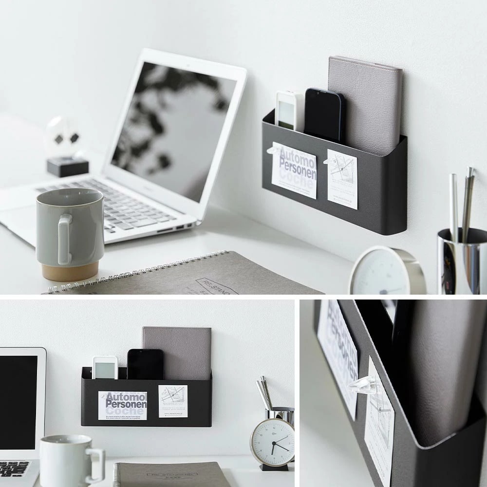 付属の石こうボードピンで壁面に取り付けられるリモコンホルダーです。 ホルダーの中に仕切りがあるので、小さなリモコンが倒れにくく、 テレビやエアコンなどのリモコンを1か所に集めて、浮かせて収納できます。 デスク周りに設置し、手帳やスマートフォンを収納するのもおすすめです。 設置方法は、壁の穴が目立ちにくい石こうボードピンの他に、木ネジでも取り付け可能です。 マグネットは付属いたしません。