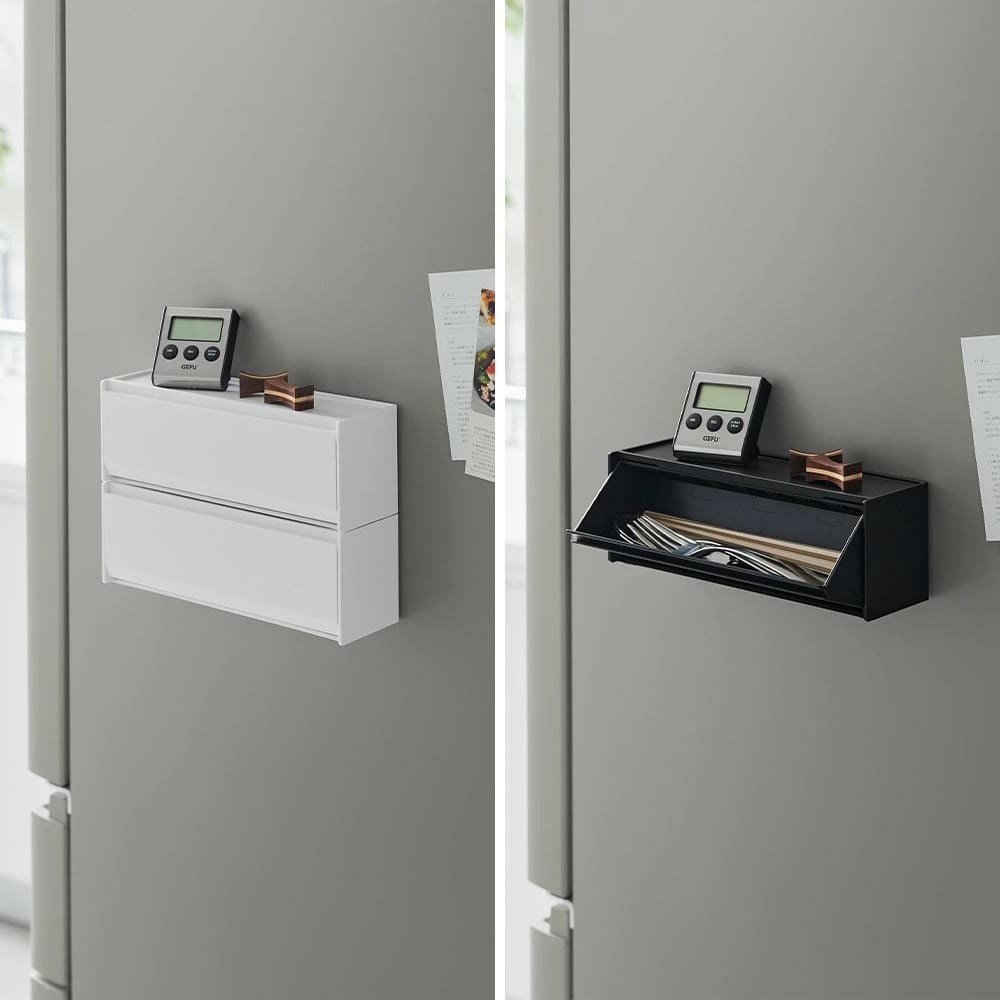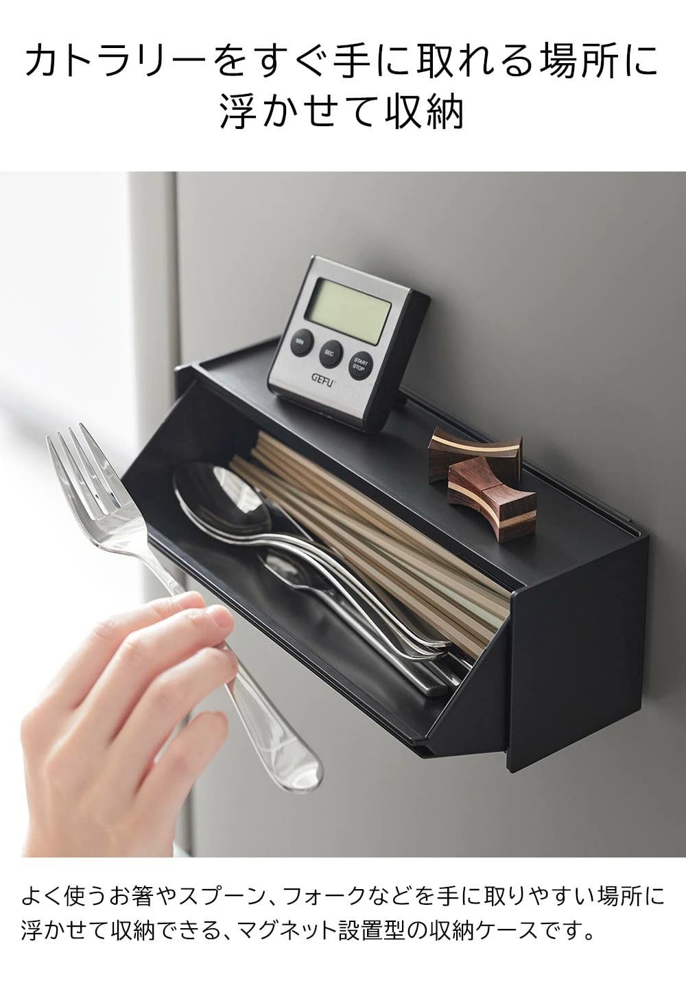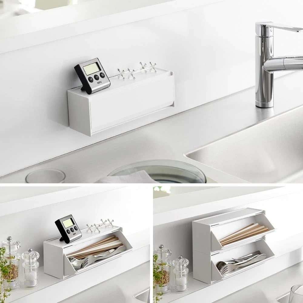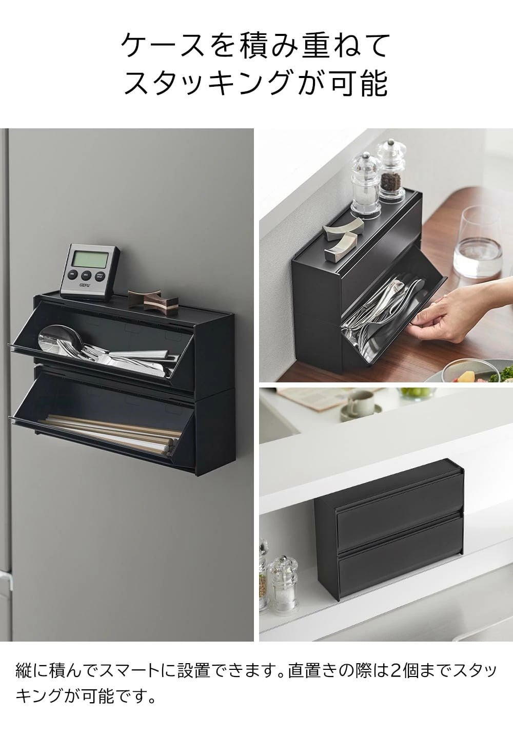 お箸やスプーン、フォークなどのカトラリーをまとめて収納できるケースです。 キッチンパネルや冷蔵庫横などにマグネットで取り付けたり、ダイニングテーブルやスパイスニッチなどに直置きするなど、場所を取らずスマートに設置できます。 斜めに開くフラップ式だから、中のカトラリーを片手でラクに取り出せます。使わない時は閉まっているので、埃やゴミが中に入ることもなく衛生的です。 天板がトレーになっているため、キッチンタイマーやスパイスなどを置いて、上部を有効活用できます。 また、こちらのケースはスタッキングにも対応しております。複数使いでカトラリーごとに分けて収納してスッキリ整頓できます。