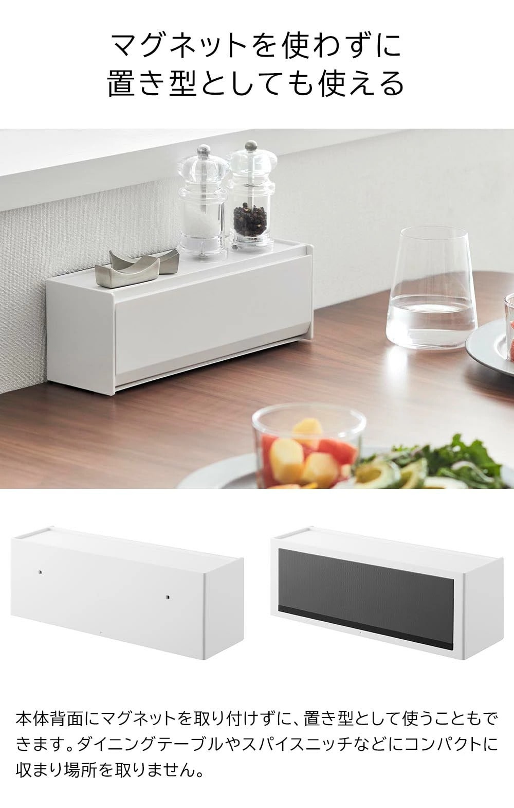 お箸やスプーン、フォークなどのカトラリーをまとめて収納できるケースです。 キッチンパネルや冷蔵庫横などにマグネットで取り付けたり、ダイニングテーブルやスパイスニッチなどに直置きするなど、場所を取らずスマートに設置できます。 斜めに開くフラップ式だから、中のカトラリーを片手でラクに取り出せます。使わない時は閉まっているので、埃やゴミが中に入ることもなく衛生的です。 天板がトレーになっているため、キッチンタイマーやスパイスなどを置いて、上部を有効活用できます。 また、こちらのケースはスタッキングにも対応しております。複数使いでカトラリーごとに分けて収納してスッキリ整頓できます。 イメージとして複数個を使用した写真を掲載しておりますが、こちらは「マグネットカトラリーケース タワー」単品でのお届けとなります。