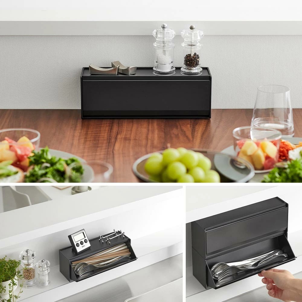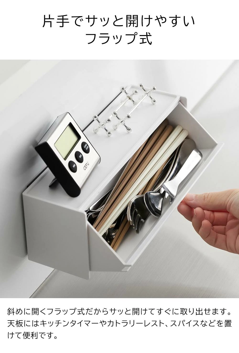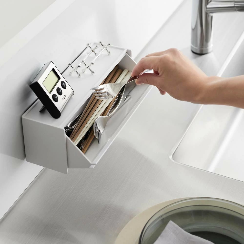 カトラリーをまとめて収納 壁面に浮かせても直置きでも 使えるフラップ式収納ケース