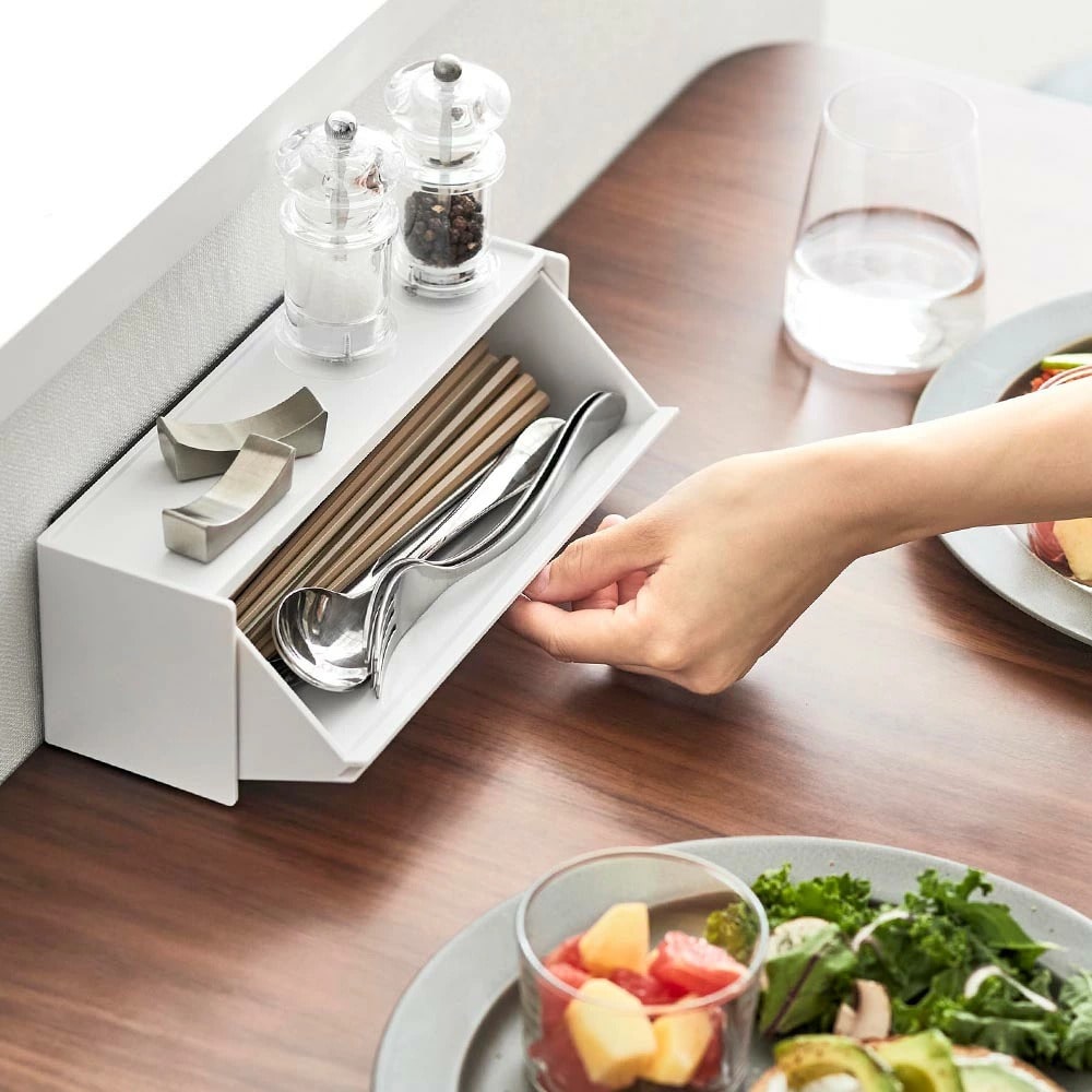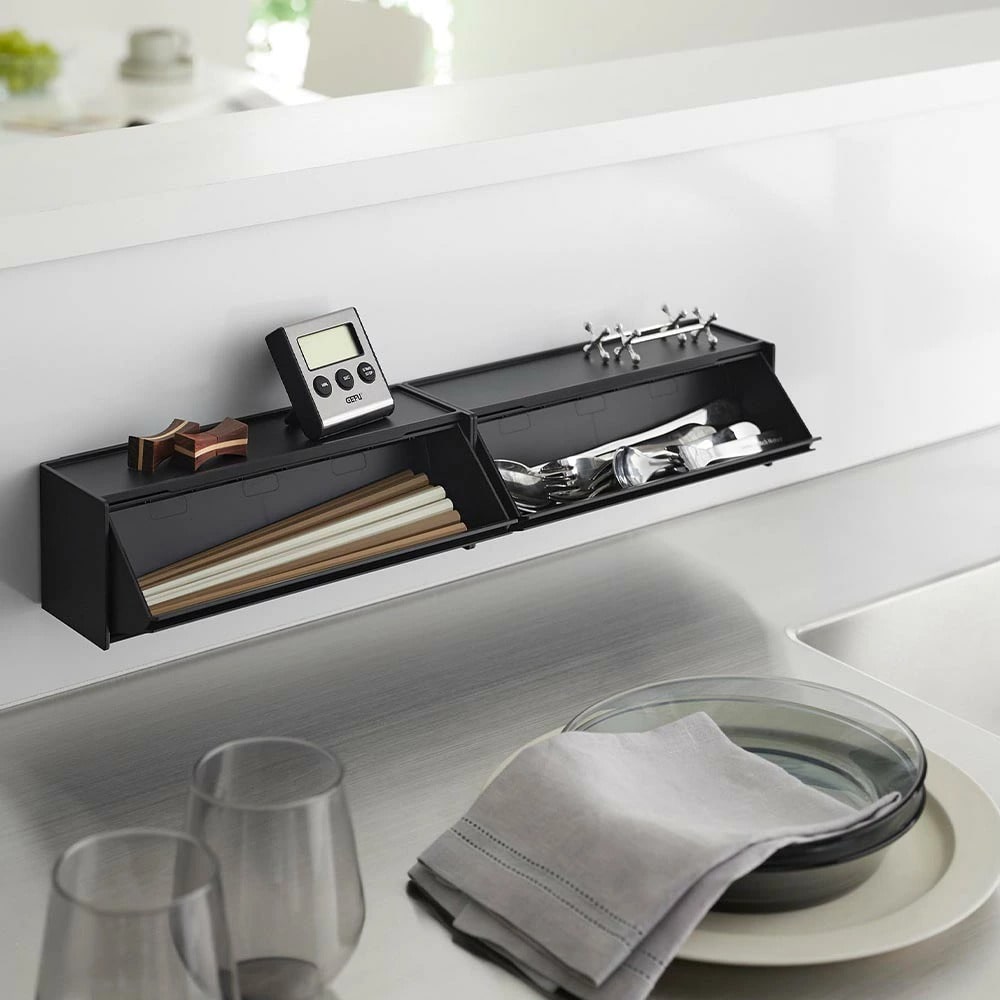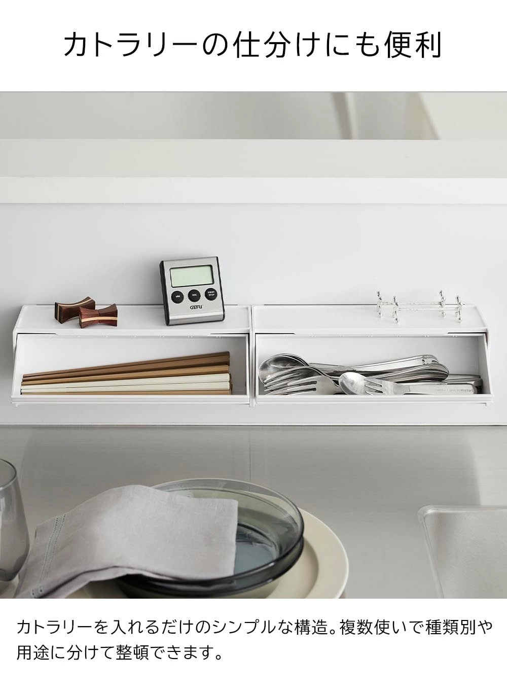 カトラリーをまとめて収納 壁面に浮かせても直置きでも 使えるフラップ式収納ケース