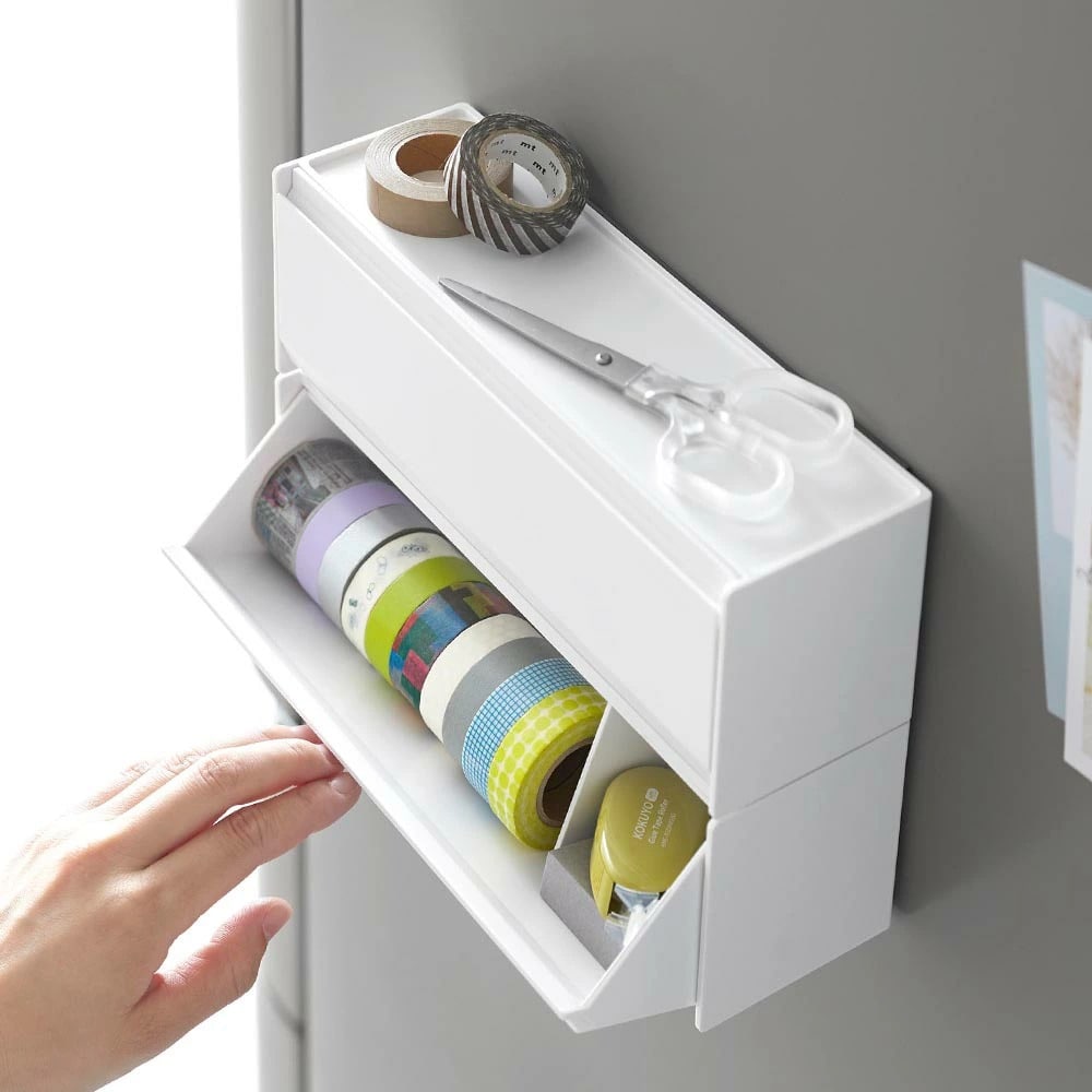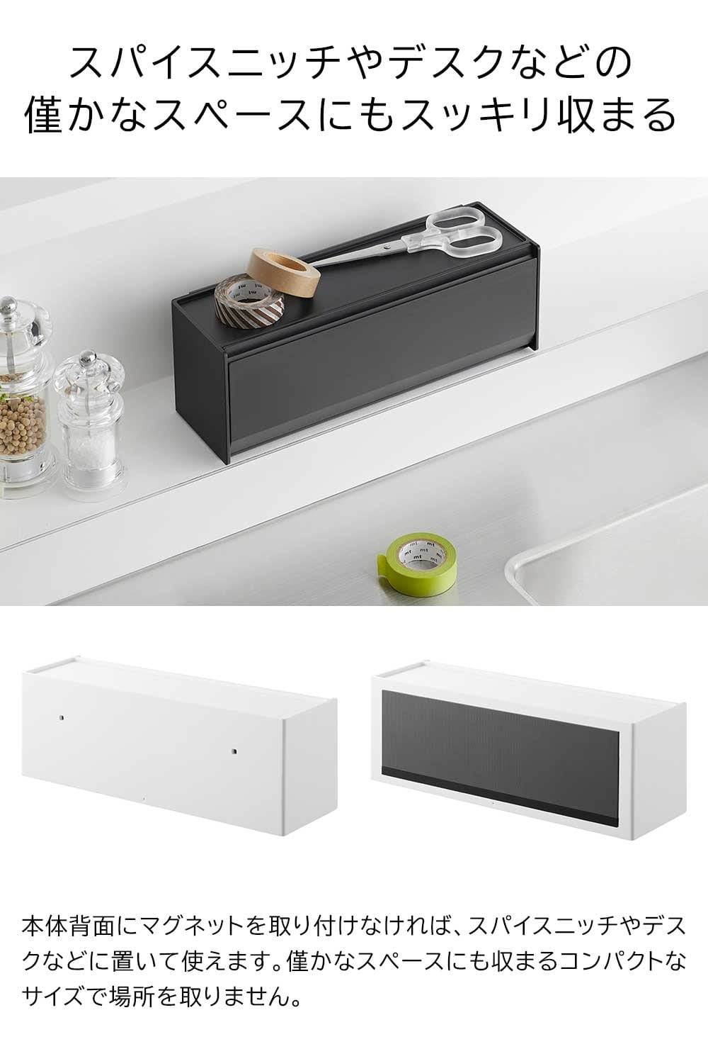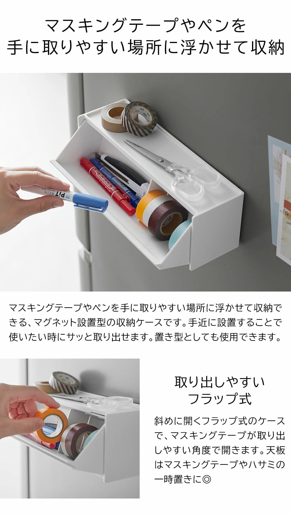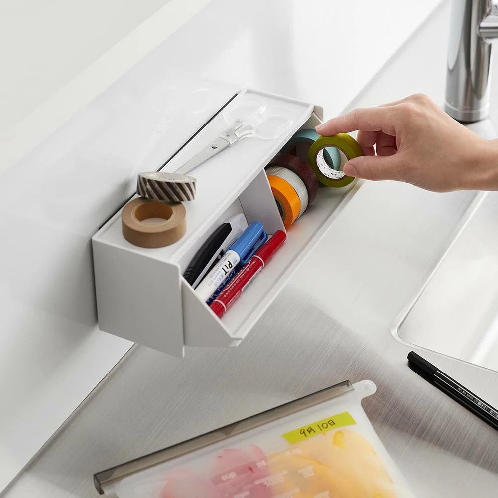 マスキングテープやペンが取り出しやすく、手近な場所に設置できる収納ケースです。シンプルな外観で生活感を隠し、スタイリッシュに空間に馴染みます。 マグネットで冷蔵庫やキッチンパネルなどにペタッと貼って浮かせて収納できるので、食品保存用のラベリングや封留めが必要な時に、その場ですぐに使えて便利です。ケースはフラップ式で斜めに開き、マスキングテープが取り出しやすい角度に設計されています。天板はトレーにもなり、ハサミや使用途中のマスキングテープをちょい置きしても◎ マグネットを取り付けなければ直置きの収納ケースとしても使用できます。スパイスニッチやデスクのちょっとしたスペースにも収まるコンパクトな大きさで、スタッキングも可能です。