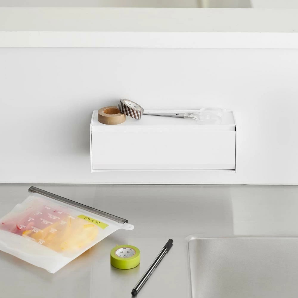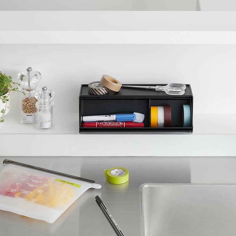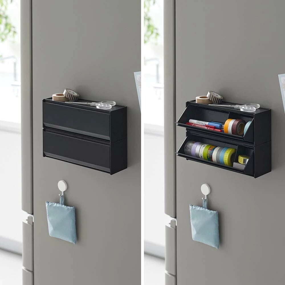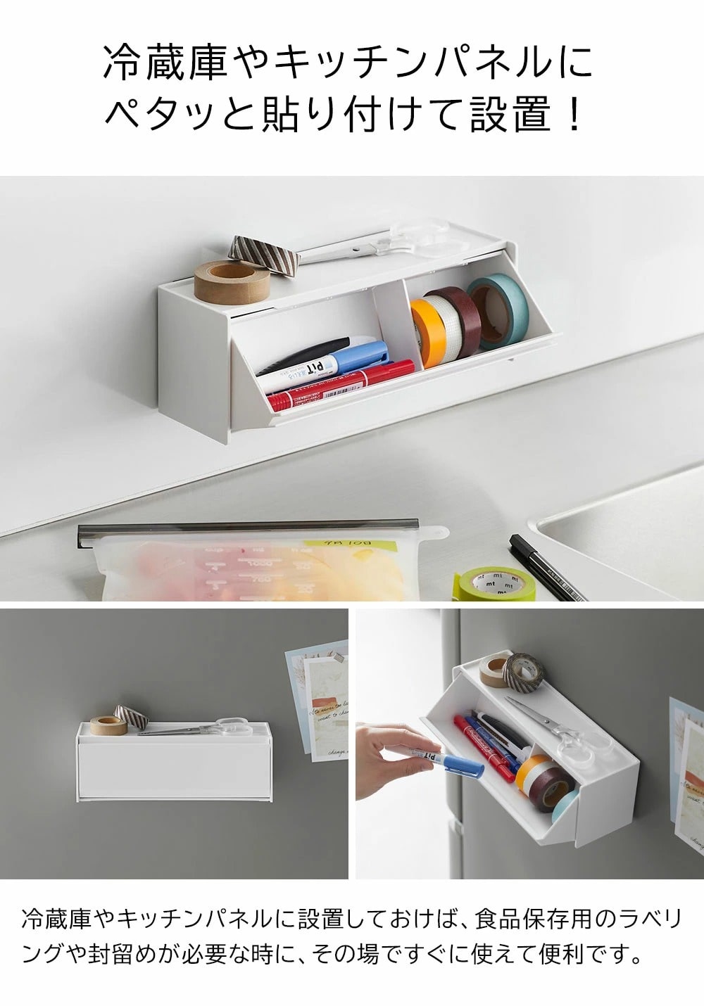 マスキングテープやペンが取り出しやすく、手近な場所に設置できる収納ケースです。シンプルな外観で生活感を隠し、スタイリッシュに空間に馴染みます。 マグネットで冷蔵庫やキッチンパネルなどにペタッと貼って浮かせて収納できるので、食品保存用のラベリングや封留めが必要な時に、その場ですぐに使えて便利です。ケースはフラップ式で斜めに開き、マスキングテープが取り出しやすい角度に設計されています。天板はトレーにもなり、ハサミや使用途中のマスキングテープをちょい置きしても◎ マグネットを取り付けなければ直置きの収納ケースとしても使用できます。スパイスニッチやデスクのちょっとしたスペースにも収まるコンパクトな大きさで、スタッキングも可能です。