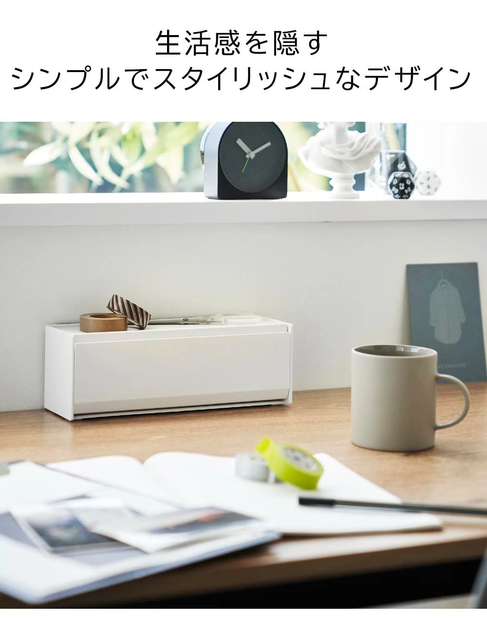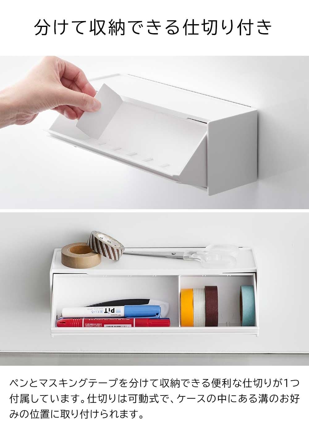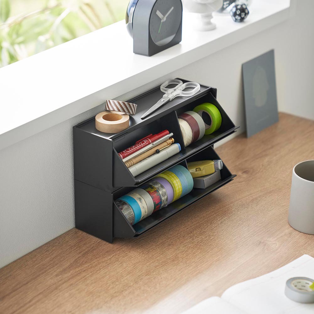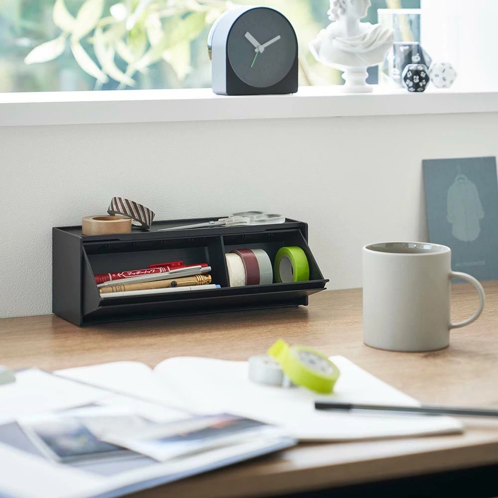 マスキングテープやペンが取り出しやすく、手近な場所に設置できる収納ケースです。シンプルな外観で生活感を隠し、スタイリッシュに空間に馴染みます。 マグネットで冷蔵庫やキッチンパネルなどにペタッと貼って浮かせて収納できるので、食品保存用のラベリングや封留めが必要な時に、その場ですぐに使えて便利です。ケースはフラップ式で斜めに開き、マスキングテープが取り出しやすい角度に設計されています。天板はトレーにもなり、ハサミや使用途中のマスキングテープをちょい置きしても◎ マグネットを取り付けなければ直置きの収納ケースとしても使用できます。スパイスニッチやデスクのちょっとしたスペースにも収まるコンパクトな大きさで、スタッキングも可能です。