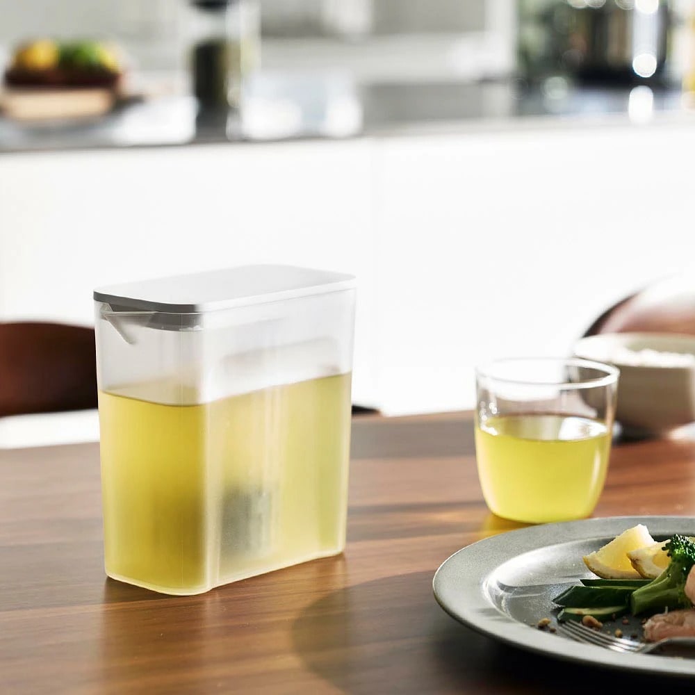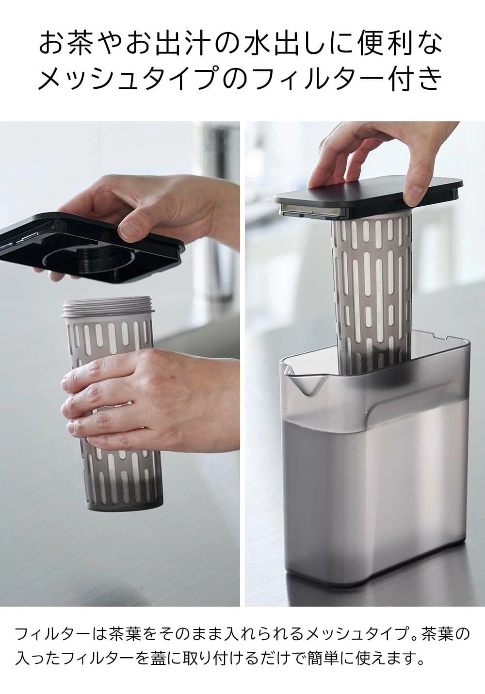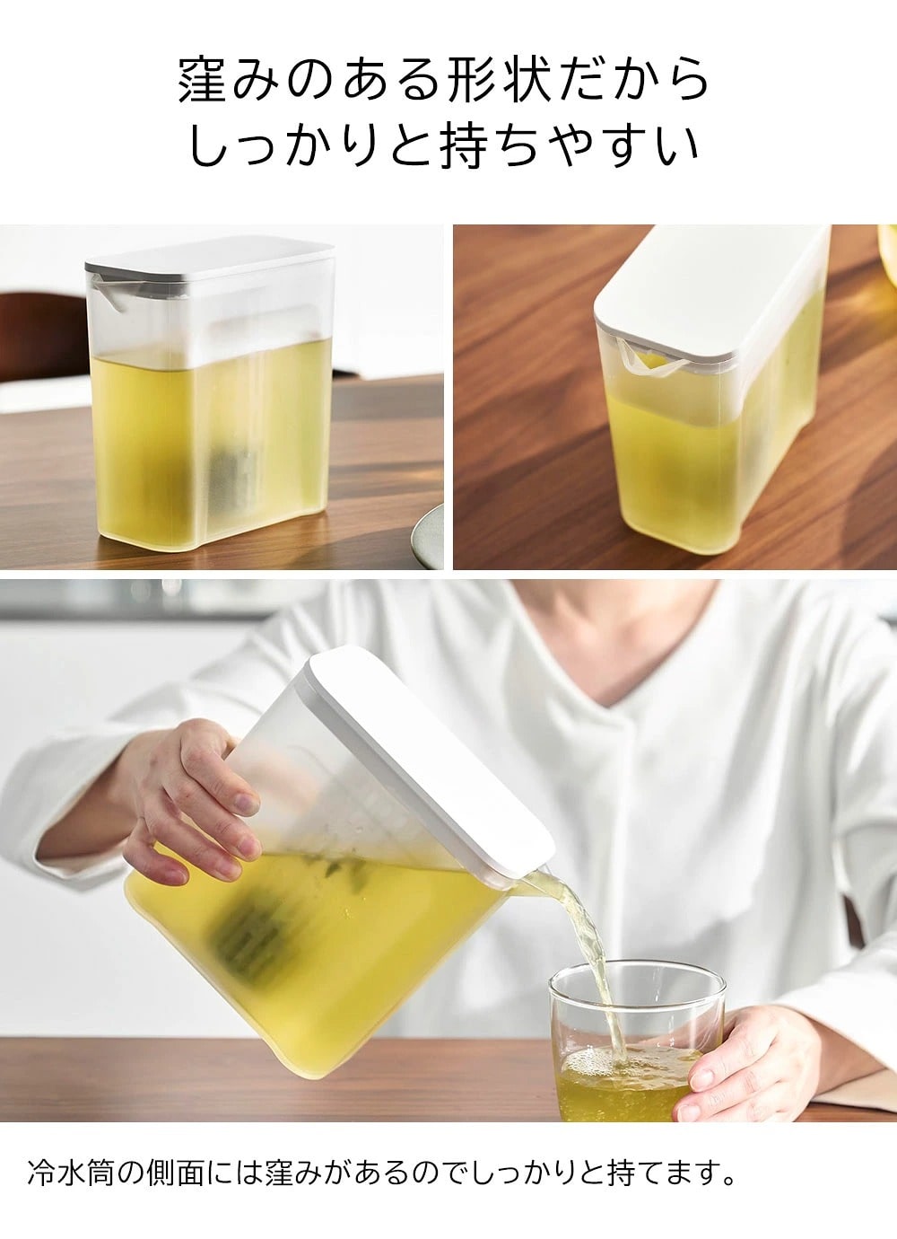 冷蔵庫の棚とドアポケットの両方に収まるコンパクトな冷水筒です。茶葉をそのまま入れられるメッシュタイプのフィルター付き。茶葉を入れたフィルターを蓋に取り付けるだけで簡単に使えます。フィルターが底まで届くので少量の水でも抽出が可能。お好みの濃さになったら、蓋を引き上げて容器の縁に掛けておくと、最後の一滴まで注ぎきることができます。お茶だけでなく、お出汁を水出しする際にも便利です。 容器の側面にはくぼみがあり、手が小さめの方でもしっかりと持ちやすい形状です。 パーツは全て分解できるので隅々まで洗えて衛生的。開口部が広いので底まで手が届き、きれいに洗えます。食洗機対応なのでお手入れもラクラクです。