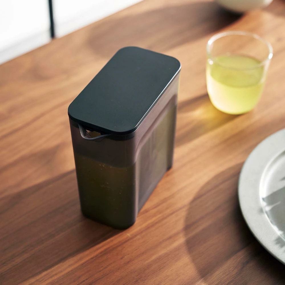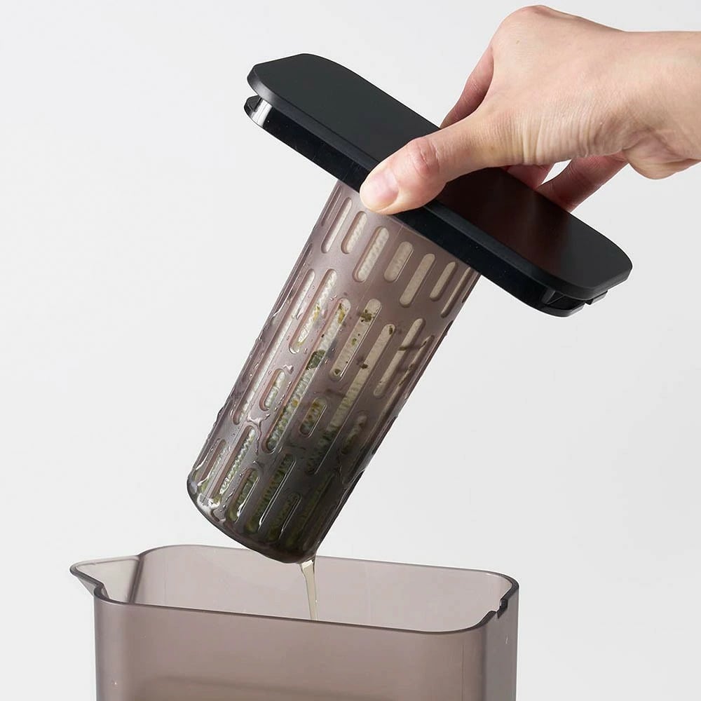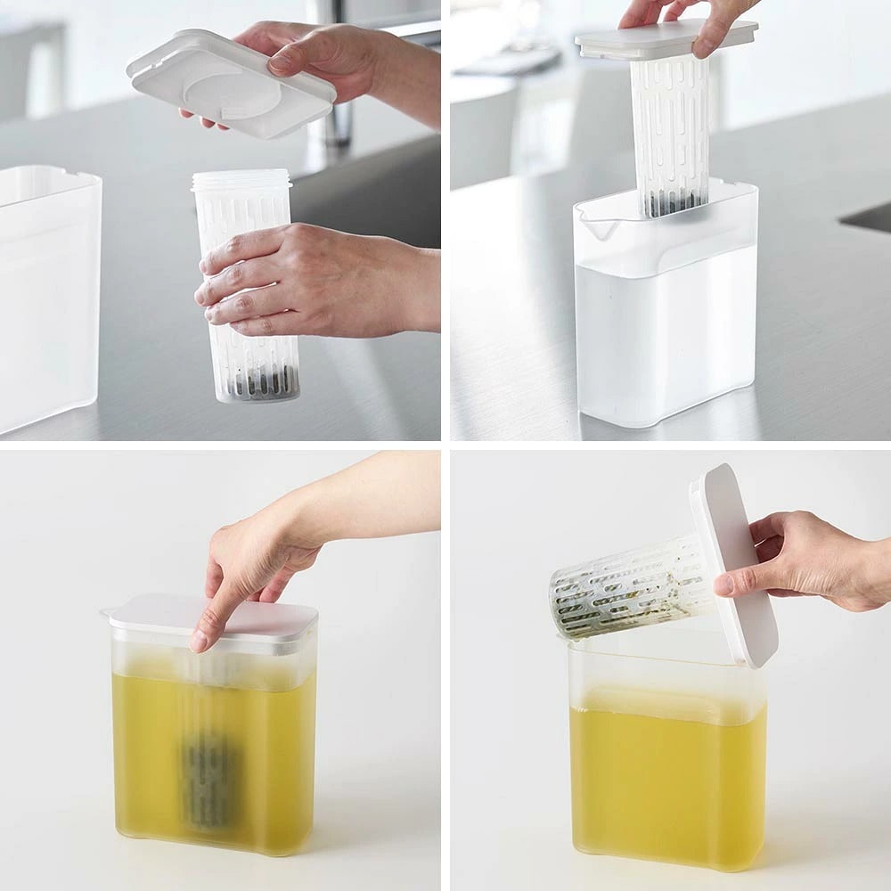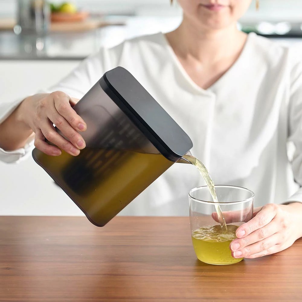冷蔵庫の棚とドアポケットの両方に収まるコンパクトな冷水筒です。茶葉をそのまま入れられるメッシュタイプのフィルター付き。茶葉を入れたフィルターを蓋に取り付けるだけで簡単に使えます。フィルターが底まで届くので少量の水でも抽出が可能。お好みの濃さになったら、蓋を引き上げて容器の縁に掛けておくと、最後の一滴まで注ぎきることができます。お茶だけでなく、お出汁を水出しする際にも便利です。 容器の側面にはくぼみがあり、手が小さめの方でもしっかりと持ちやすい形状です。 パーツは全て分解できるので隅々まで洗えて衛生的。開口部が広いので底まで手が届き、きれいに洗えます。食洗機対応なのでお手入れもラクラクです。