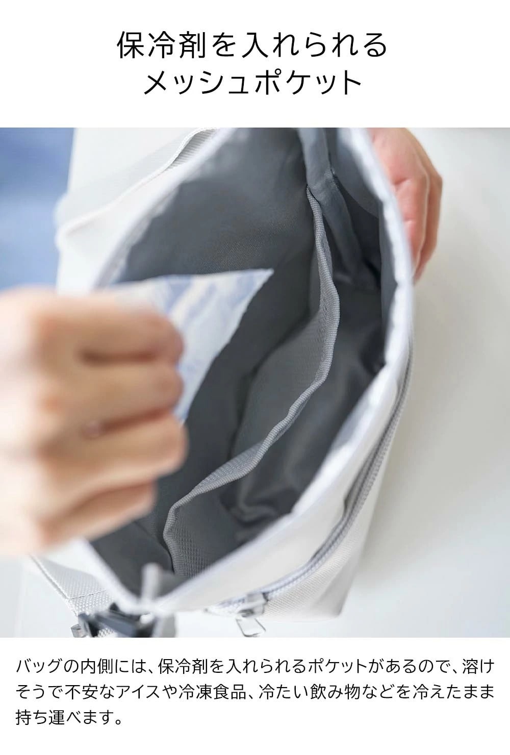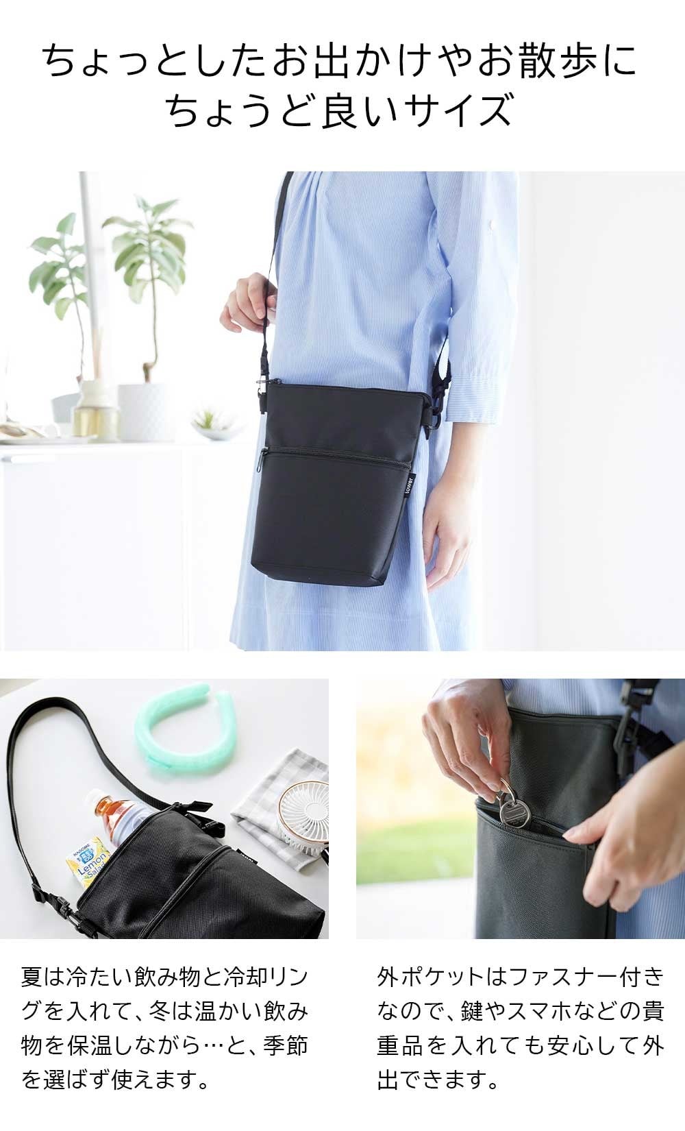 アイスや冷凍食品、ホットスナックなど、コンビニやスーパーでちょい買いした物を、 保冷・保温しながら持ち帰りできる便利なミニバッグです。 コンパクトなサイズですが、500mLのロング缶が2本入ります。 お買い物以外にも、ちょっとしたお出掛けやお散歩などにちょうど良いサイズ。 夏は冷たい飲み物と冷却リングを入れて、冬は温かい飲み物を保温して持ち運べるので、 季節を選ばずお使いいただけます。 バッグには便利なポケットが2つ! 1つ目は内ポケット、保冷剤を入れられるメッシュポケットがあります。 2つ目は外ポケット、ファスナー付きで鍵やスマホなどを入れられます。 また、長さが調節できるショルダーストラップは取り外しも可能なので、 トートバッグなどに入れて、保冷・保温ができるバッグインバッグとしての使用もおすすめです。 外ポケットに保冷・保温機能はありません。