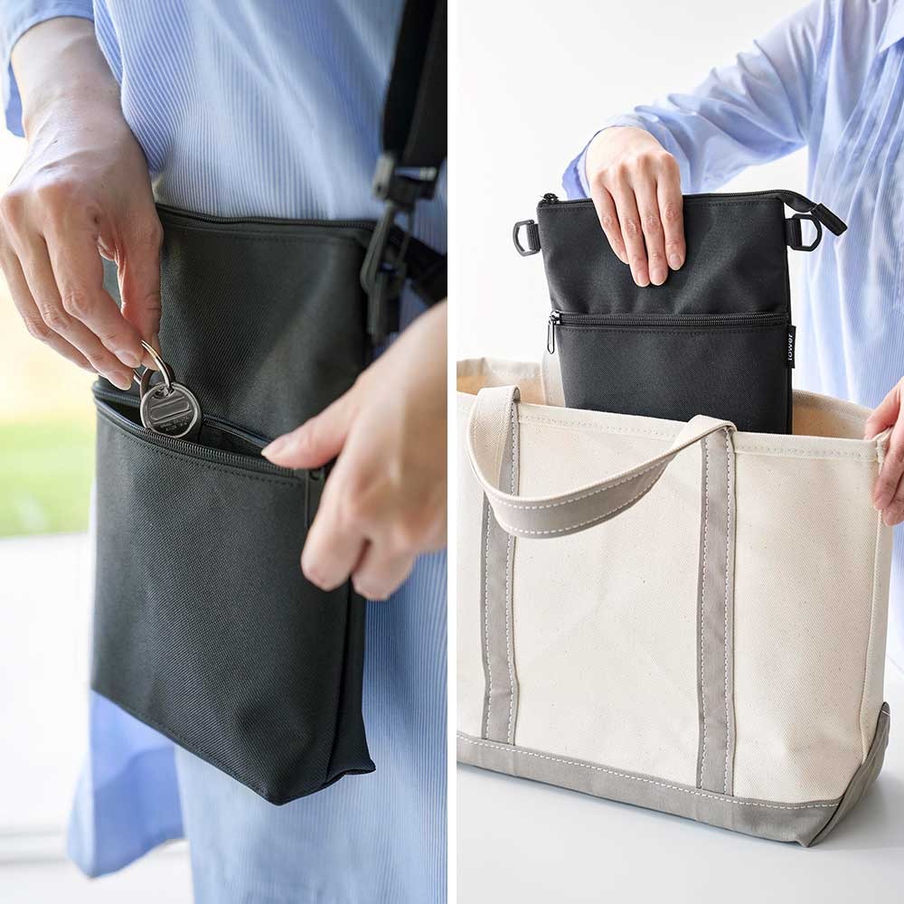 アイスや冷凍食品、ホットスナックなど、コンビニやスーパーでちょい買いした物を、 保冷・保温しながら持ち帰りできる便利なミニバッグです。 コンパクトなサイズですが、500mLのロング缶が2本入ります。 お買い物以外にも、ちょっとしたお出掛けやお散歩などにちょうど良いサイズ。 夏は冷たい飲み物と冷却リングを入れて、冬は温かい飲み物を保温して持ち運べるので、 季節を選ばずお使いいただけます。 バッグには便利なポケットが2つ! 1つ目は内ポケット、保冷剤を入れられるメッシュポケットがあります。 2つ目は外ポケット、ファスナー付きで鍵やスマホなどを入れられます。 また、長さが調節できるショルダーストラップは取り外しも可能なので、 トートバッグなどに入れて、保冷・保温ができるバッグインバッグとしての使用もおすすめです。