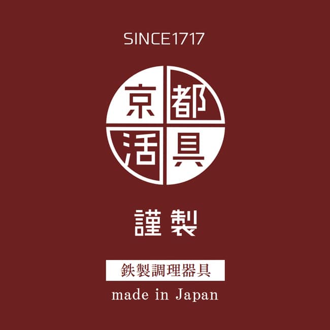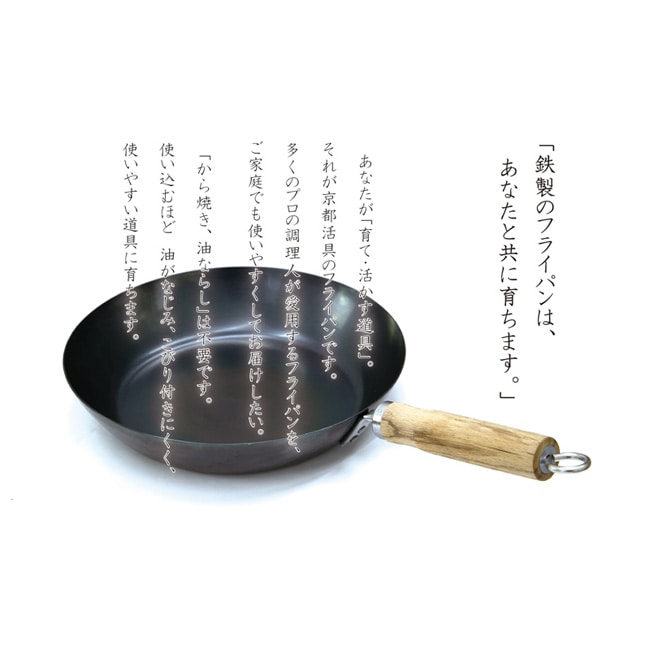ひと昔前までは、ご家庭の台所で当たり前の調理道具の一つの鉄フライパン。 重たさや錆びやすさを理由に、フッ素加工フライパンに人気が集まりましたが、 多くのプロの調理人が愛用する鉄フライパンをなんとか、もう一度ご家庭で使いやすい 鉄フライパンとしてお届けしたい。 そんな思いをもとに、京都活具は立ち上がりました。 重たさを軽減するために側面部分を最大限薄く削る。 もちろん、調理に必要な熱容量・強度を確保する厚さを残して。 錆びにくい鉄にするために直火による高度熱処理。 一枚一枚、職人がフライパン表面が真っ赤になるまで熱処理を施していきますが その温度なんと700℃以上。 職人が一枚一枚に熱処理をしていく姿はまるで魂を吹き込んでいくようです。 あとは、日々の調理と共に あなたが育ててください。 面倒な「から焼き、油ならし」は不要です。 使い込めば使い込むほど 油がなじみ、 こびり付きにくく、使いやすい永くご使用頂けるフライパンとなります。 ものづくりのDNAを脈々と受け継いで 職人が丁寧に一枚一枚、仕上げるフライパン。 鉄のフライパンは「あなたと共に育つフライパン」です。 少し手間のかかる存在かもしれませんが、かけて頂いた手間を裏切ることはありません。 あなたが「育て・活かす道具」。それが京都活具の鉄フライパンです。