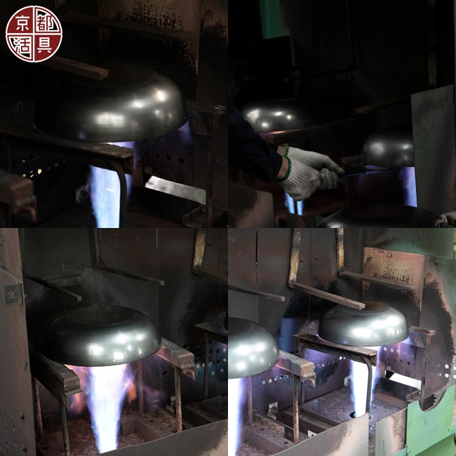 重たさを軽減するために側面部分を最大限薄く削る。 もちろん、調理に必要な熱容量・強度を確保する厚さを残して。 錆びにくい鉄にするために直火による高度熱処理。 一枚一枚、職人がフライパン表面が真っ赤になるまで熱処理を施していきますが その温度なんと700℃以上。 職人が一枚一枚に熱処理をしていく姿はまるで魂を吹き込んでいくようです。 鉄に油を馴染ませる最初のステップである「油ならし」。 鉄の表面の酸化皮膜の小さな穴に油をならし、表面に薄い油の膜を作る作業です。 通常の鉄のフライパンは、ご購入後、この「油ならし」作業が必要です。 京都活具の鉄フライパンは、全て、「油ならし」が終了しています。 工場にて、赤くなるまで熱した鉄フライパンに油を焼きつけ、「油ならし」をしております。 だから、ご自身が開けたそのタイミングですぐに使用する事ができます。