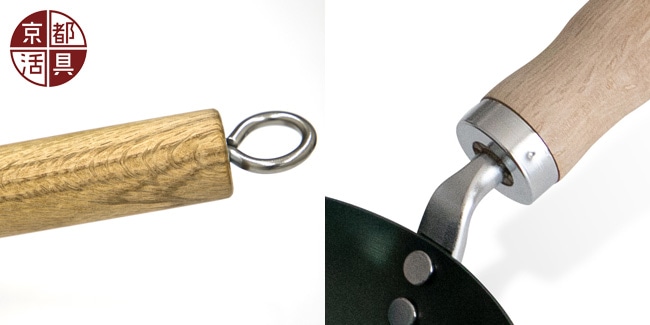 取っ手は、木刀や警棒、太鼓のばちにも使われる「樫の木」を使用しました。 その特徴は非常に硬く、湿気にも強い事が特徴です。 その樫の木をそのまま使用しております。 通常は、クリア塗装などの表面塗装を行いますが、あえて、無塗装にしてあります。 無塗装にする事で、木の質感、木目を感じてもらいたいと思っております。 また、先端にリングをついているので、引っ掛けて収納する事が可能です。 鉄のフライパンは、アルミのフライパンのようにこびりつくようになったら、 買い換えるといった商品ではありません。 何度も何度も使う事で、油が馴染み、使いやすい調理器具に育っていきます。 その中で、取っ手も使い込む程に味わいが出てきます。