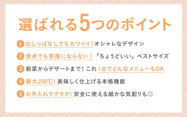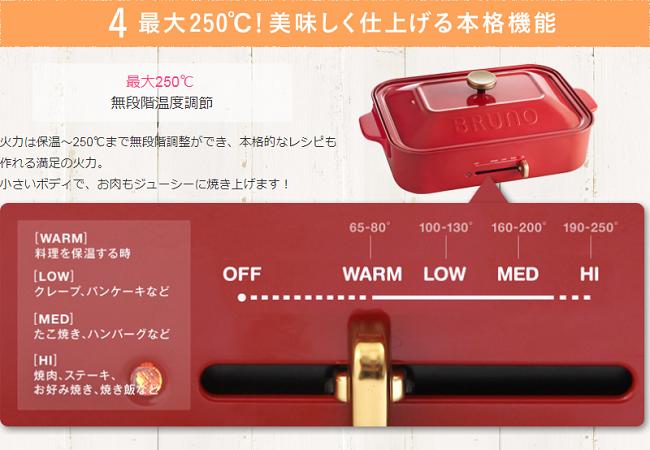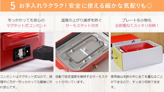 定格消費電力:1200W、プレート取り替え式、温度調節(65℃~250℃)、安全装置(サーモスタット/温度ヒューズ)、フッ素樹脂コートプレート