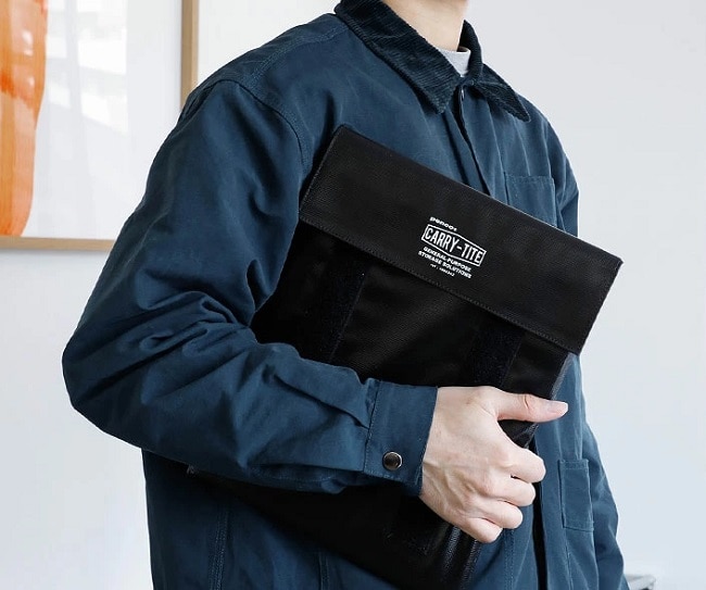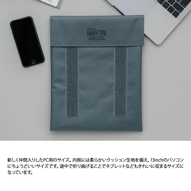 内側に柔らかいクッション生地を備えており、PC収納に最適。途中で折り曲げることでタブレットなどもきれいに収まります。