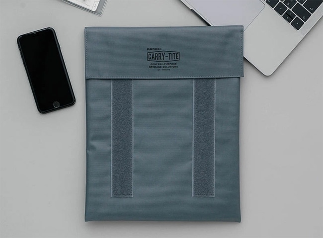 丈夫なターポリン生地を使った収納ケース「キャリータイト」です。 CARRY=運ぶ、TITE=「格好いいクールな」という意味とTIGHT(締める)にかけています。ターポリンはもともとテントなどに使われる素材で、汚れや水濡れにも強く、シーンを問わずタフにお使いいただけます。