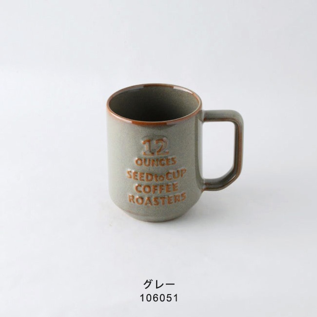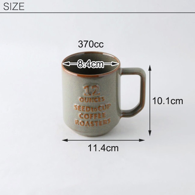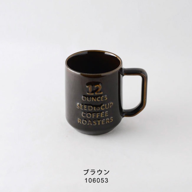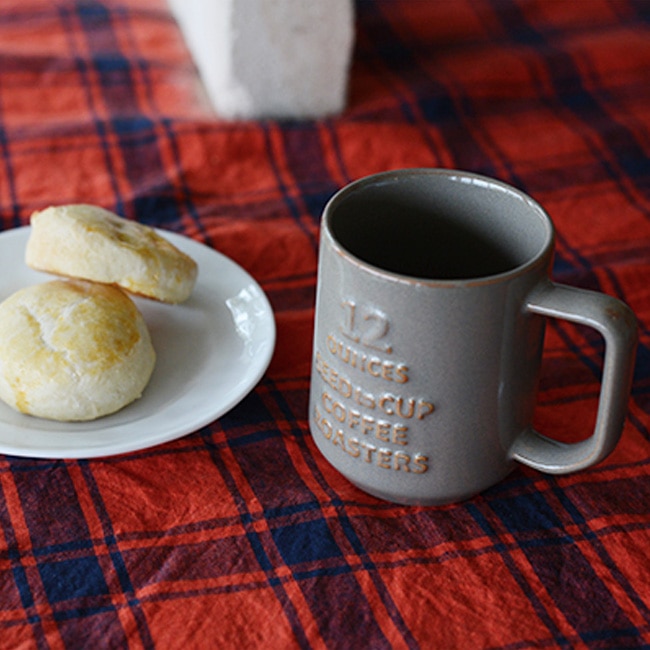 落ち着いた渋めの色展開とヴィンテージを意識したエンボスデザインのロゴが魅力的。淹れたてのコーヒーを連想するワードが書かれています。四角い大きなハンドルが持ちやすいマグのLサイズは、370ccと容量も大きくたっぷり入ります。