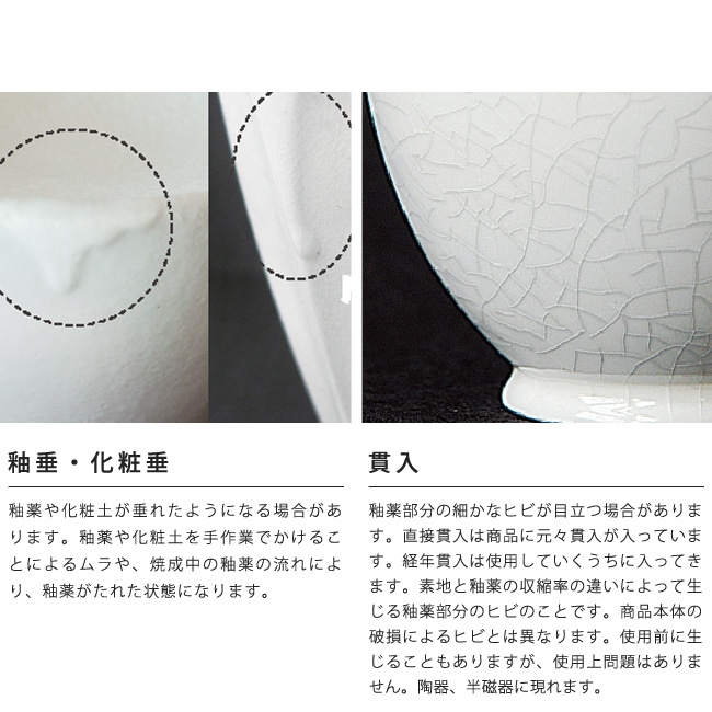 ※殆どの陶磁器は水分を吸収します。表面上乾いた様に見えても、器の中には水分が残っている場合がございます。カビや匂いの発生の原因となるため食洗機使用後は速やかに取り出し、外気に触れる場所での十分な乾燥をするようにお願い致します。