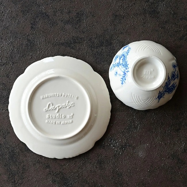 絵柄は銅版転写の技法を用いていて、柄が印刷された和紙を手作業でうつわに貼り付けています。