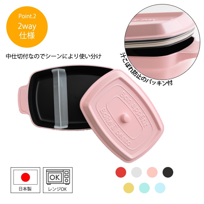 取り外し可能な仕切りが1つ付いているのでご飯とおかずを分けて詰められます。 蓋はパッキンが付いています。