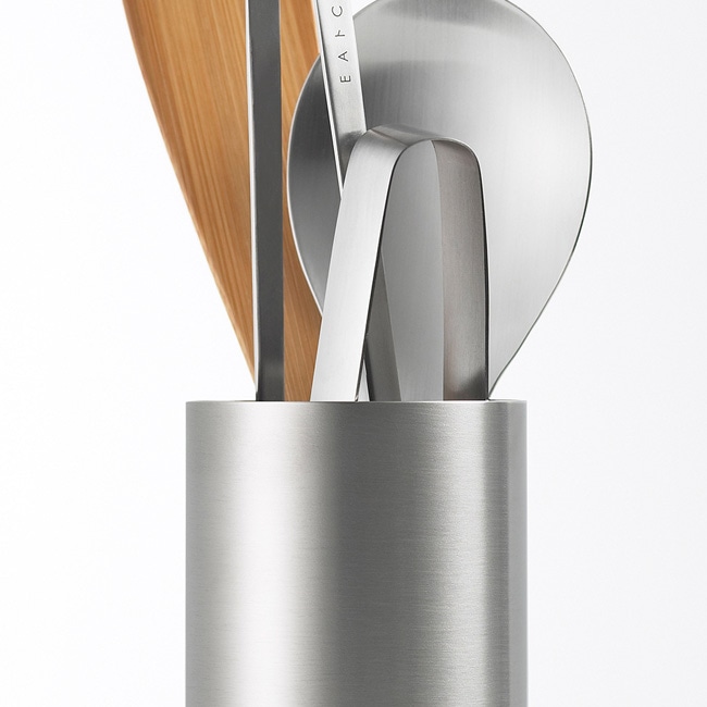 キッチンツールをコンパクトに収納できるツールコンテナです。特長は、外せる底面です。底面はシリコーンゴム製なので、ツールを出し入れする時の音が気になりにくく、押すだけで外れるのでお手入れが簡単です。底に溜まった汚れも綺麗に洗えます。食器洗い機対応。