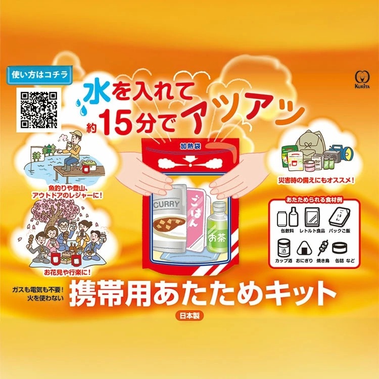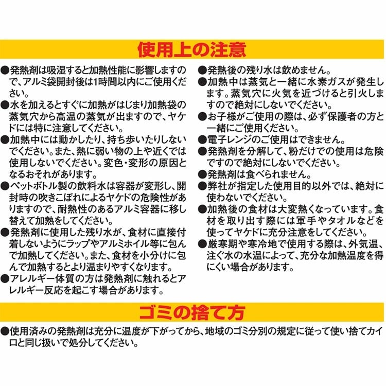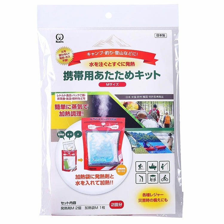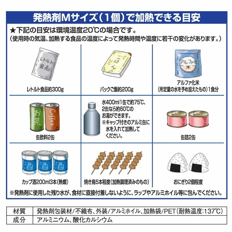 火も電気も使わず、水だけで食材を温められる発熱剤(2回分)です。レトルト食品や缶飲料、缶詰、おにぎりなどを手軽に温めることができます。