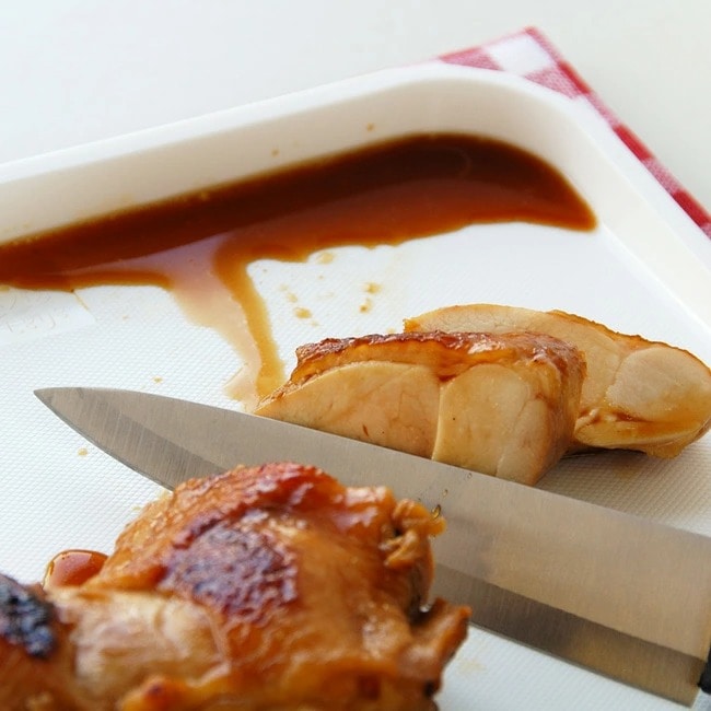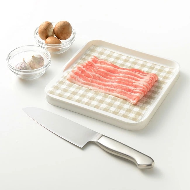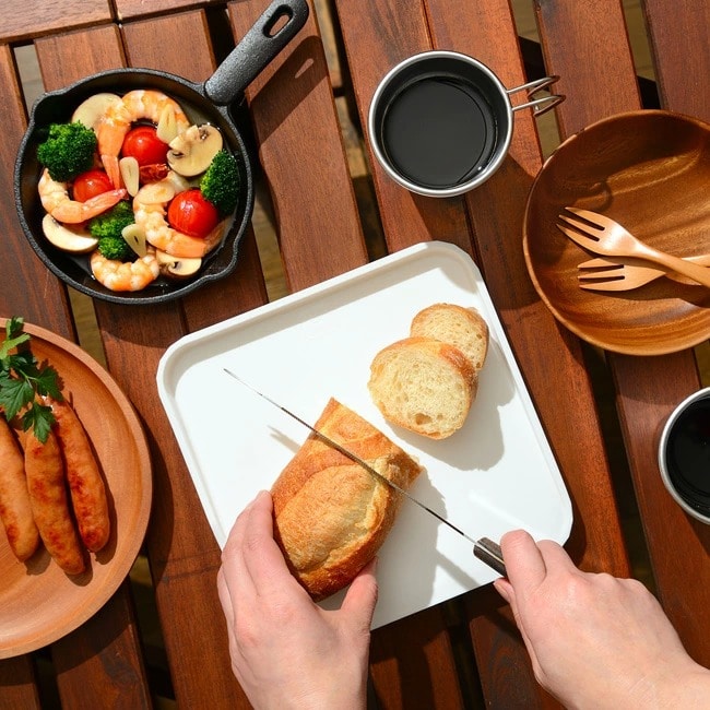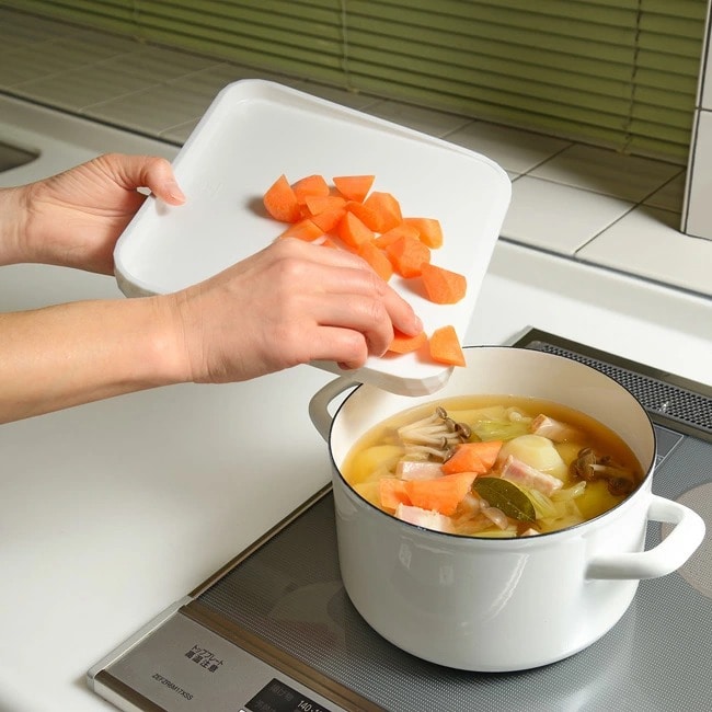 フチが切った食材や汁をキャッチ。調理スペースの汚れを気にすることなく、調理がはかどります。