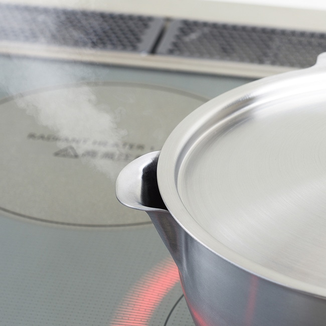 蓋は鍋のラインに添わせた形状です。スライドさせて、注ぎ口を開けることで蒸気を逃がし、吹きこぼれを防止します。